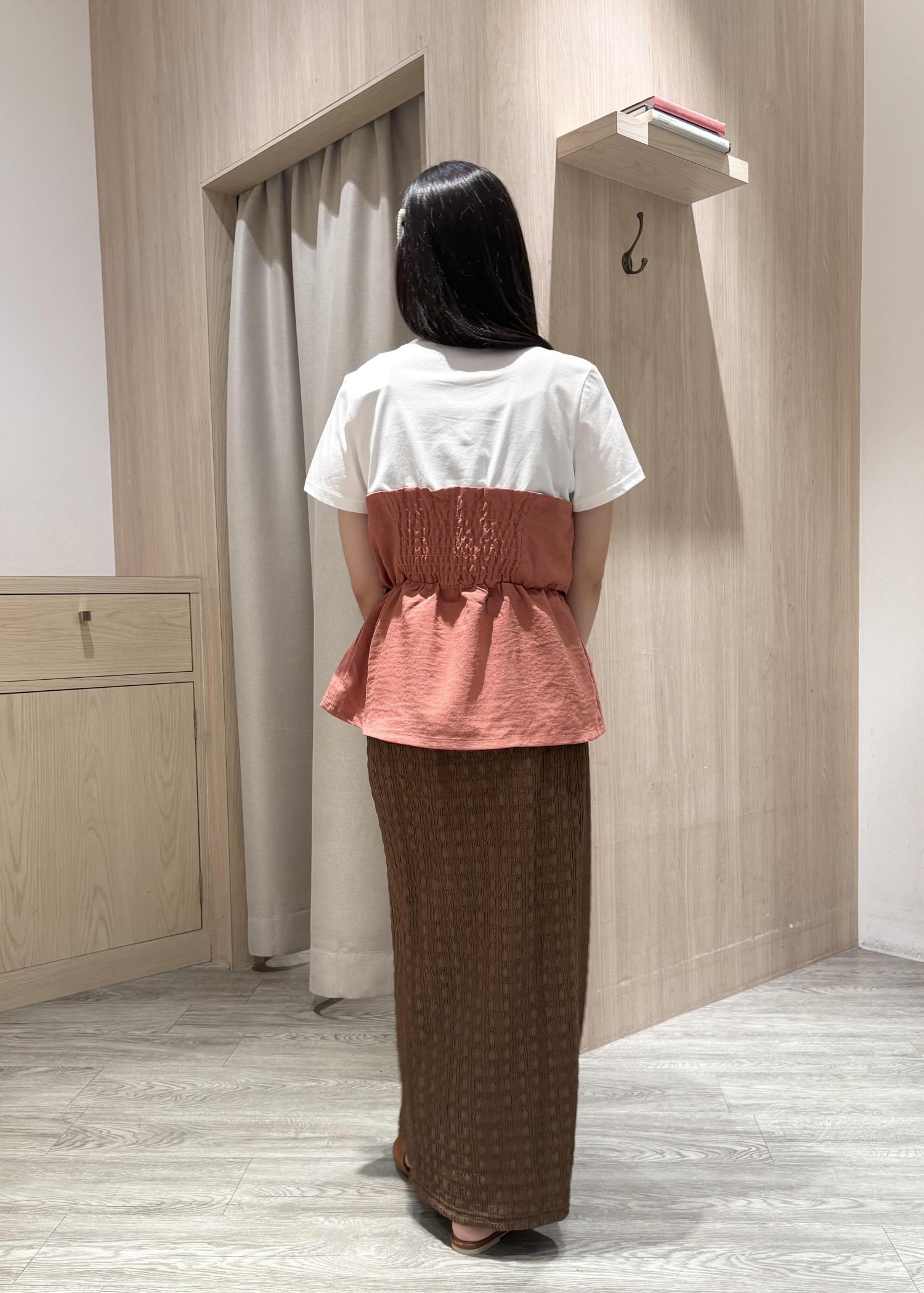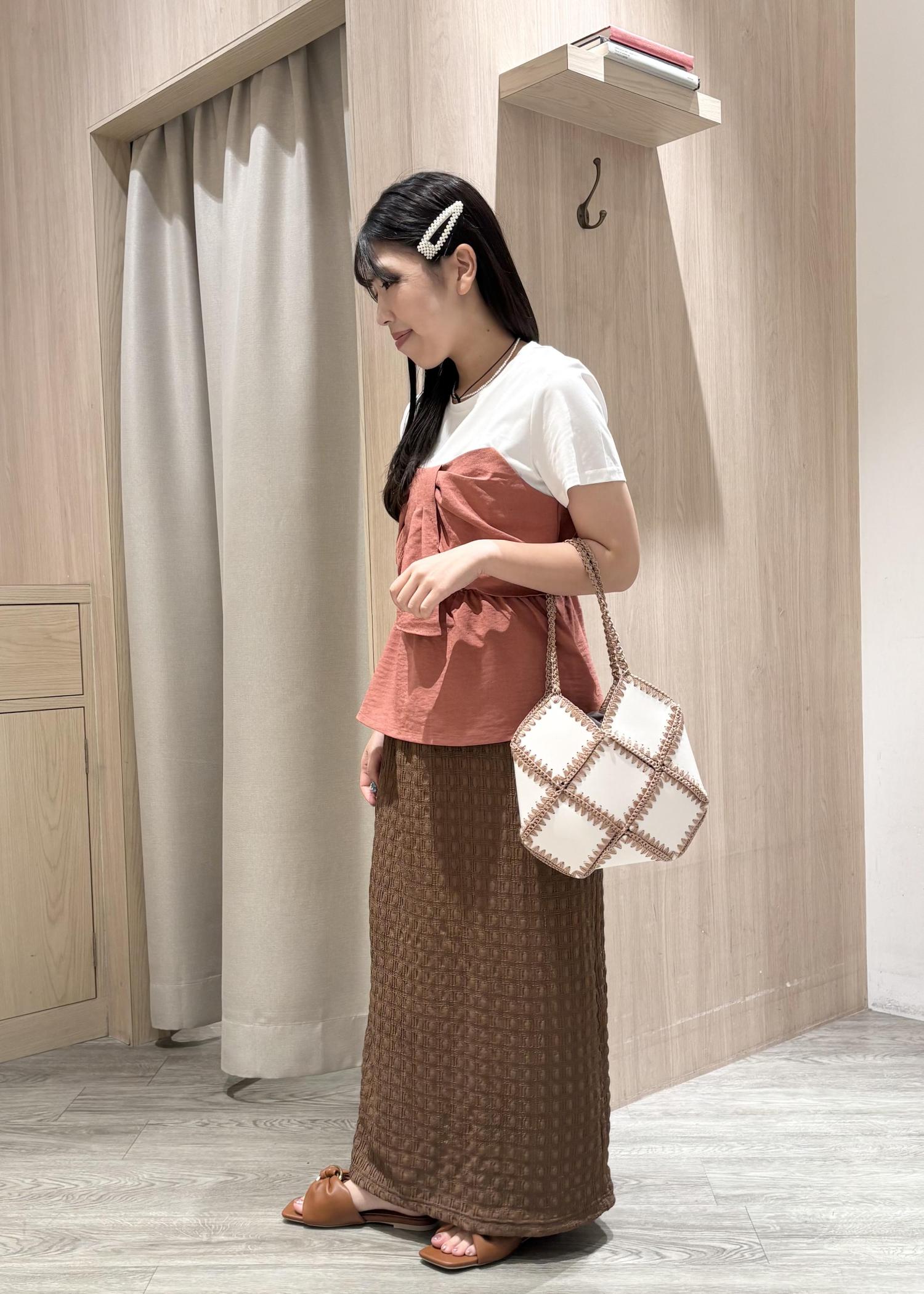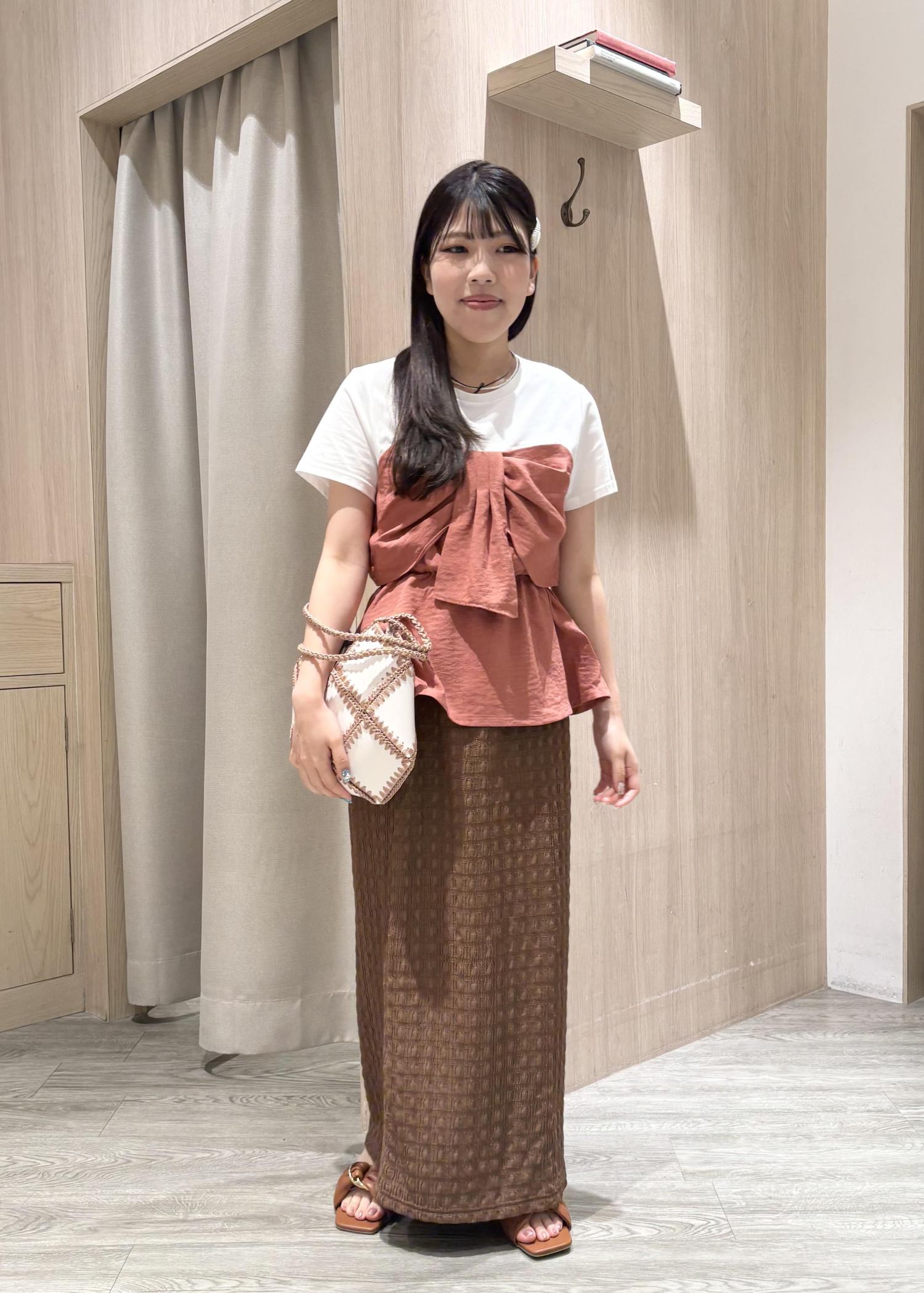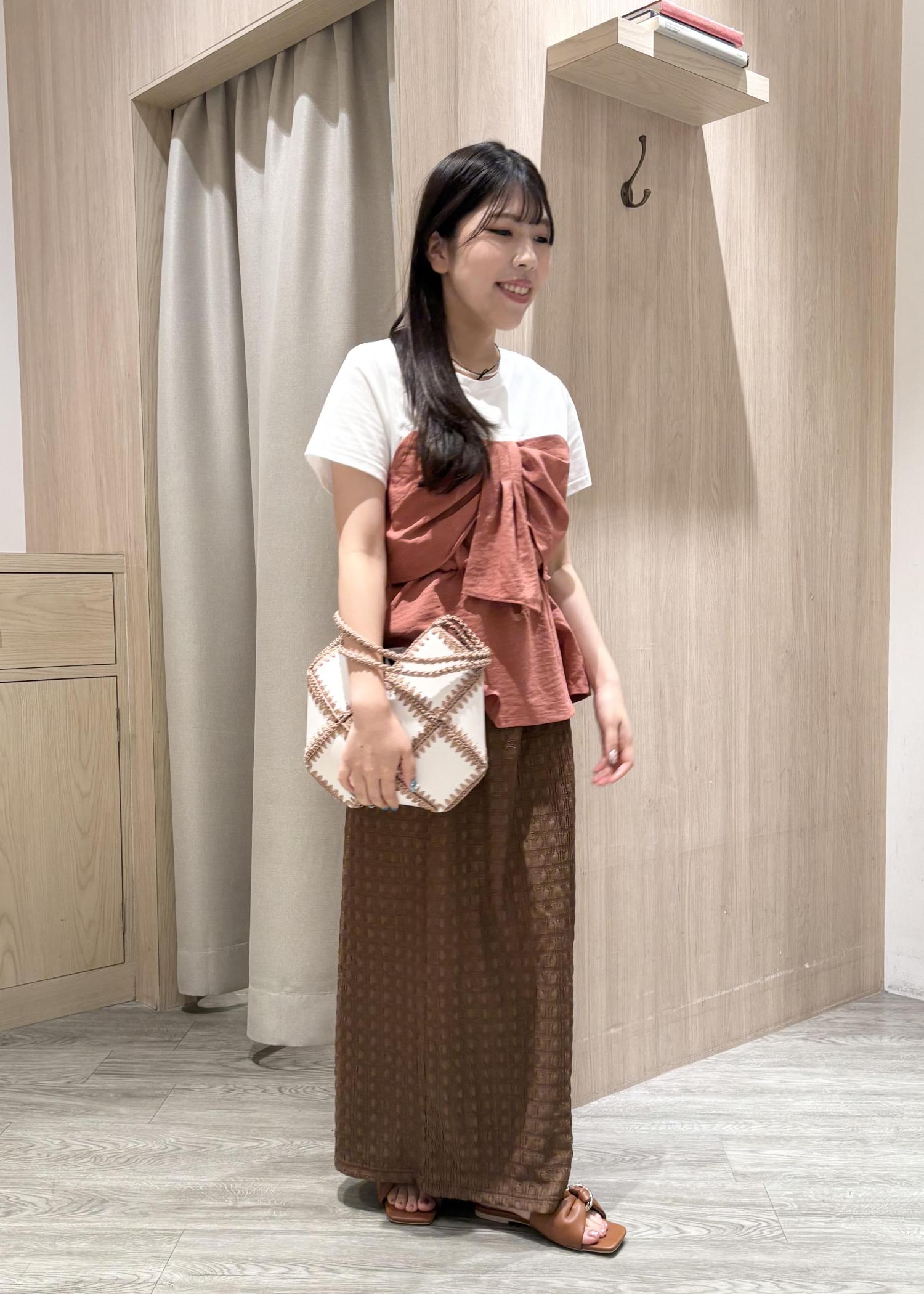 ボトムや小物をブラウンで合わせて、トップスのオレンジが映えるようにしました♡