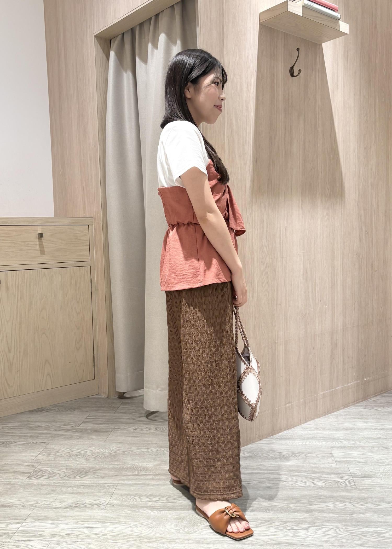 身長152センチが着用すると丈はウエスト下で穿くと床につきそうな長さですが、ハイウエストで着用すると丁度良い長さになります。柔らかい生地が気持ちいいです。