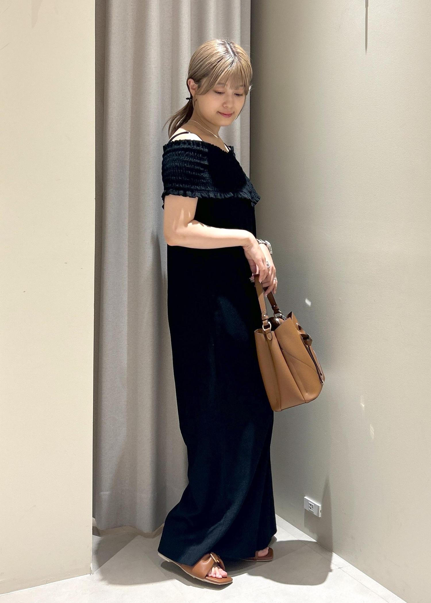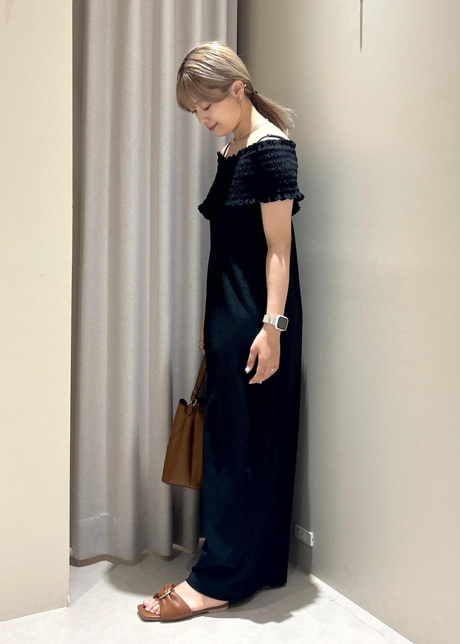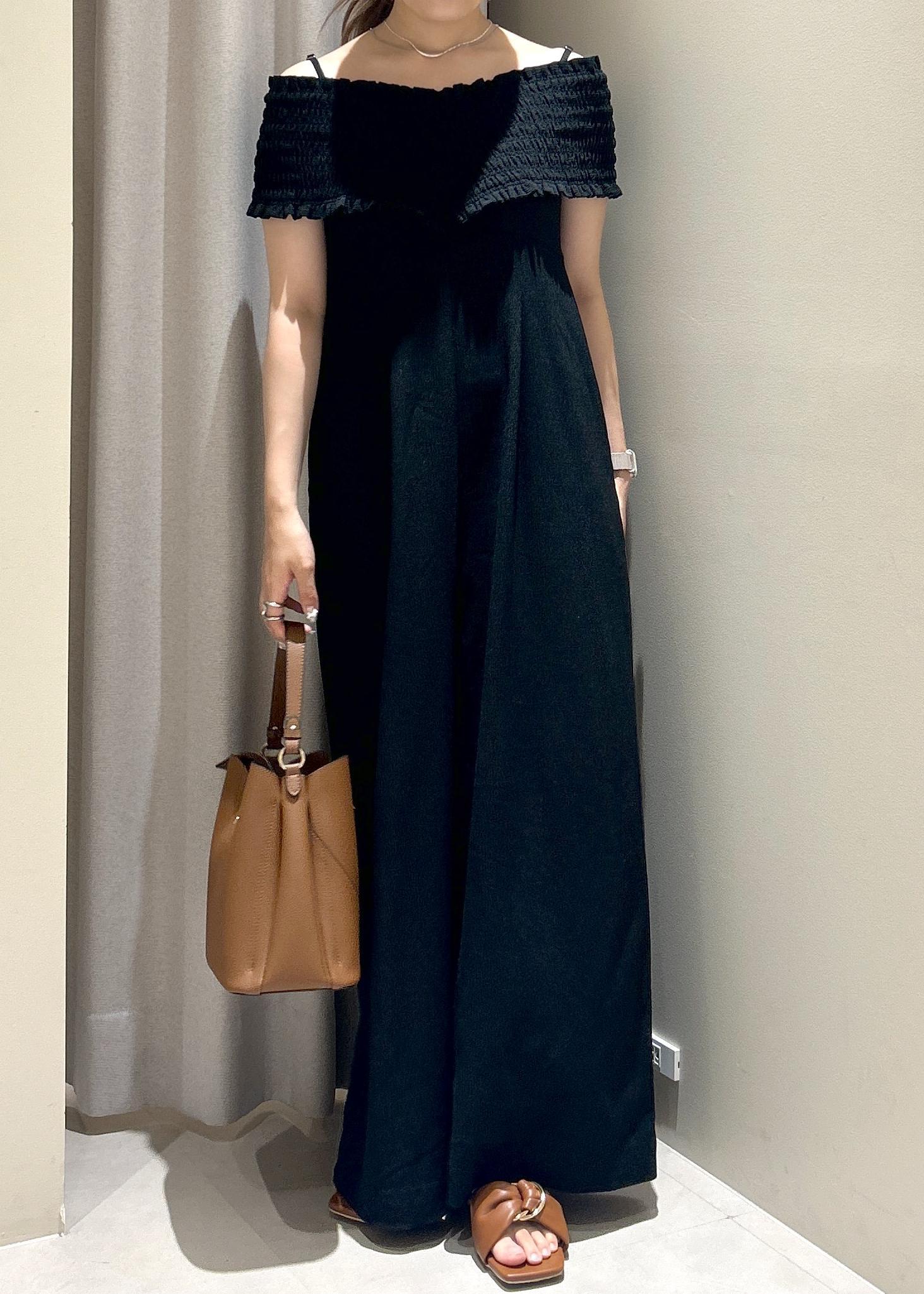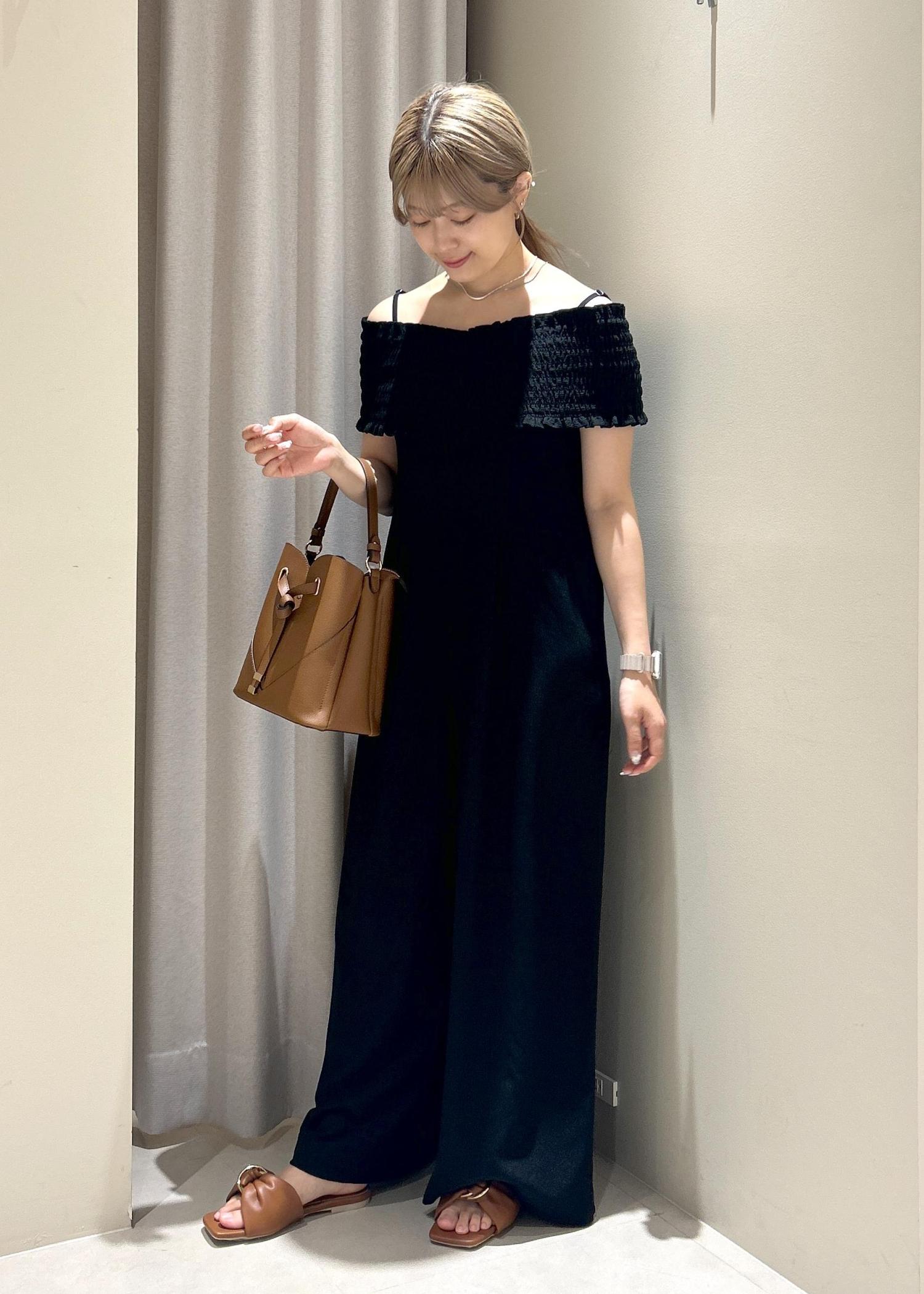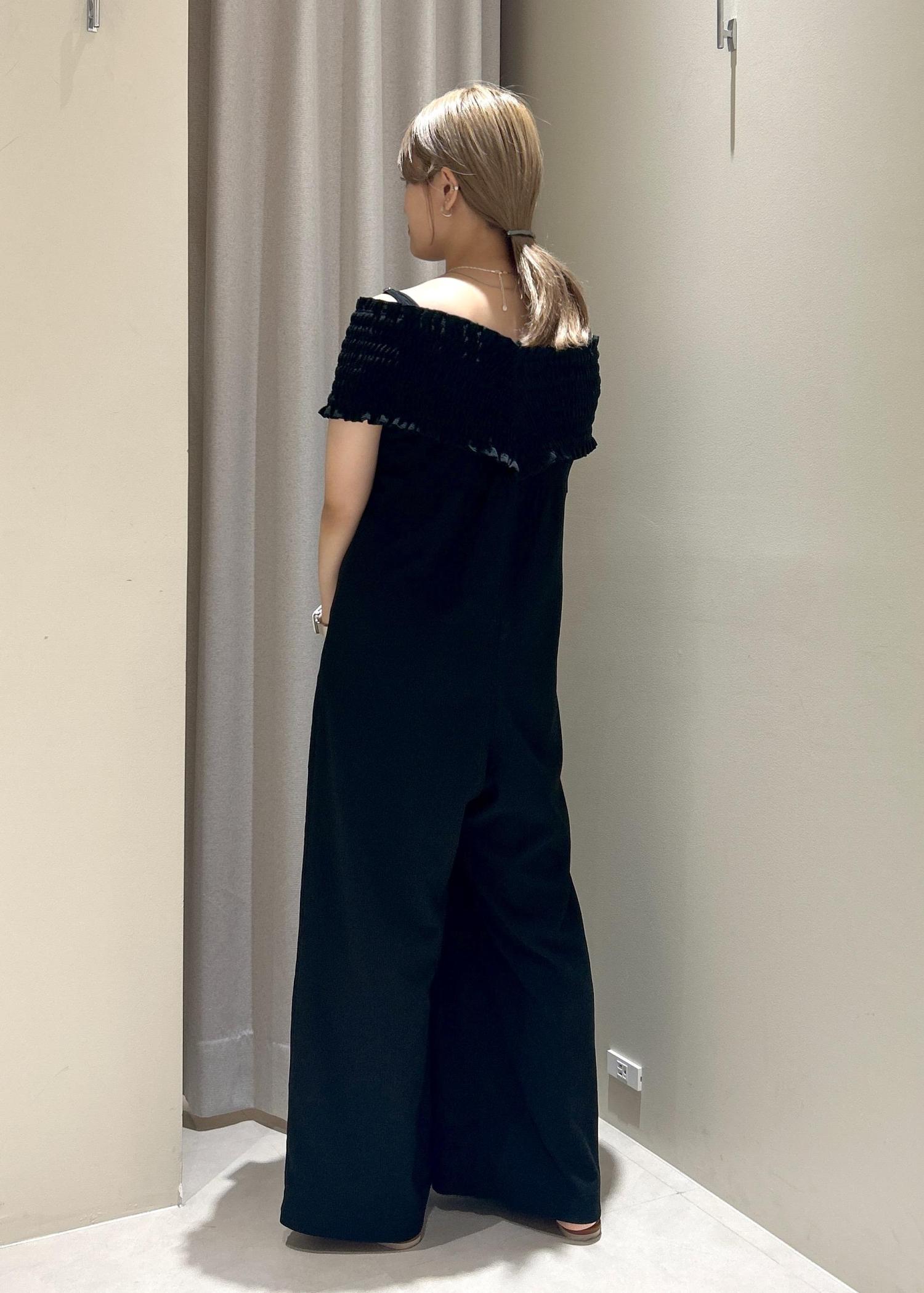アウトレットVISシャーリングオフショルダーオールインワンブラック / F¥6,327レビュー154センチ着用で丈感ぴったりでした◎