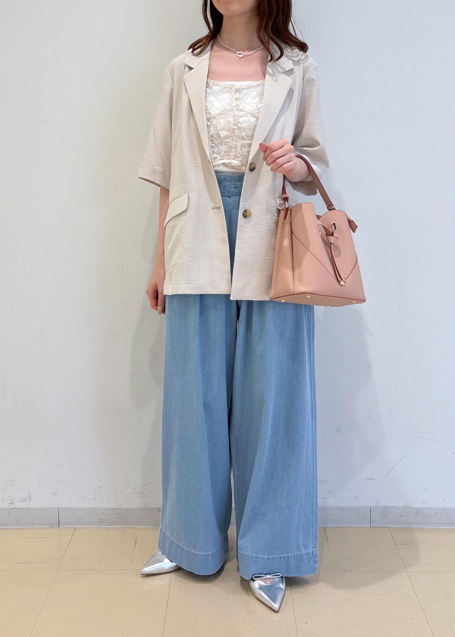 ジャケットの中はカップ付きインナーにレースビスチェを合わせてヘルシーさと華やかさを意識しました。