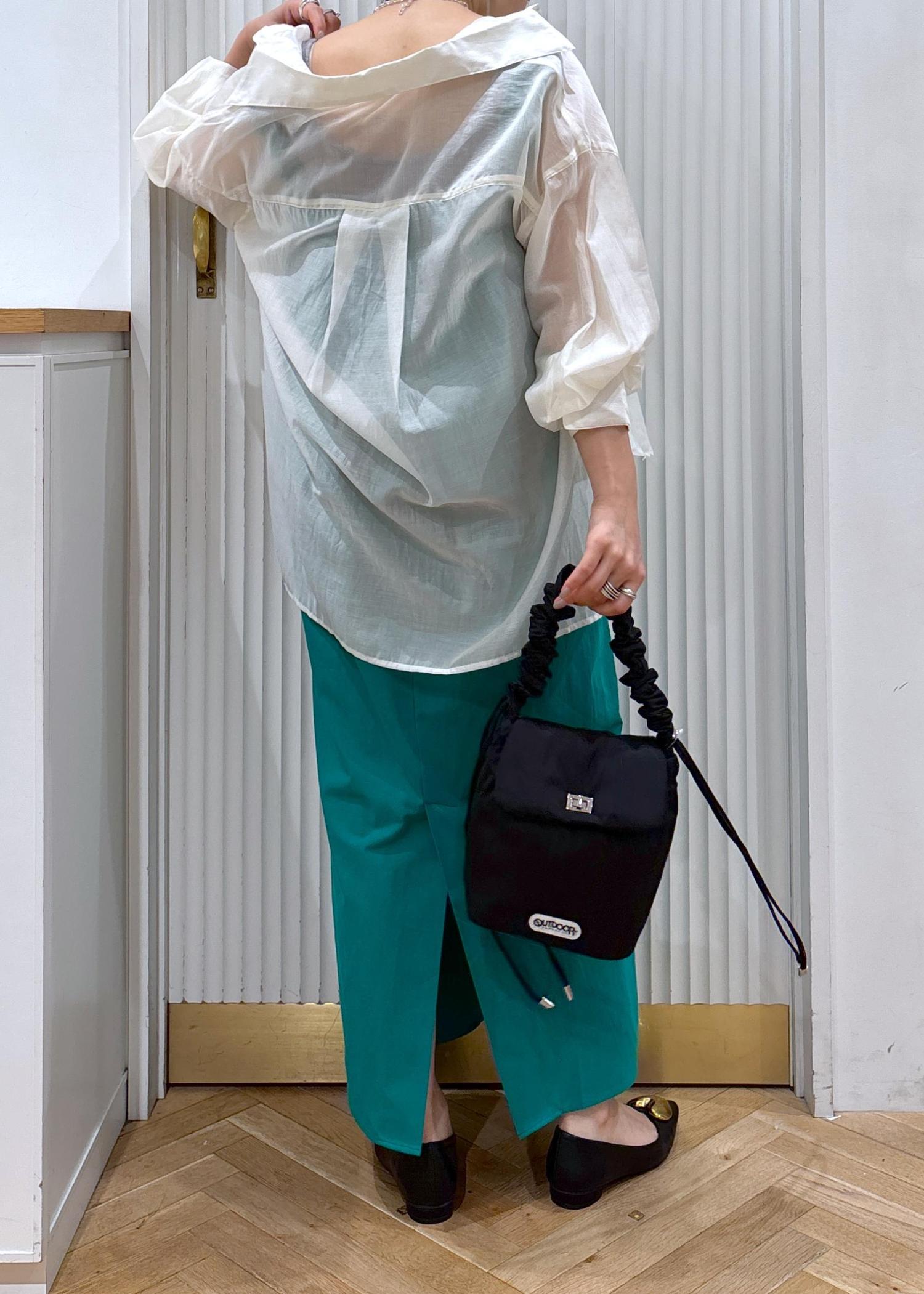 157cm着用だとお尻もすっぽりカバーしてくれる丈感で肌離れが良く、初夏シーズンも羽織りとして丁度良い素材。軽くてサラッとしており、透け感も程よいので大人っぽいコーディネートから綺麗目コーディネートまで幅広く活躍します。 -