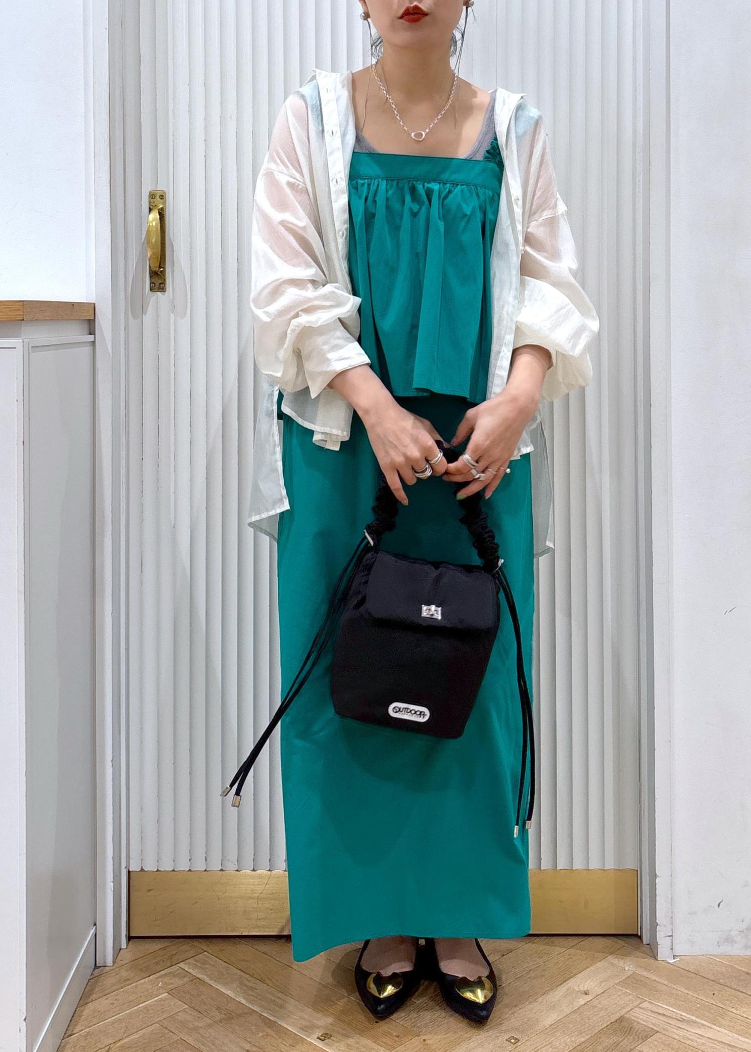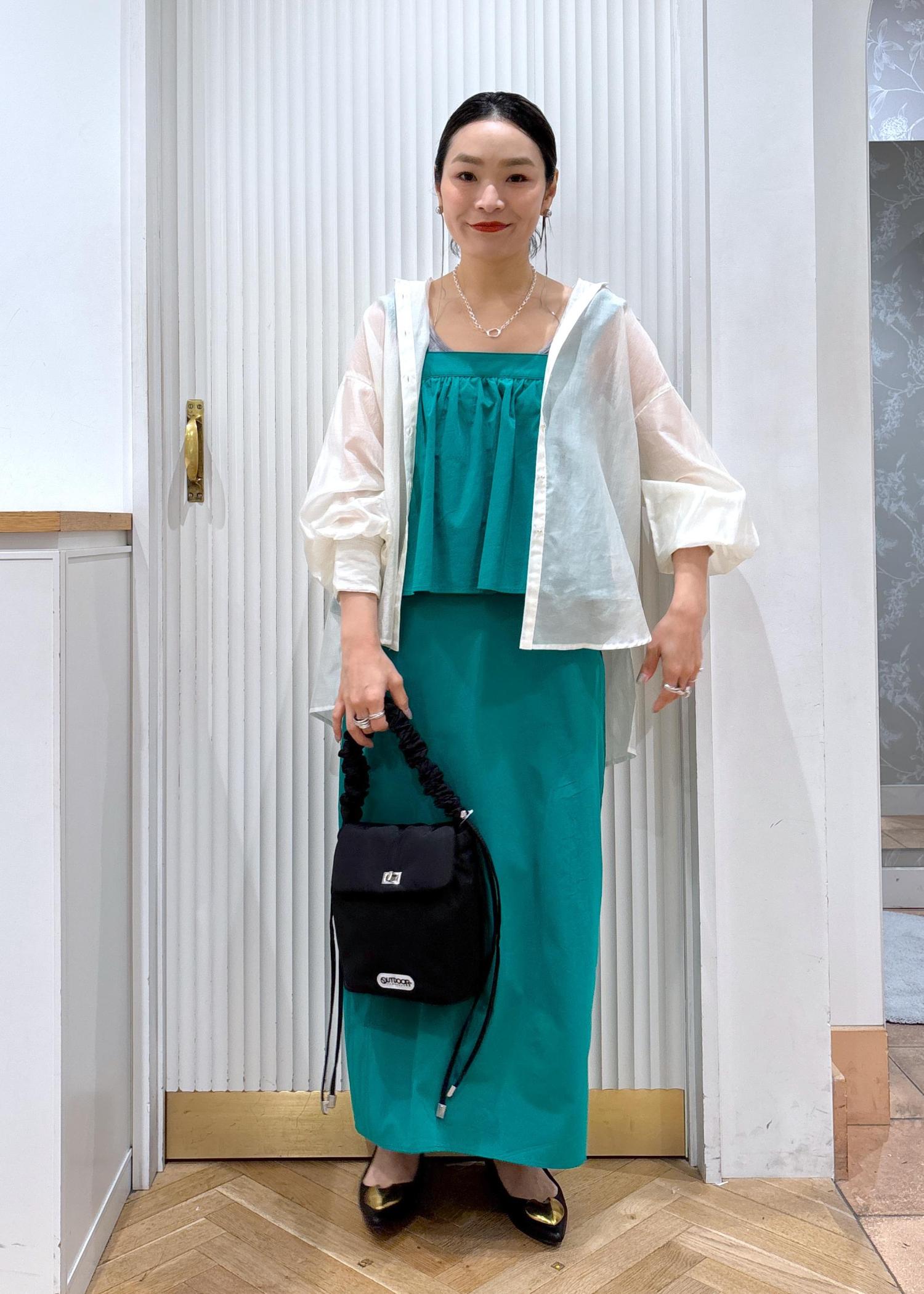 鮮やかなグリーンのワンピース♡肩紐がギャザーで可愛いんです♡Tシャツレイヤードも◎