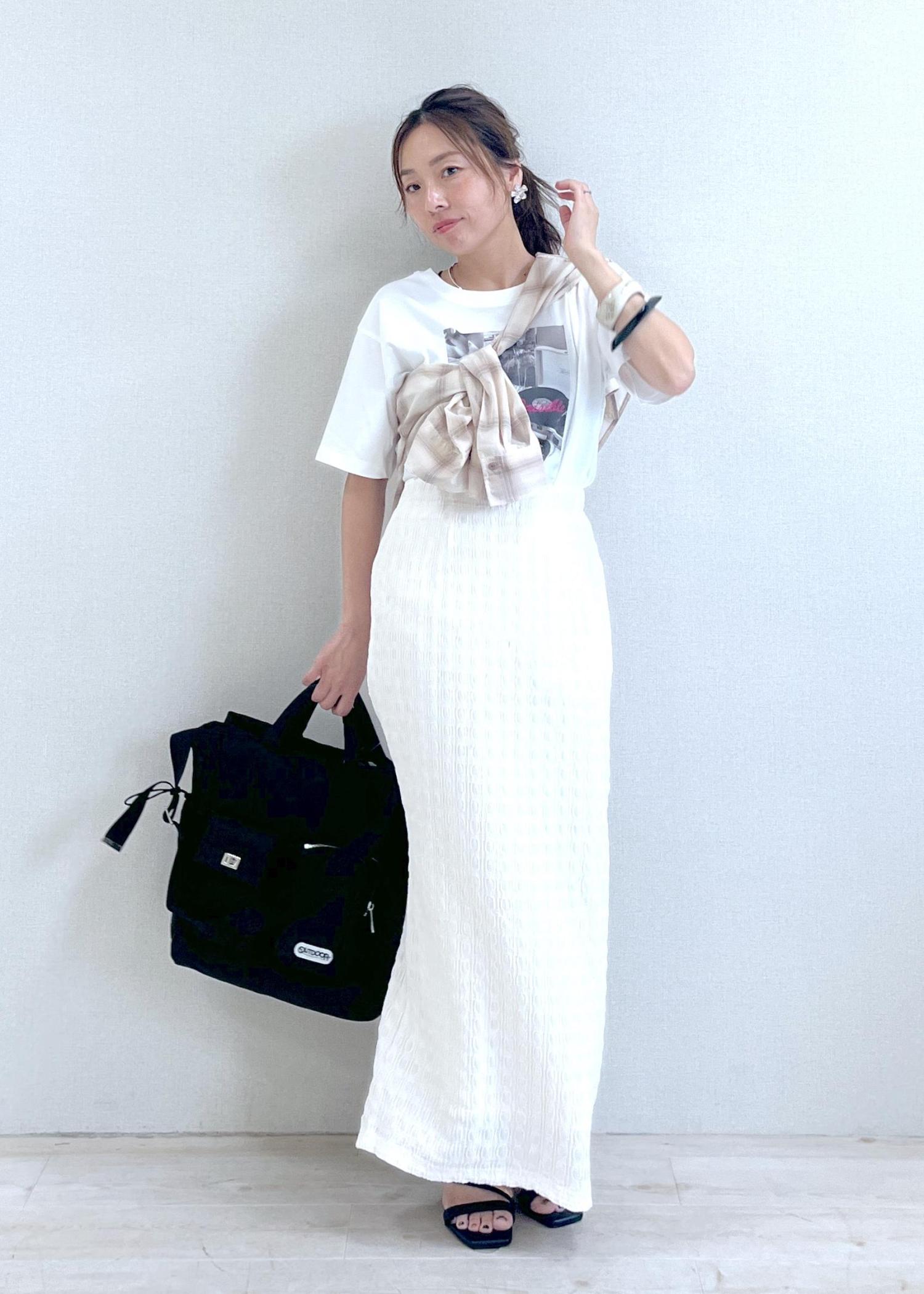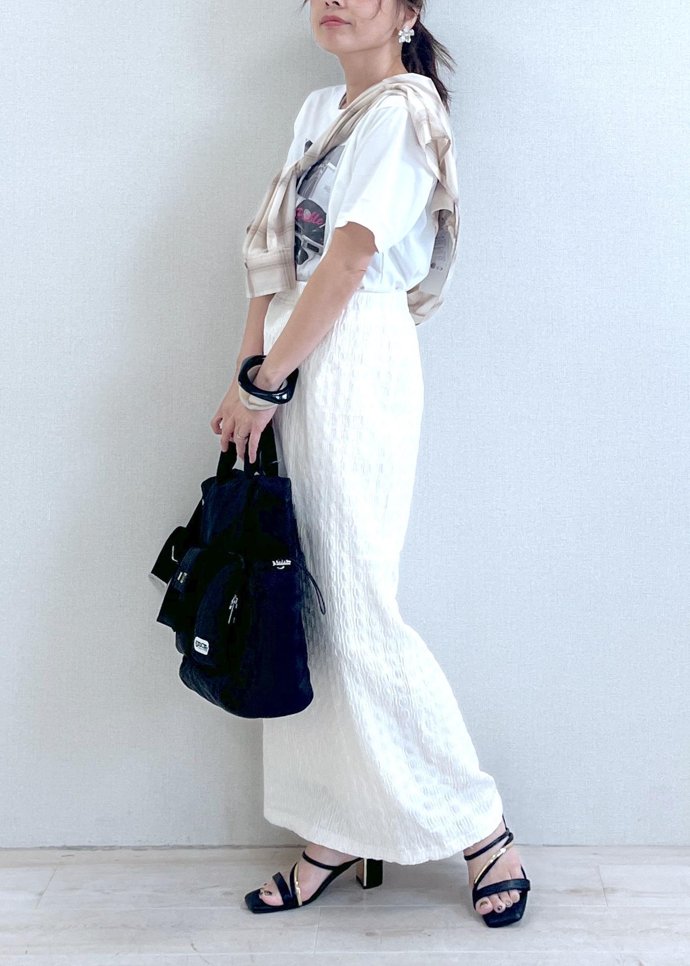 Tシャツ×ロングスカートの定番コンビも、カラーと素材感で一気に洗練。