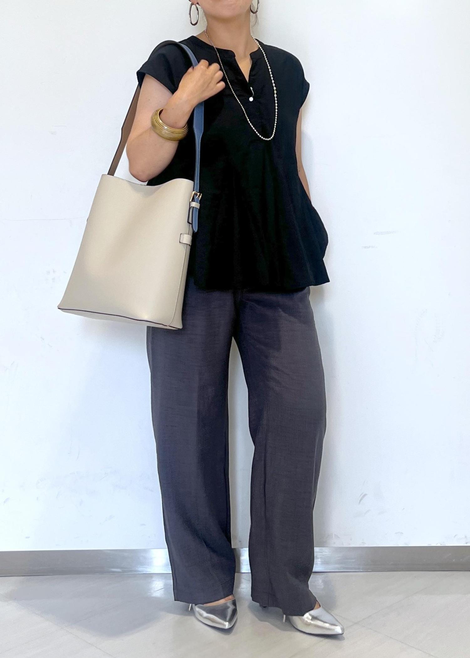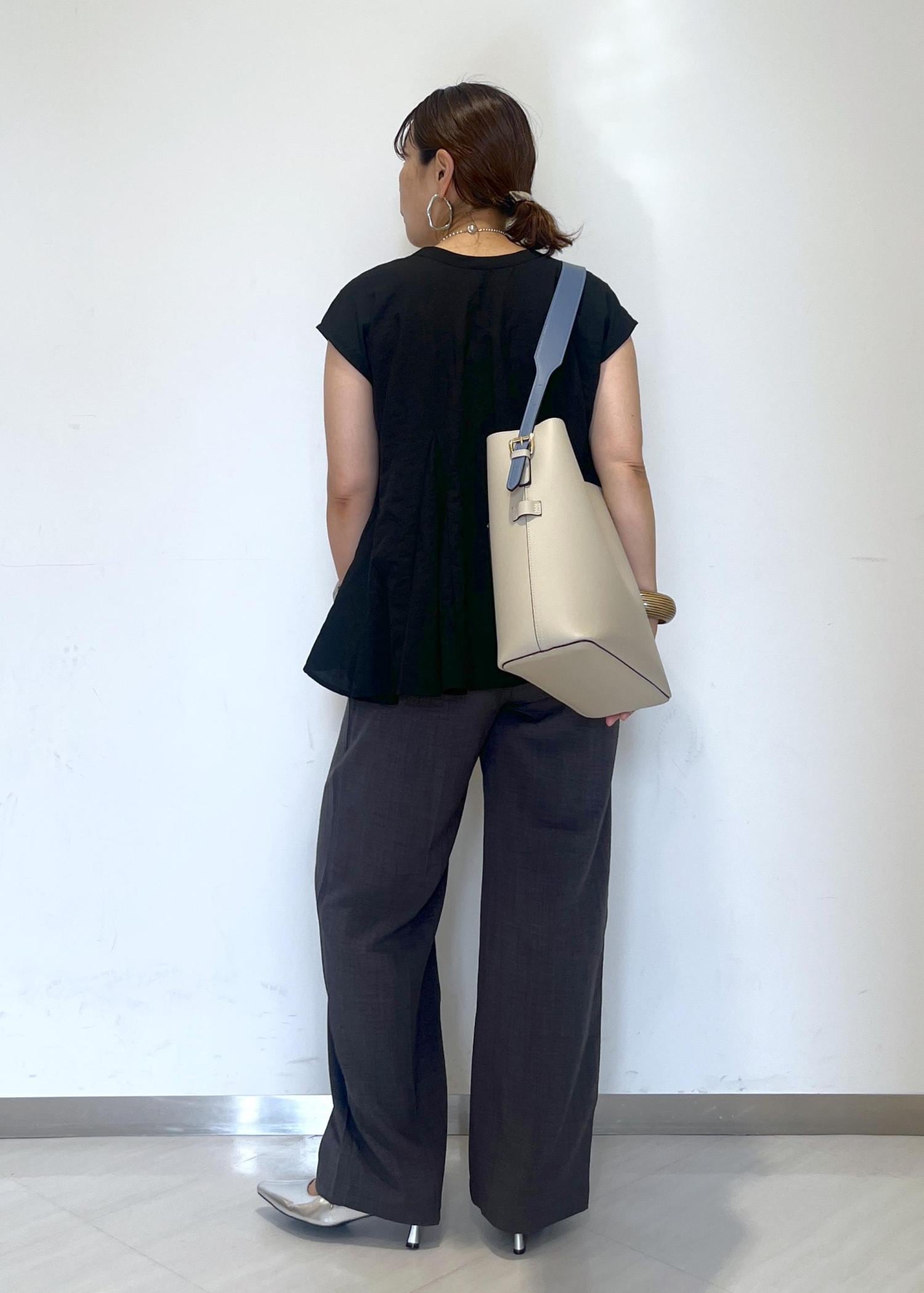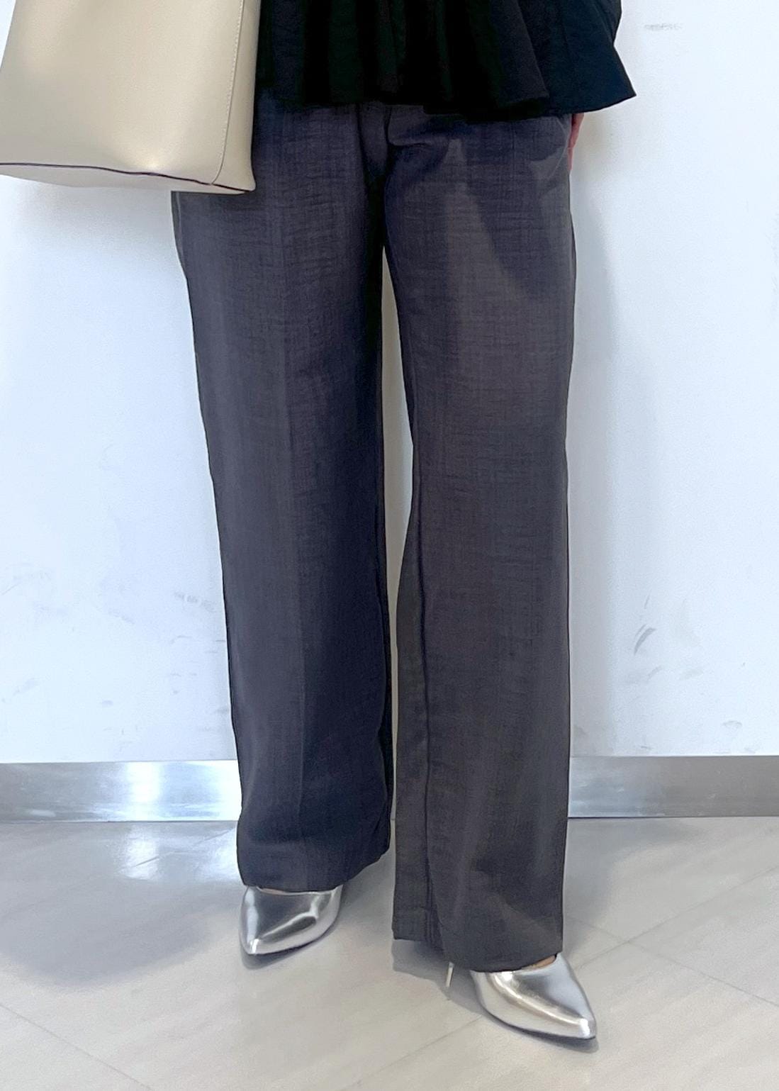 タック入りのワイドパンツで腰回りのラインもカバーして綺麗に着用できます。