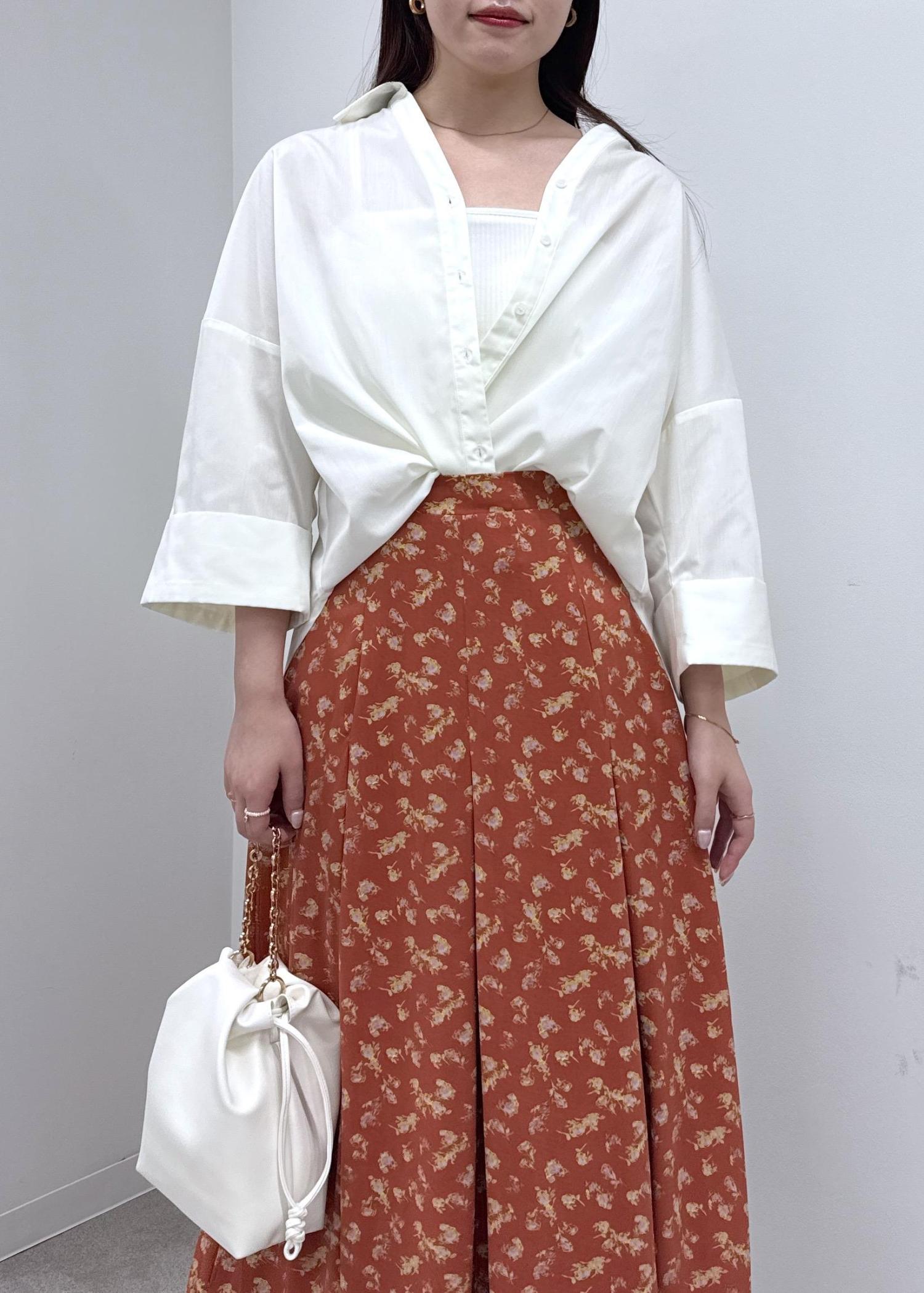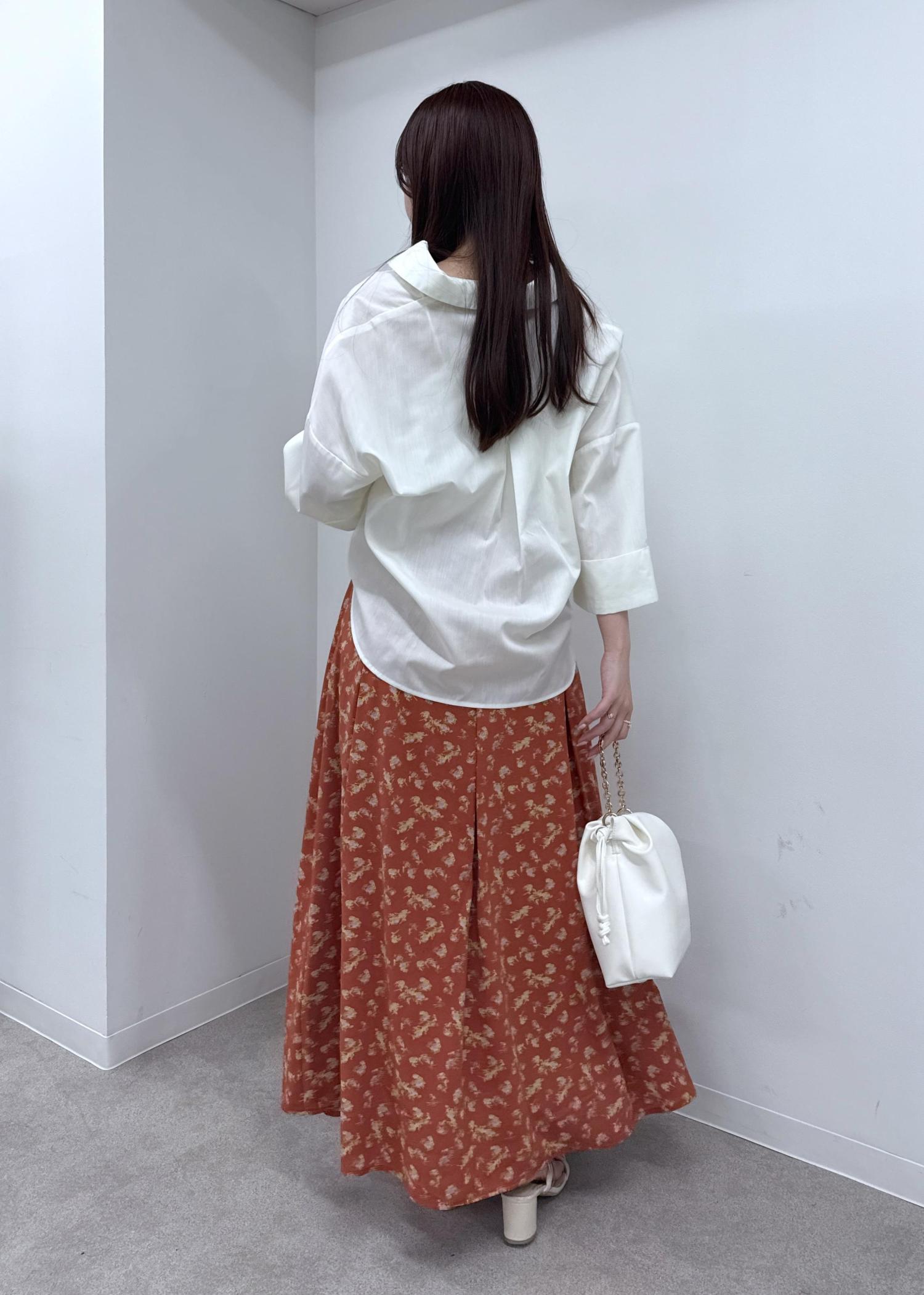 花柄のオレンジ系カラースカートをメインに、シャツブラウスを使ったリゾートにもぴったり大人きれいめフェミニンリゾートコーデ!