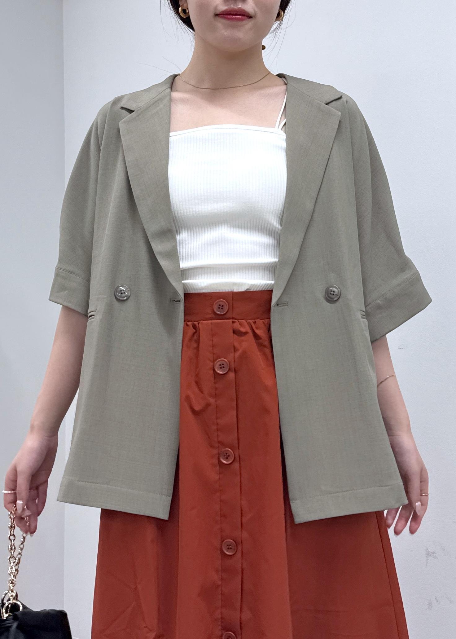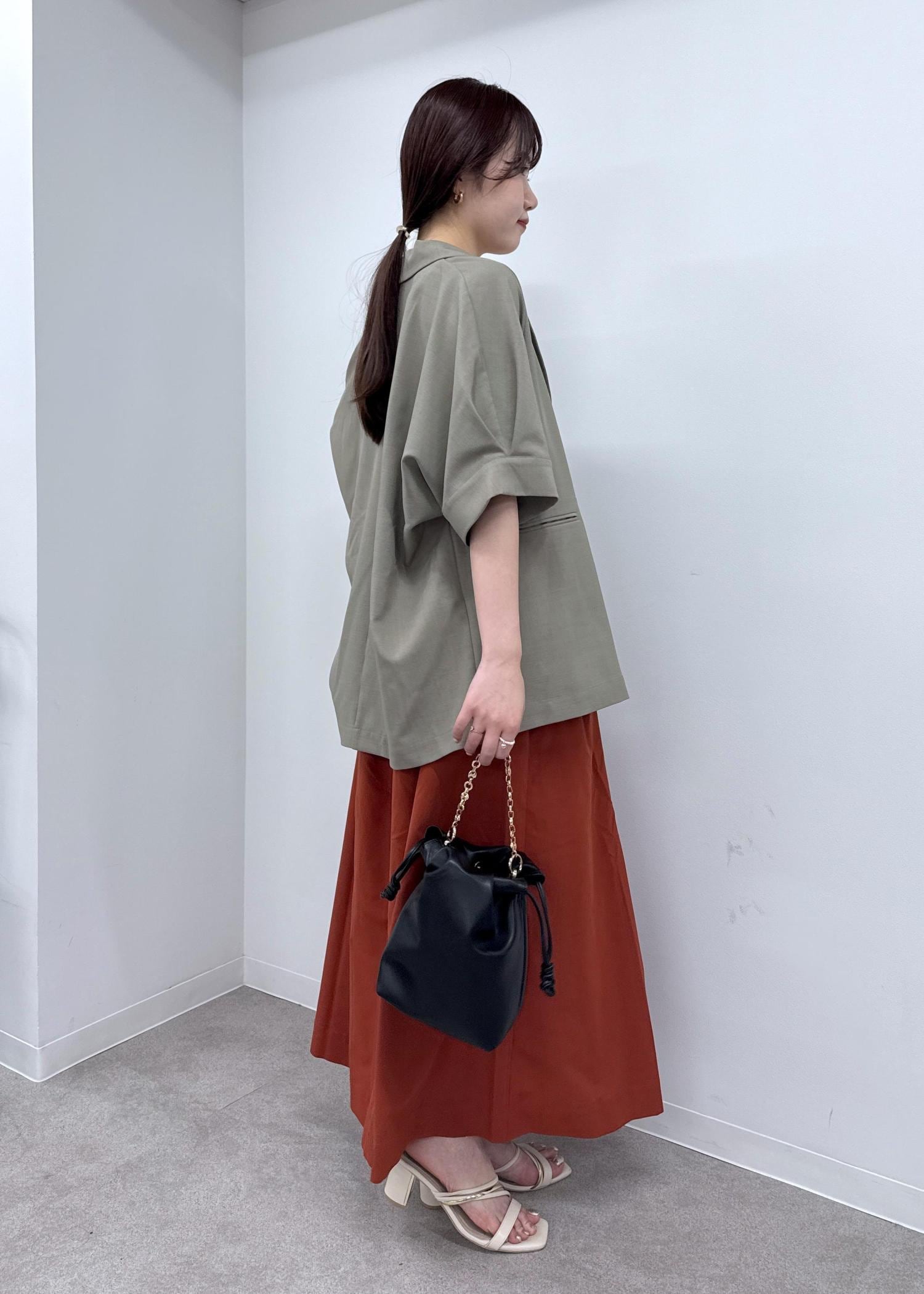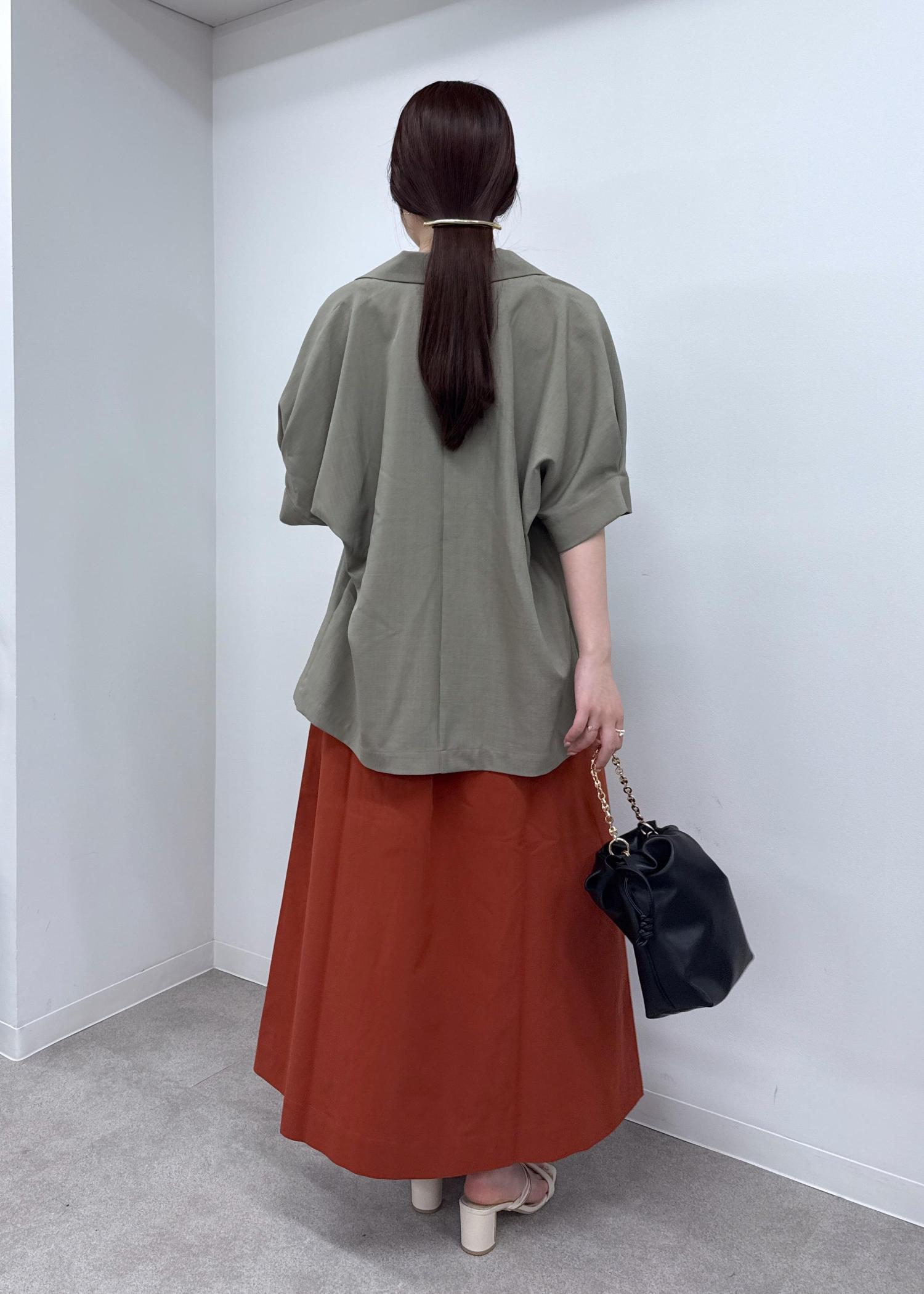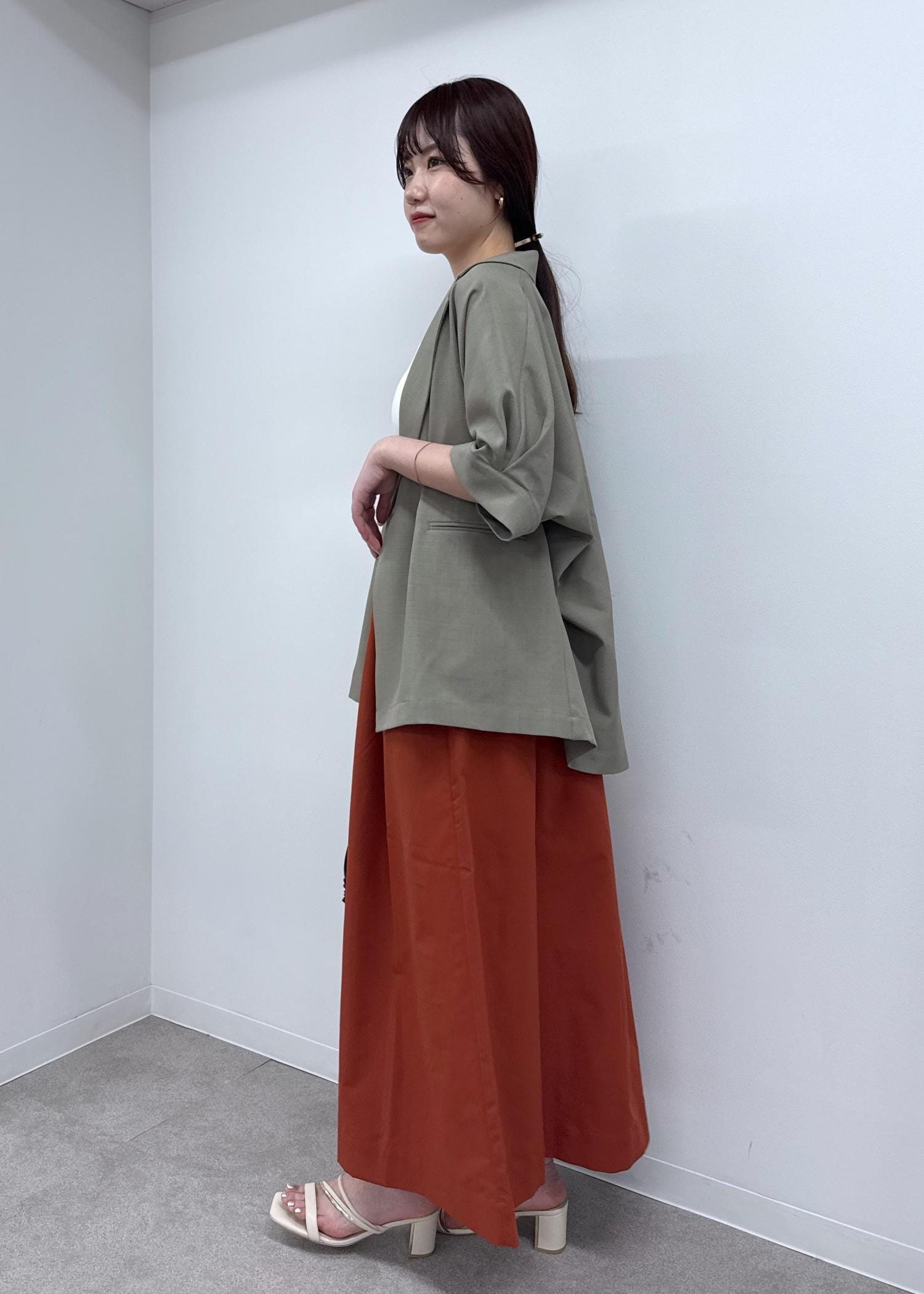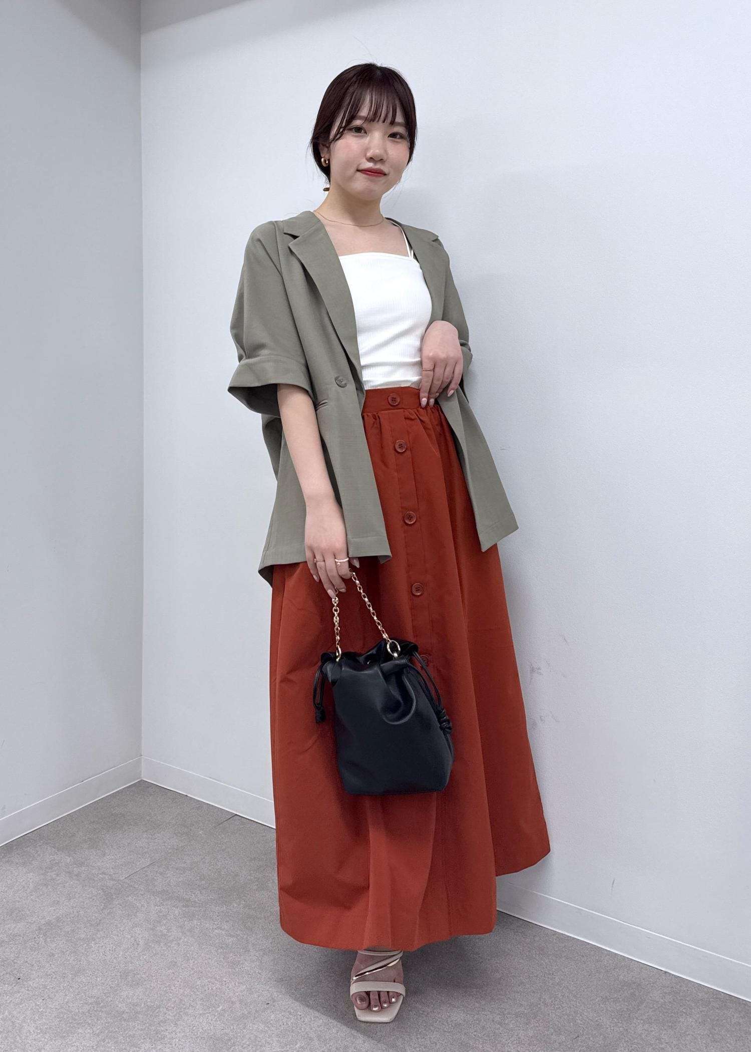 オレンジ系カラースカートをメインに、カーキのジャケットを羽織ることで大人っぽくヘルシーフェミニンな印象に!