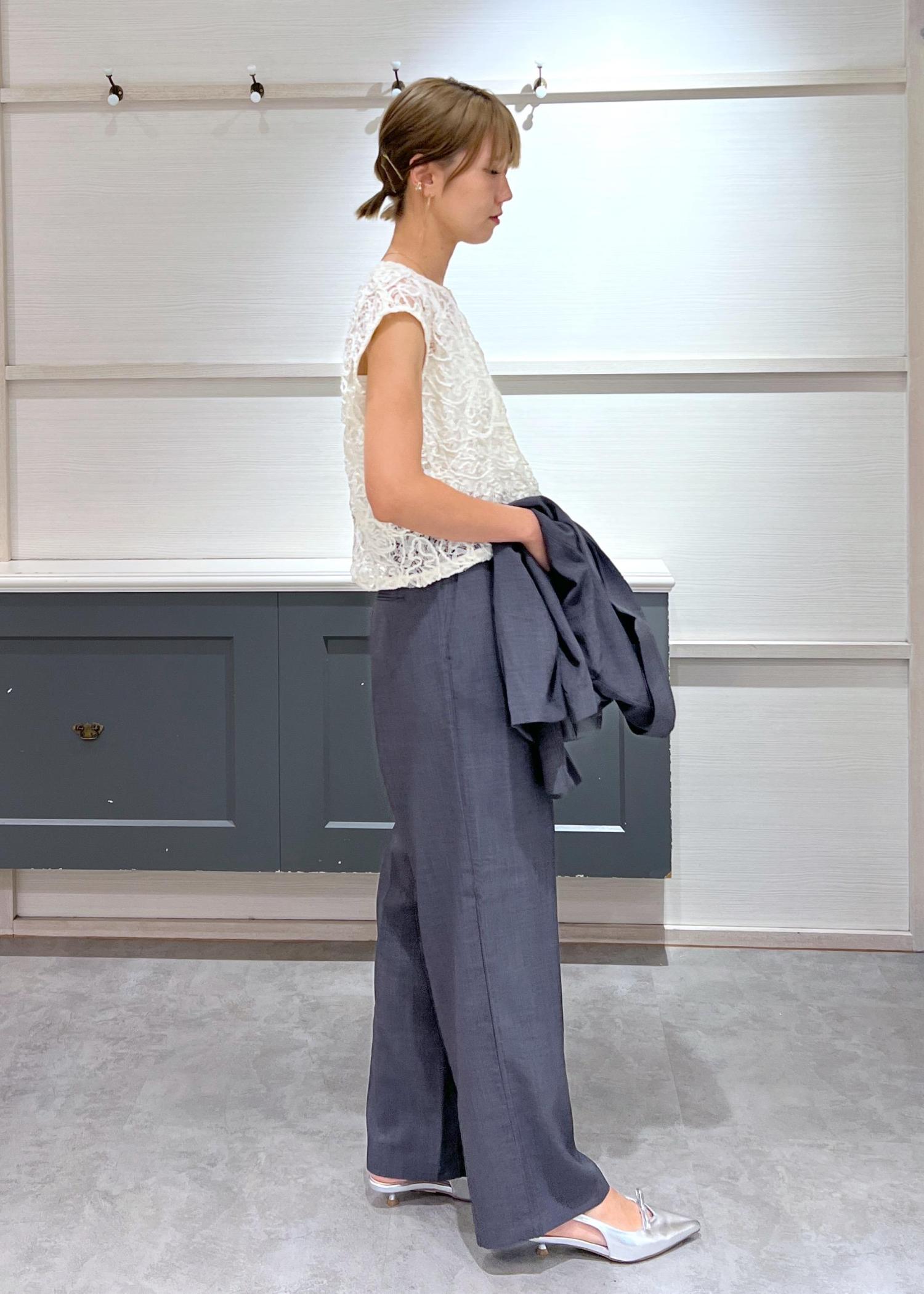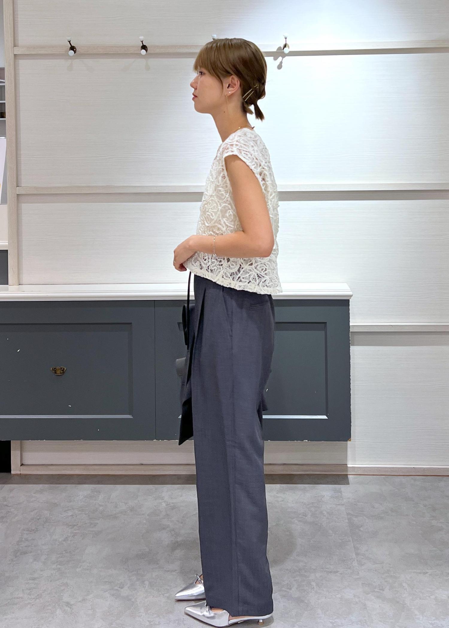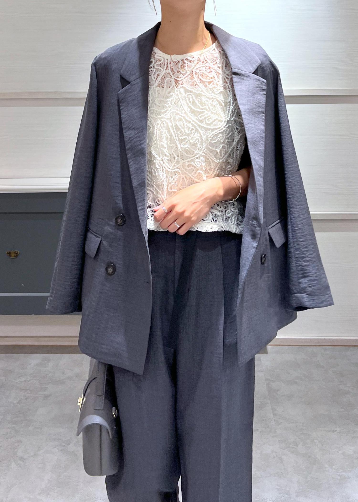 落ち着きのあるチャコールグレーのセットアップに、繊細なレーストップスを合わせて、程よい甘さをプラス。