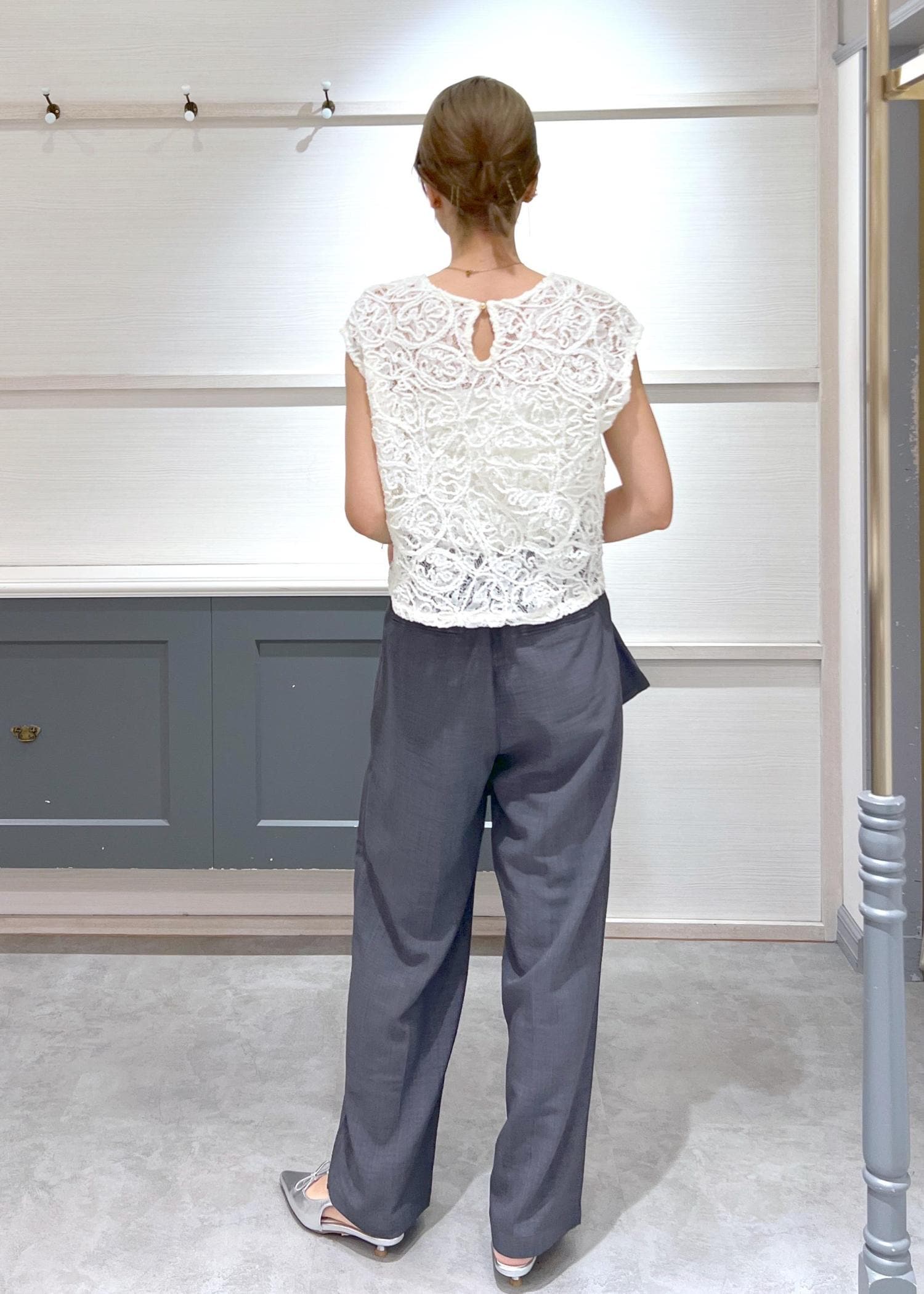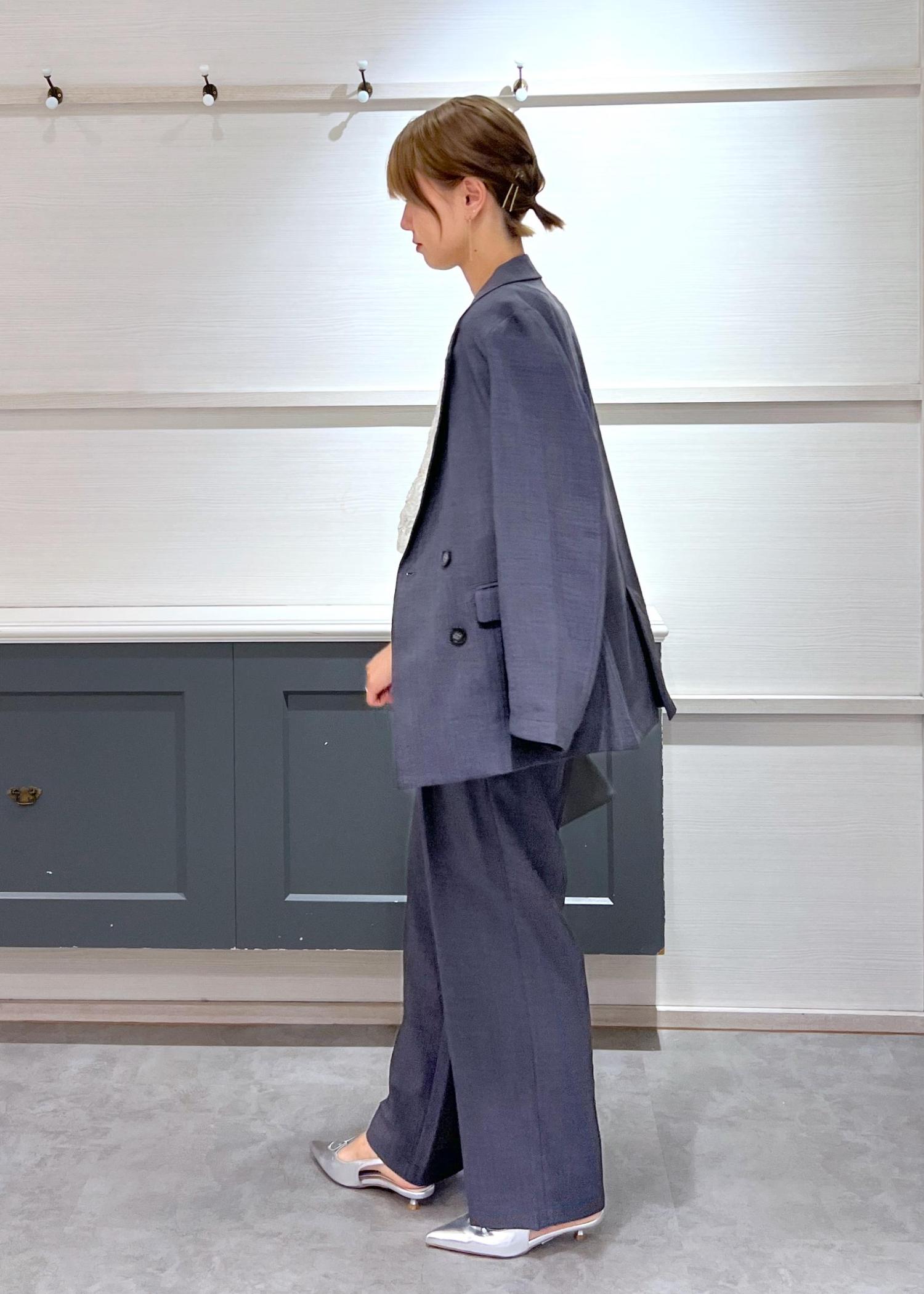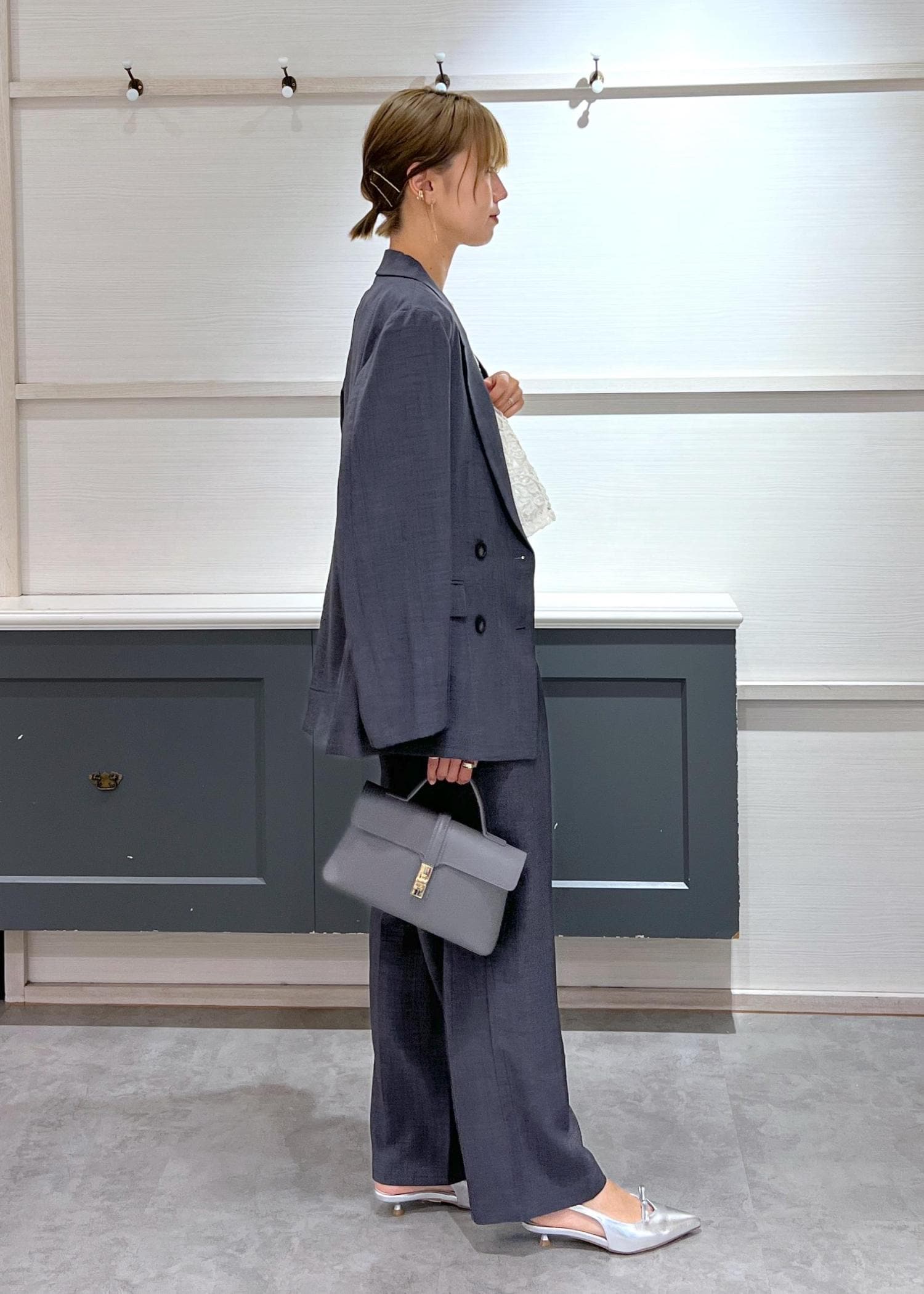 落ち着きのあるチャコールグレーのセットアップに、繊細なレーストップスを合わせて、程よい甘さをプラス。