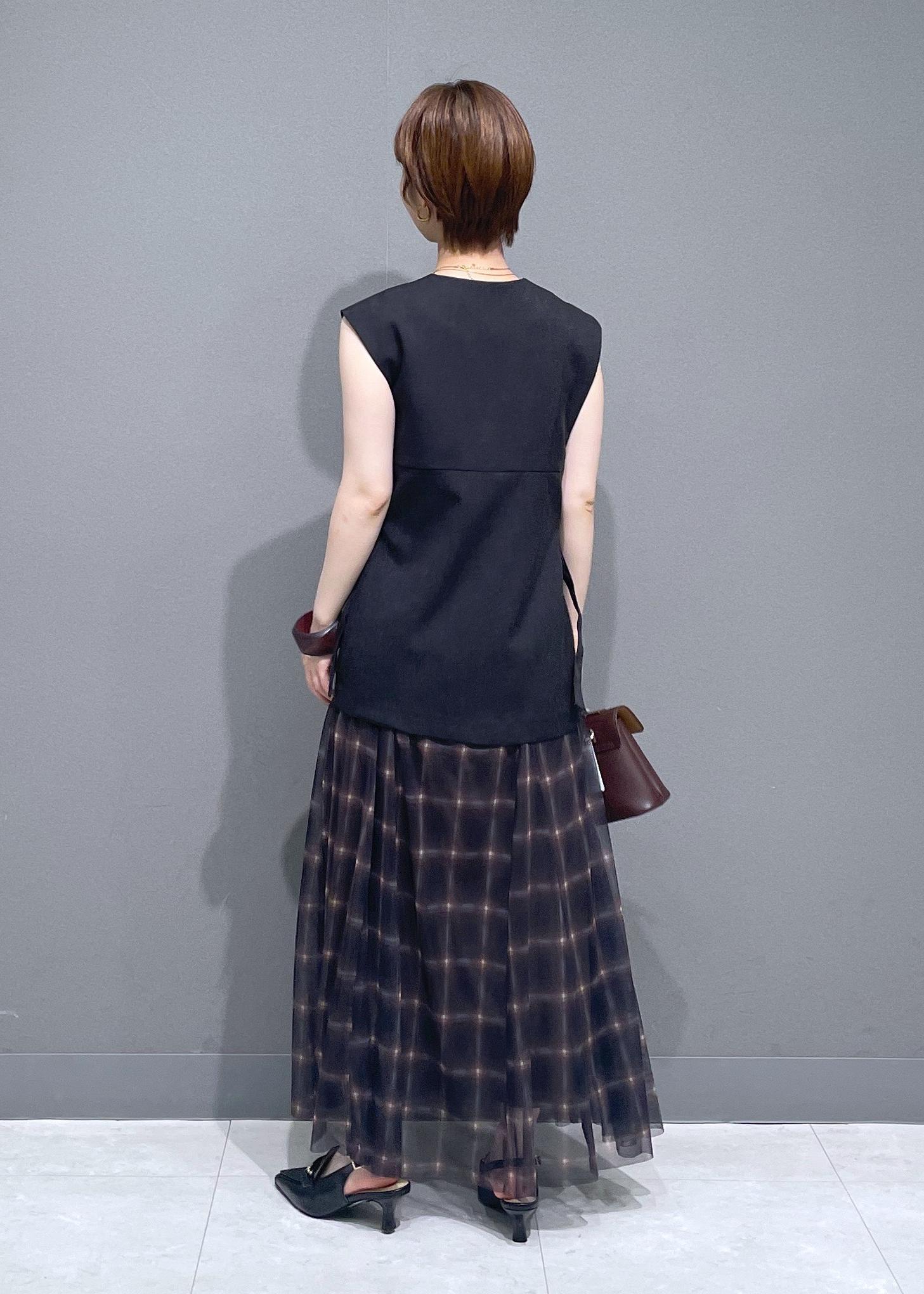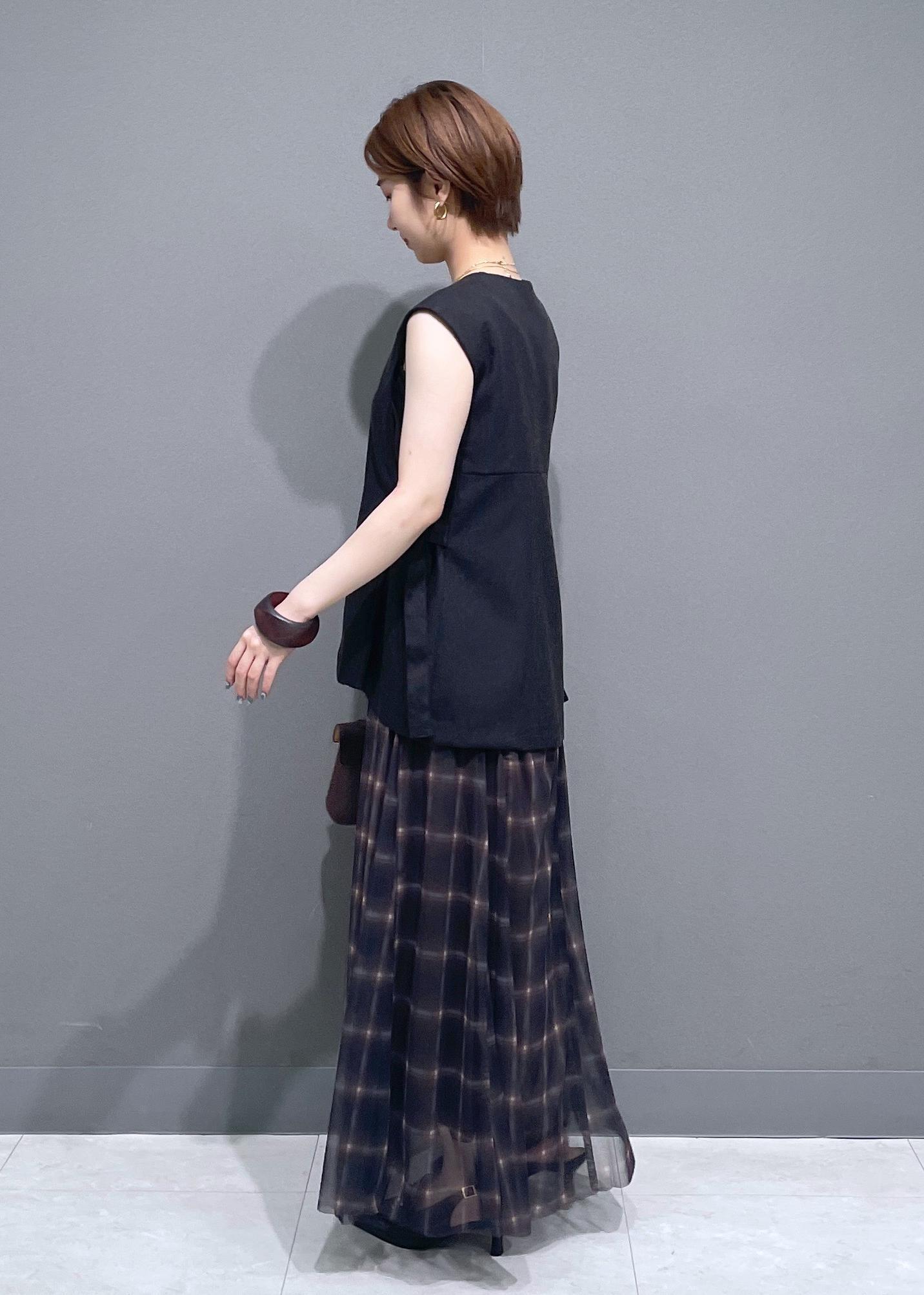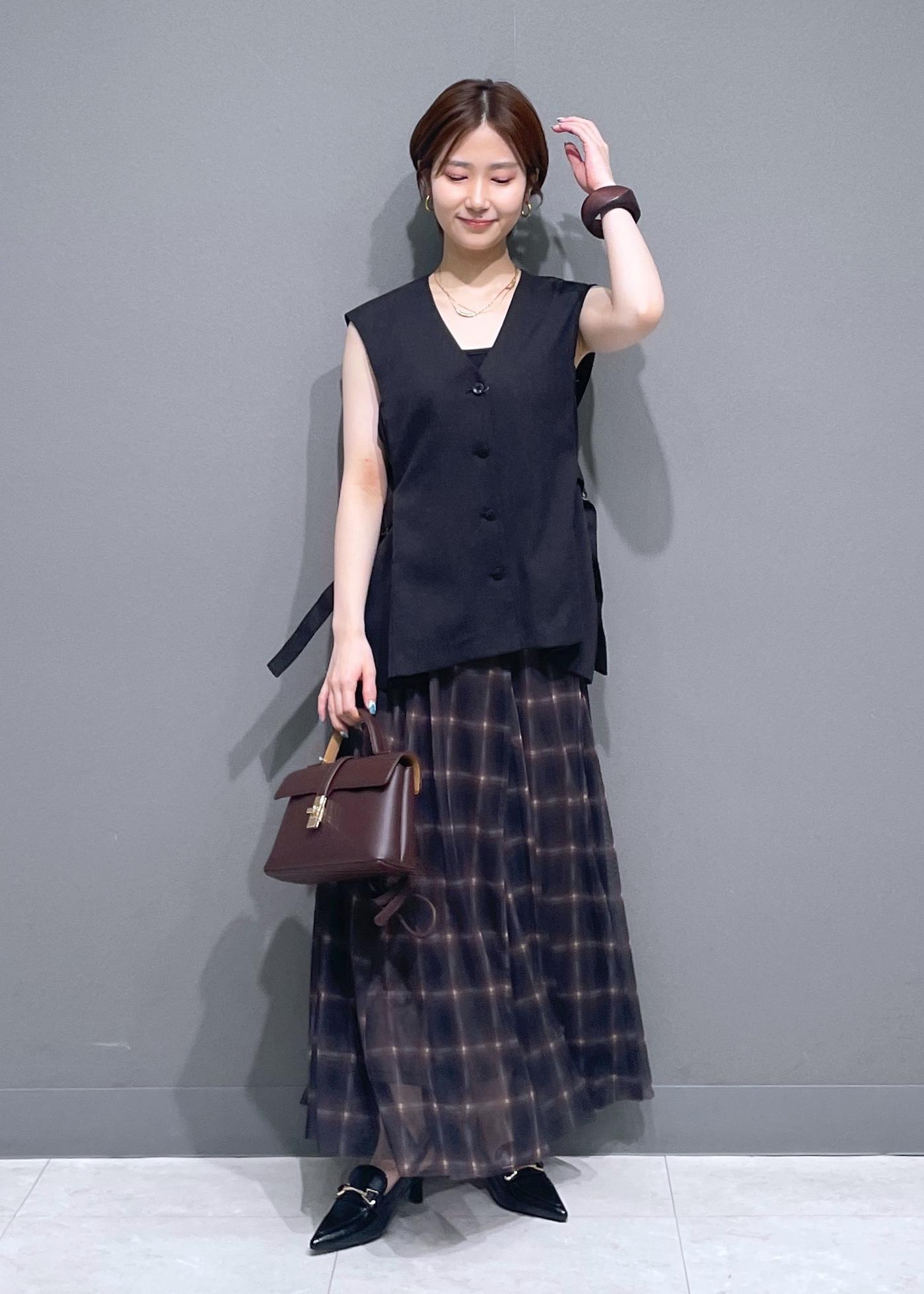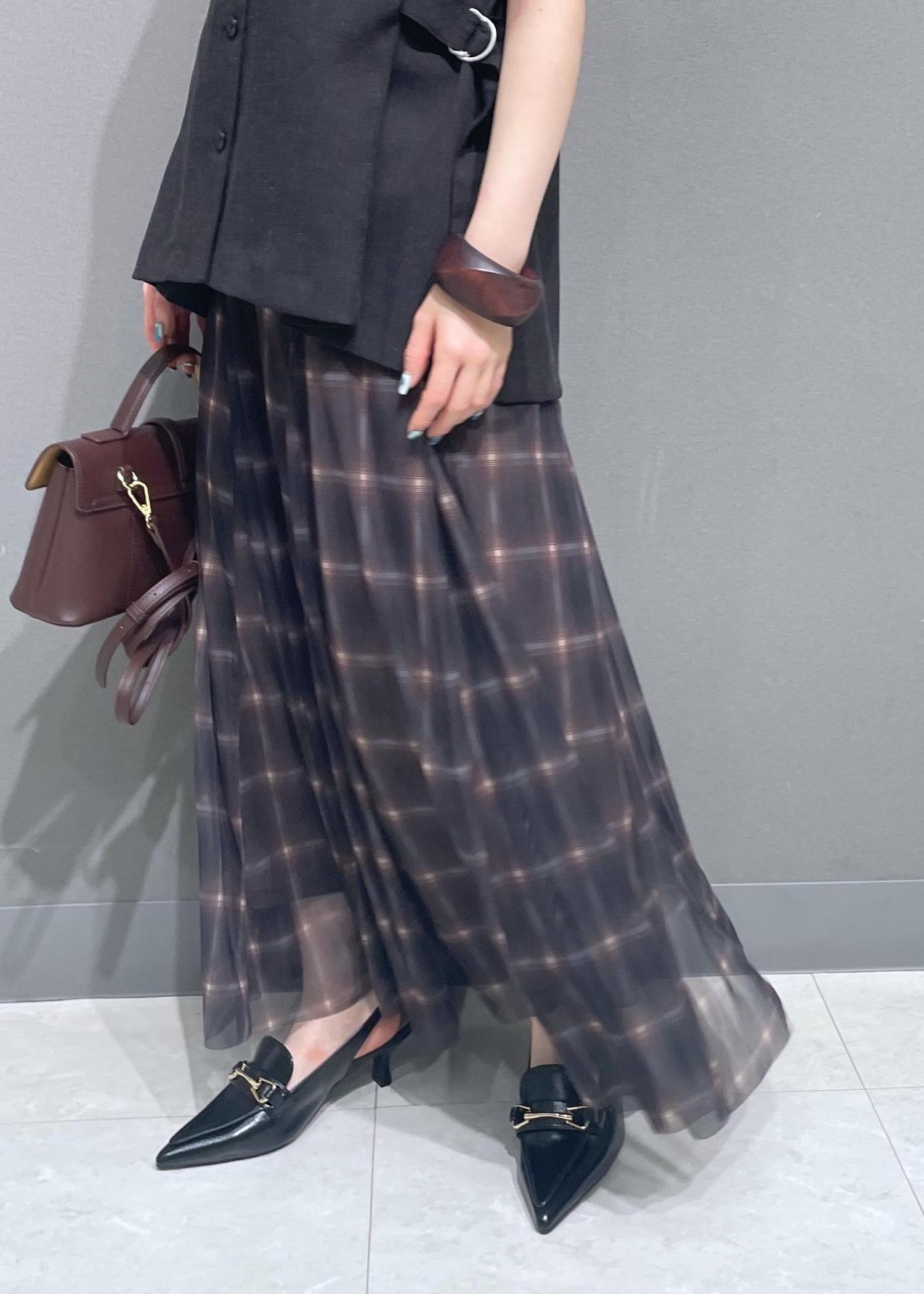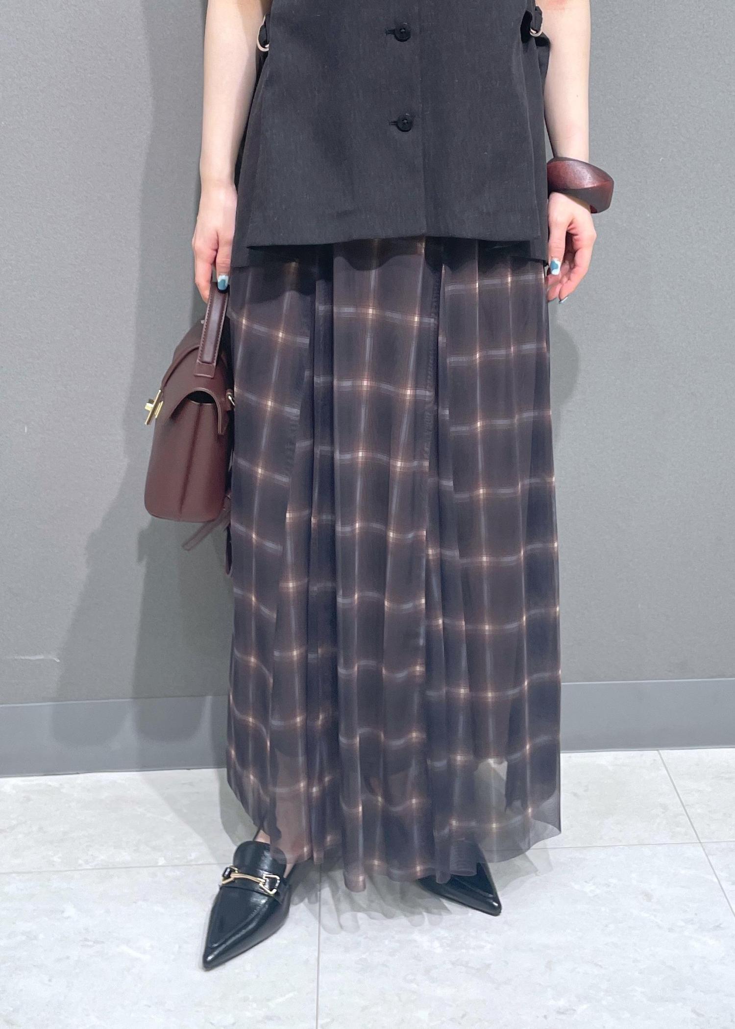 VIS【洗える】チュールプリントチェックスカートダークブラウン系 / F¥4,612レビュー150cmでくるぶしが隠れる丈でした。