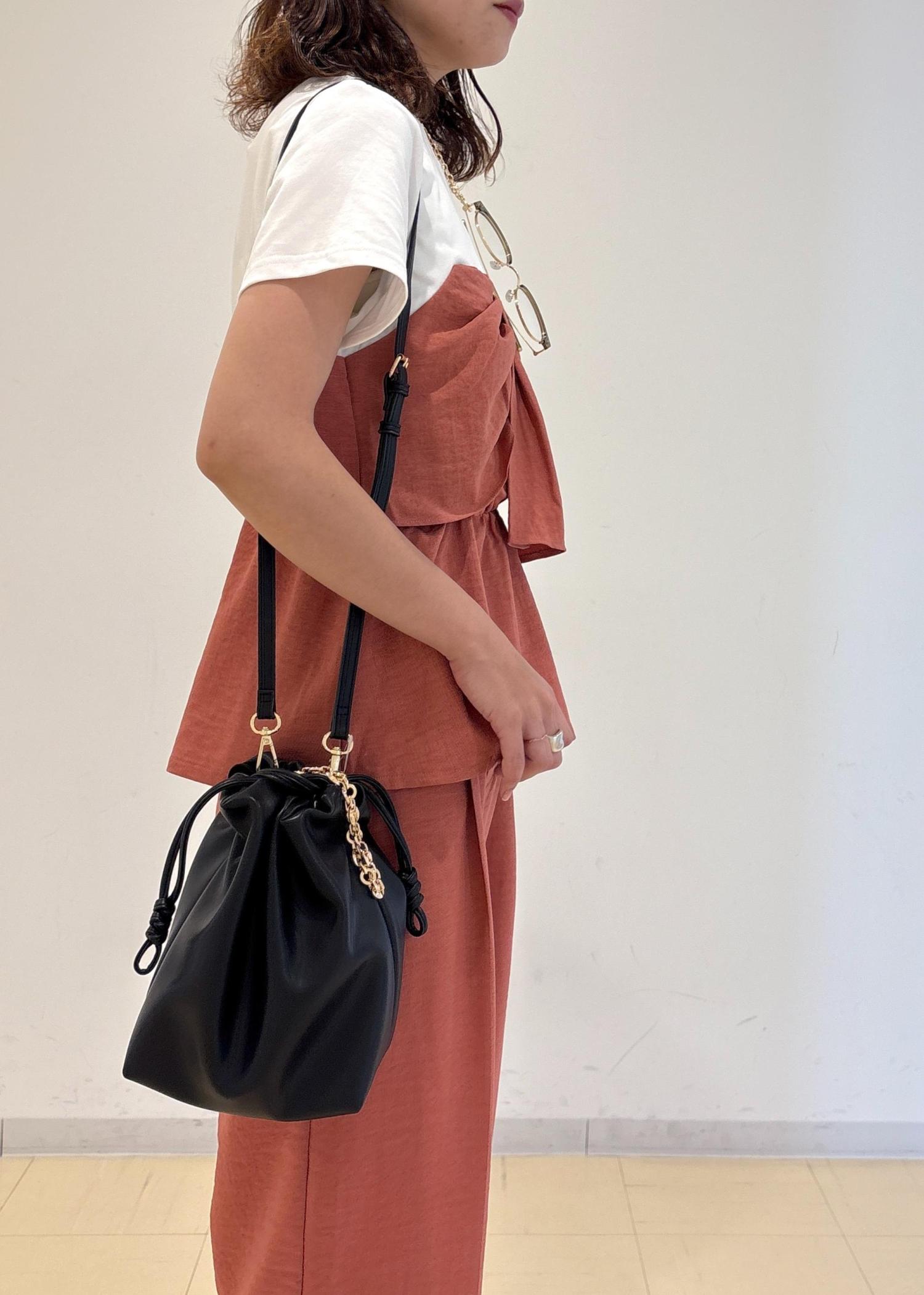 チェーンの持ち手がアクセサリー感覚にもなる巾着バック。
