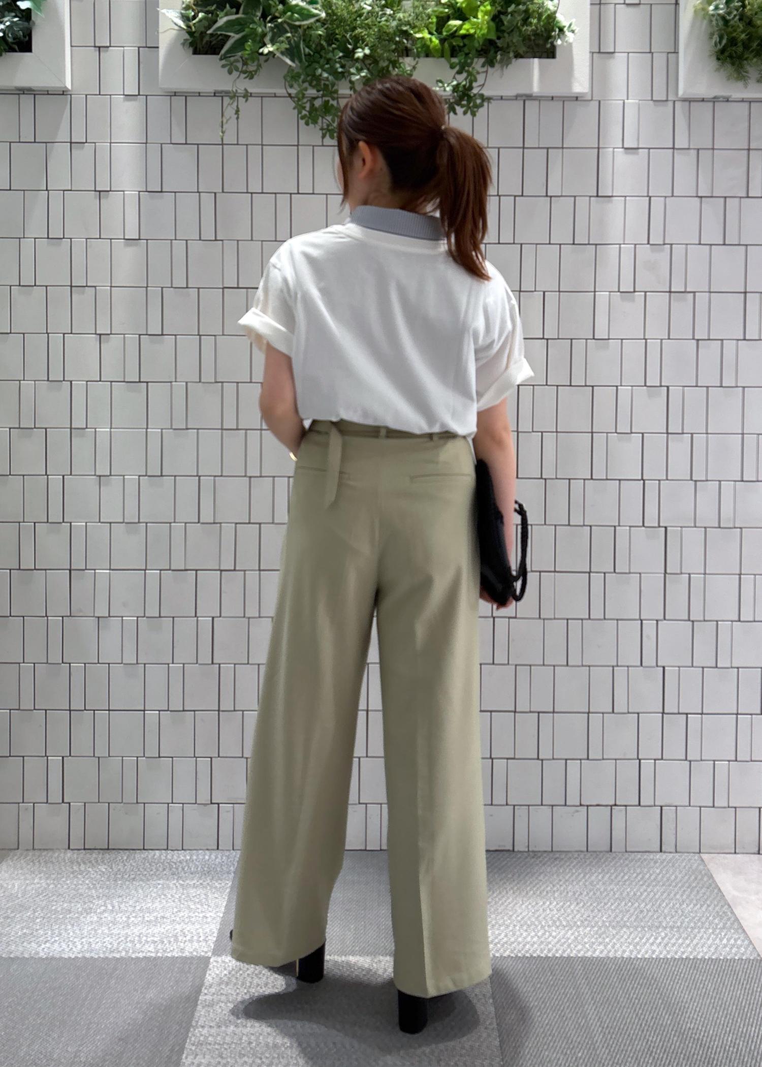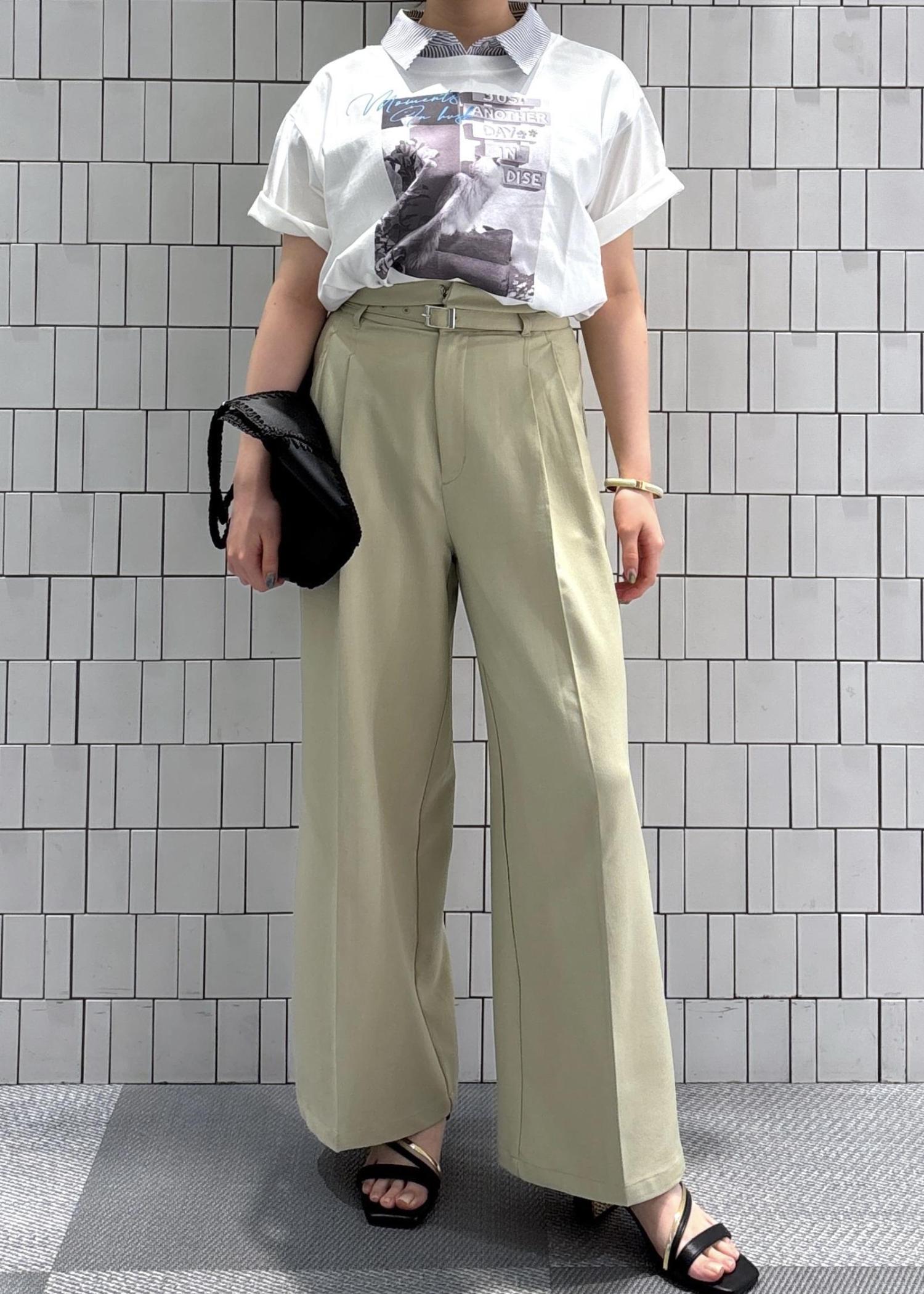 VIS【新色追加】【防シワ/接触冷感】ベルトディテールタックワイドスラックスパンツライトグリーン / SS¥6,589レビュー身長150センチで、ssだとスッキリたるみなく着用でき、くるぶし隠れる丈感です。