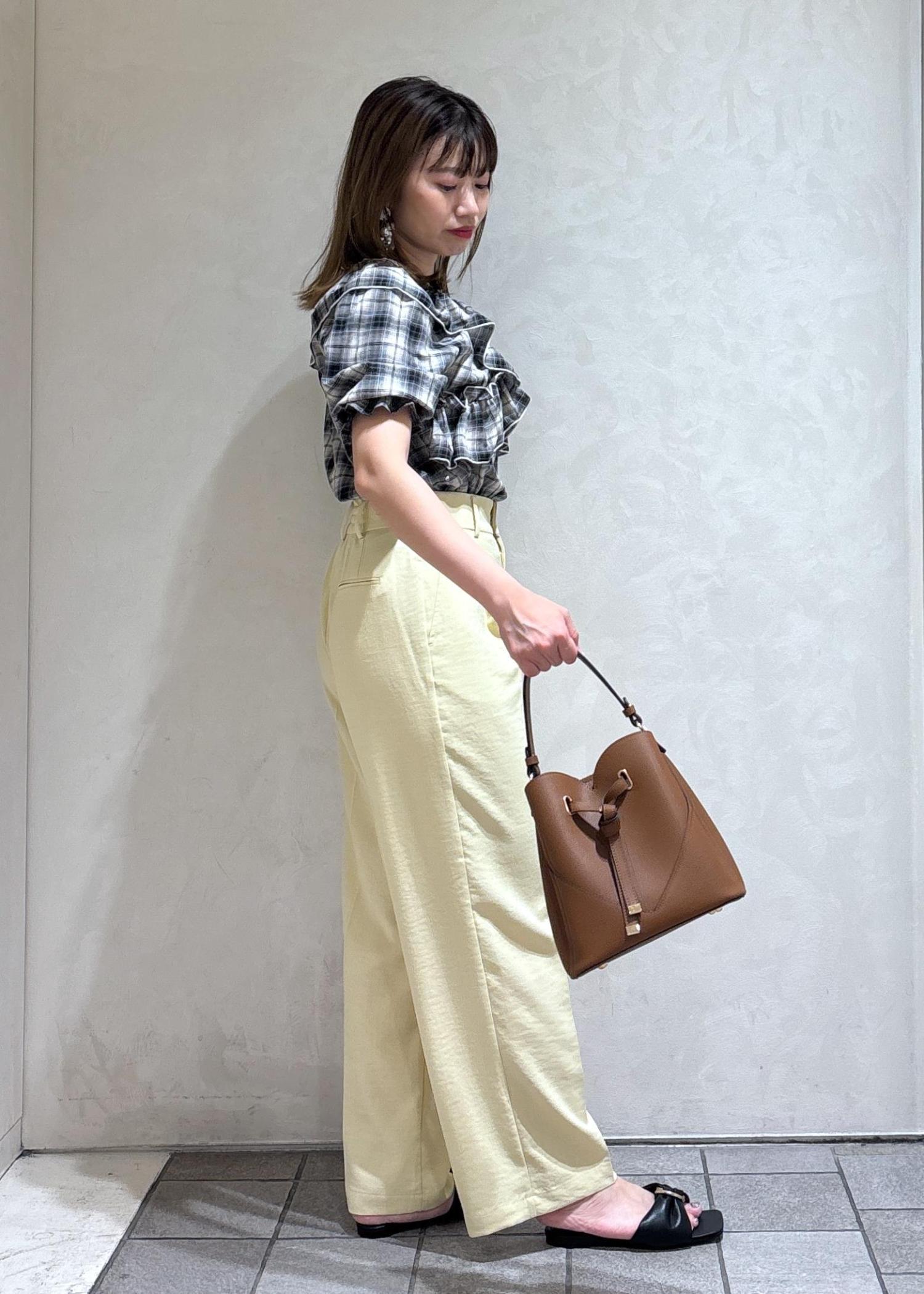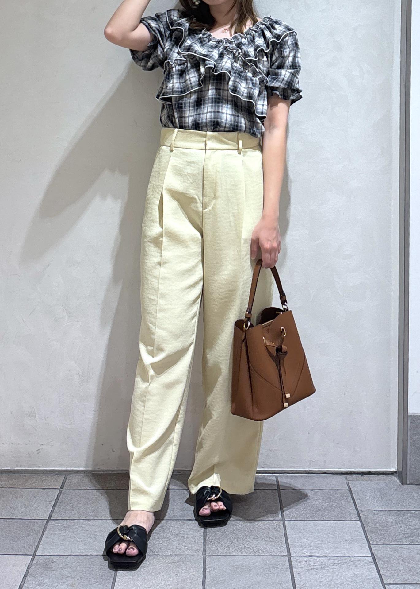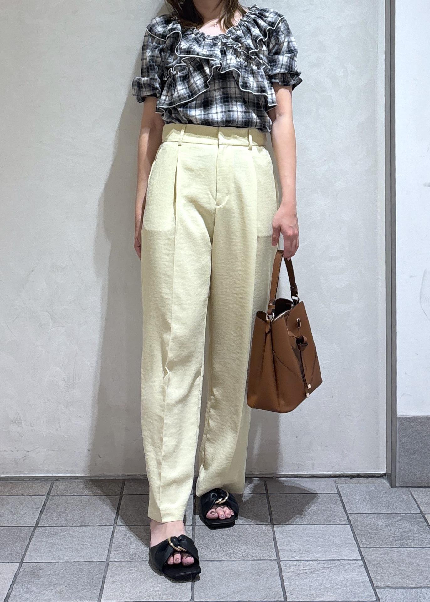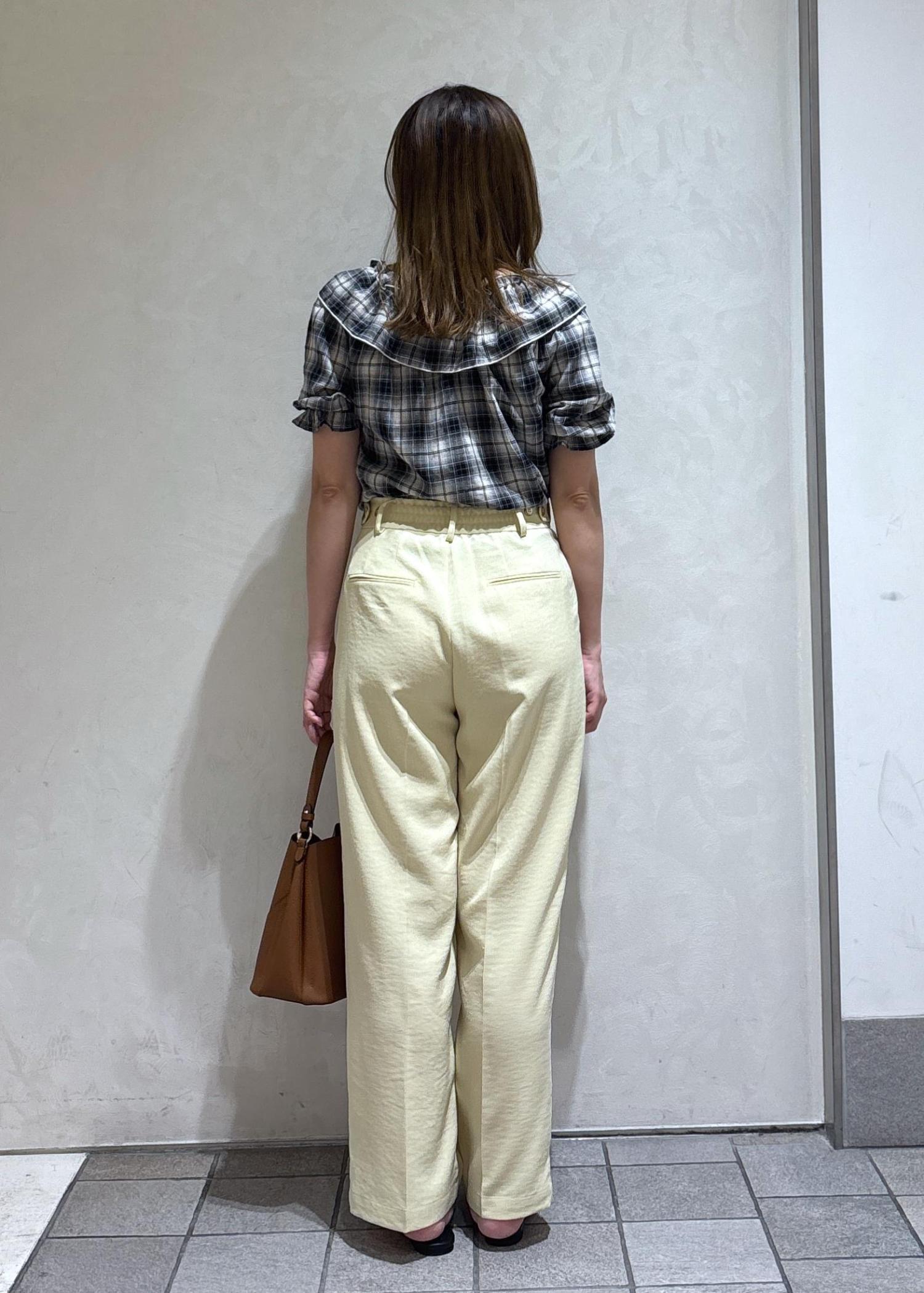 イエローのワイドパンツを合わせて
