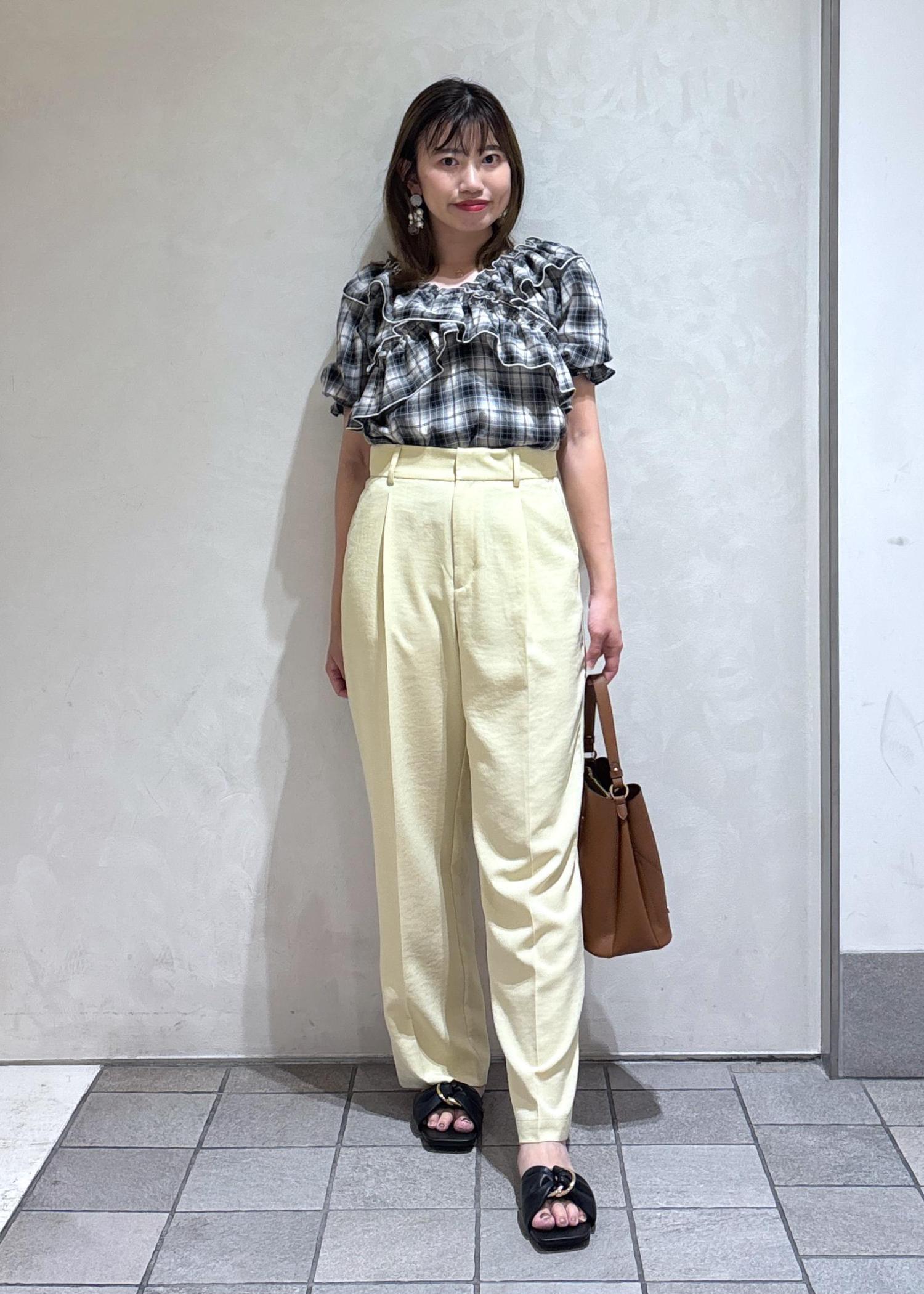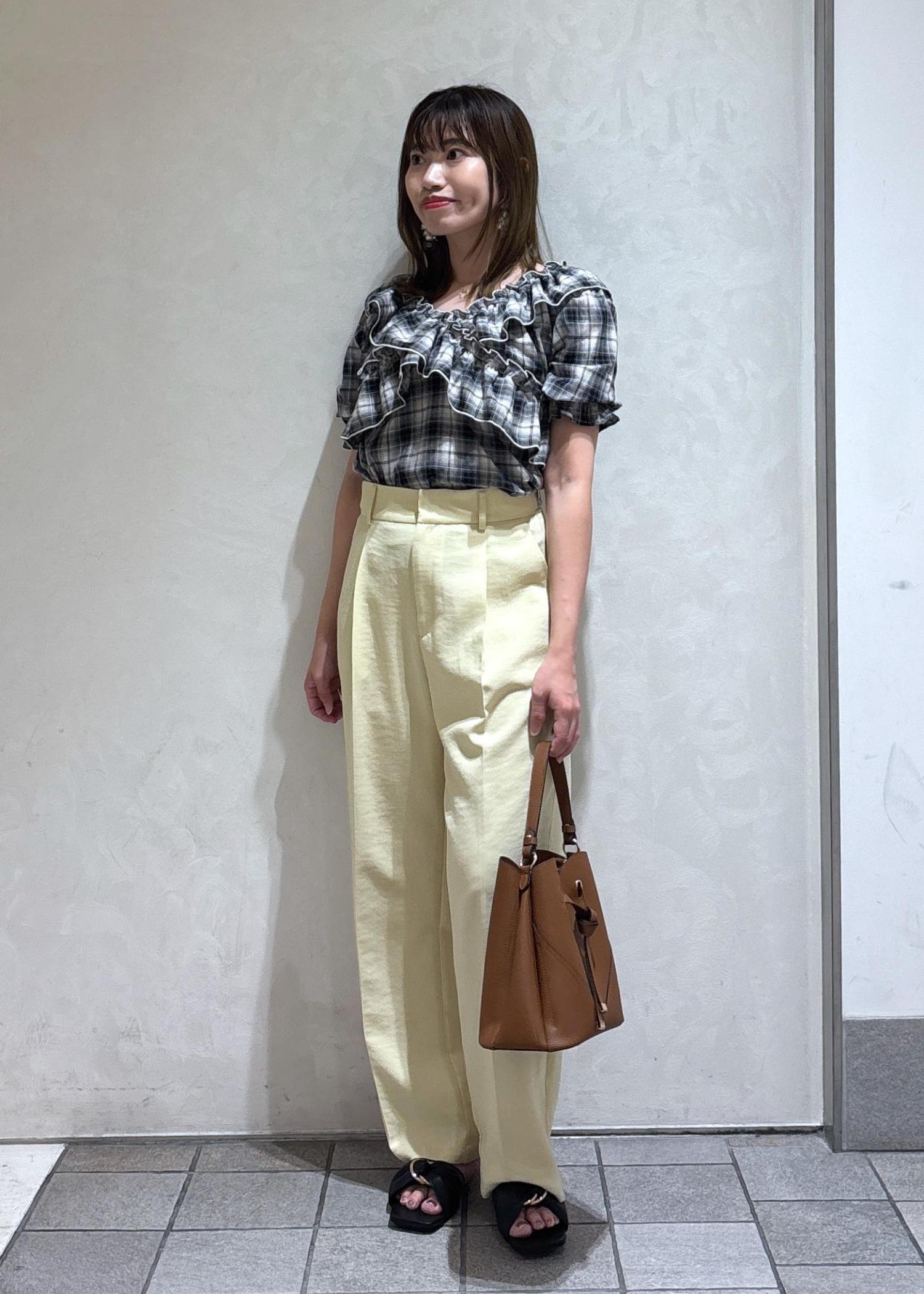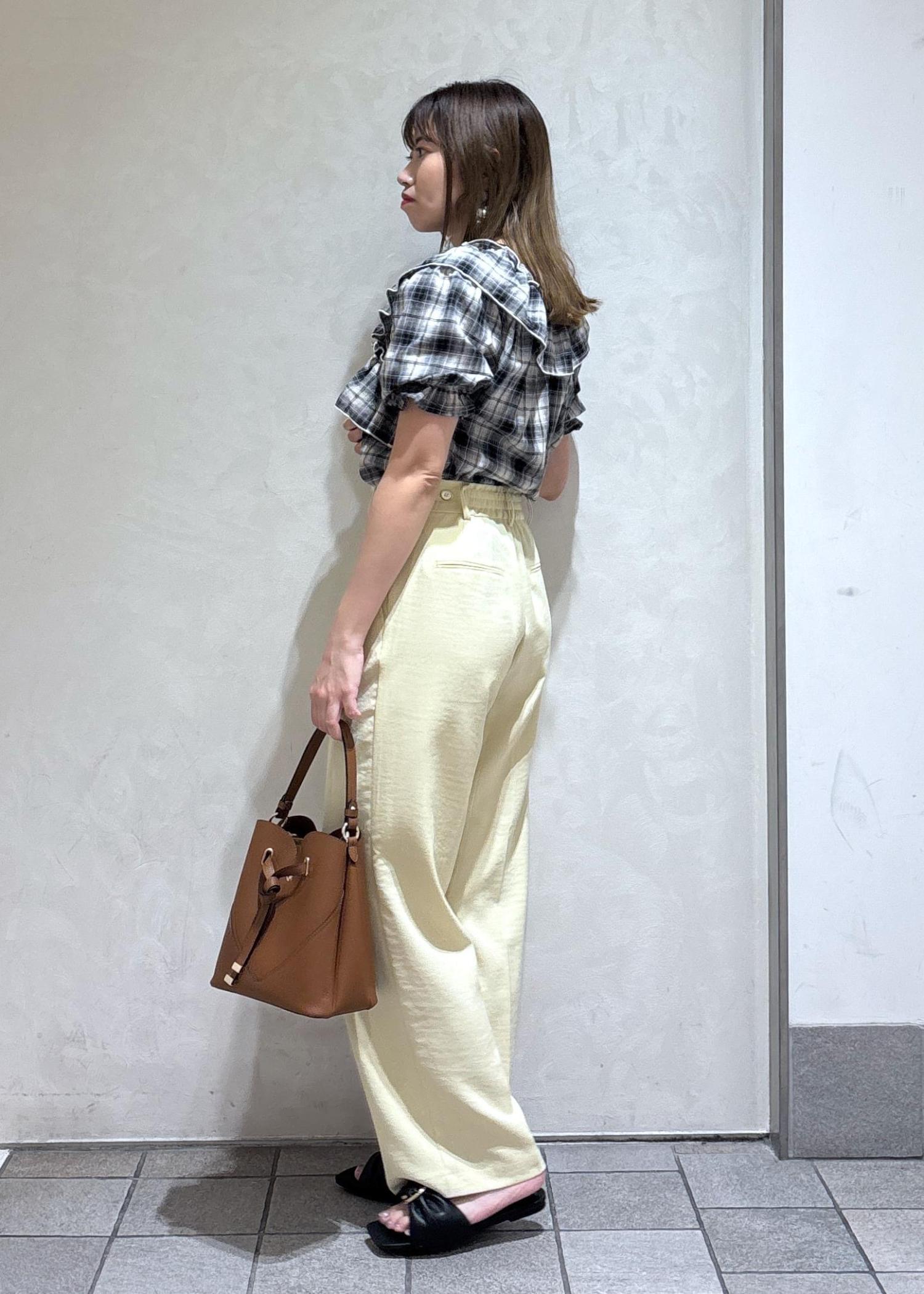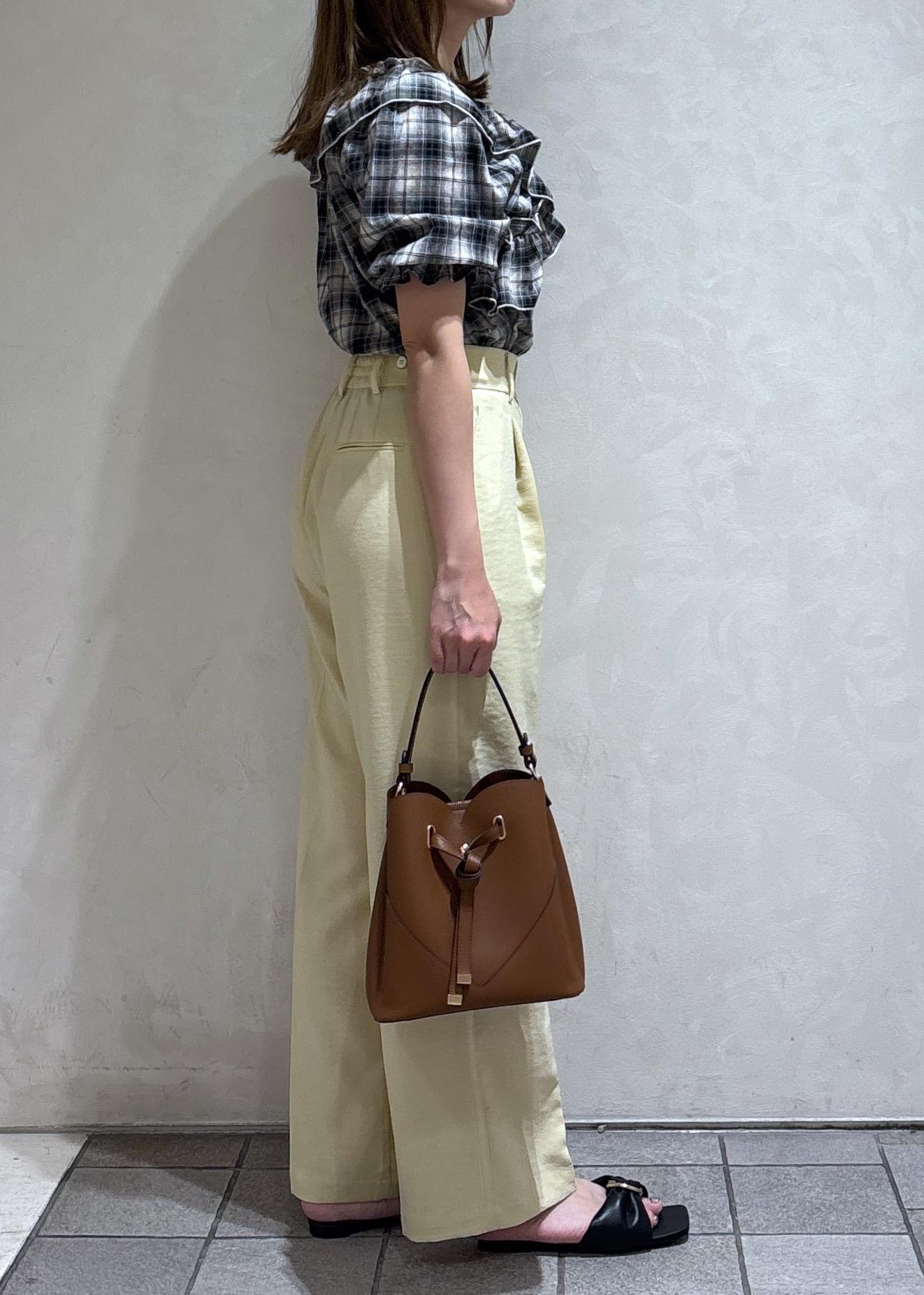イエローのワイドパンツを合わせて