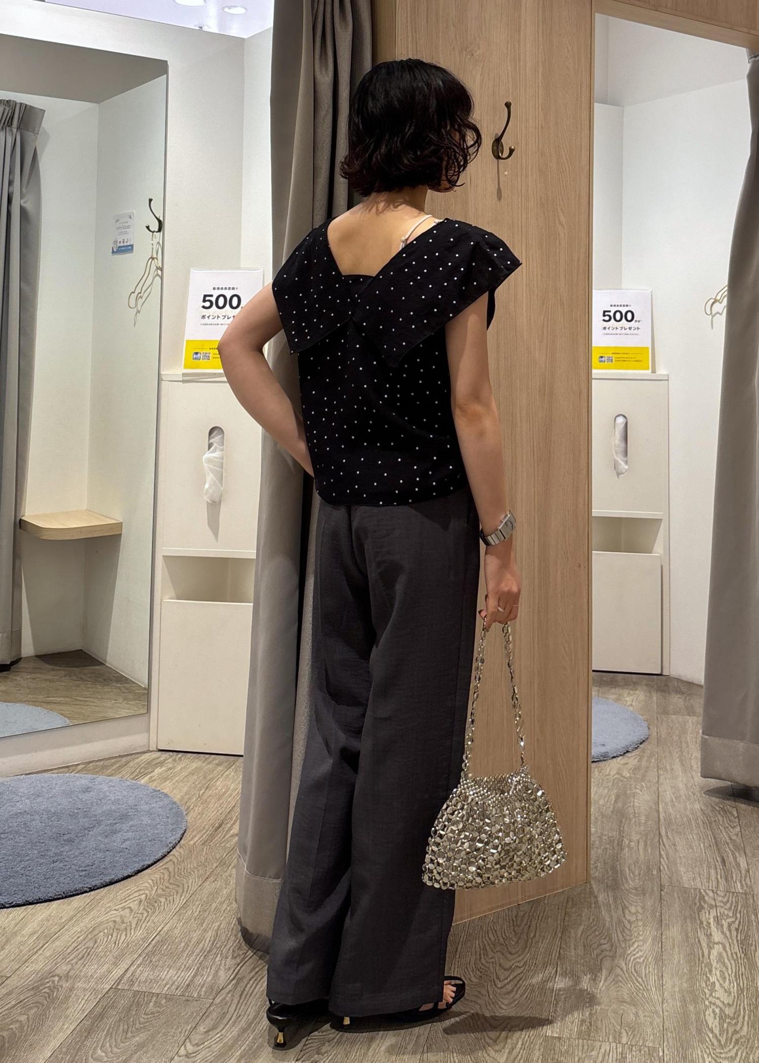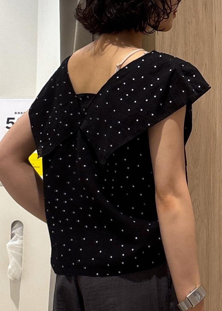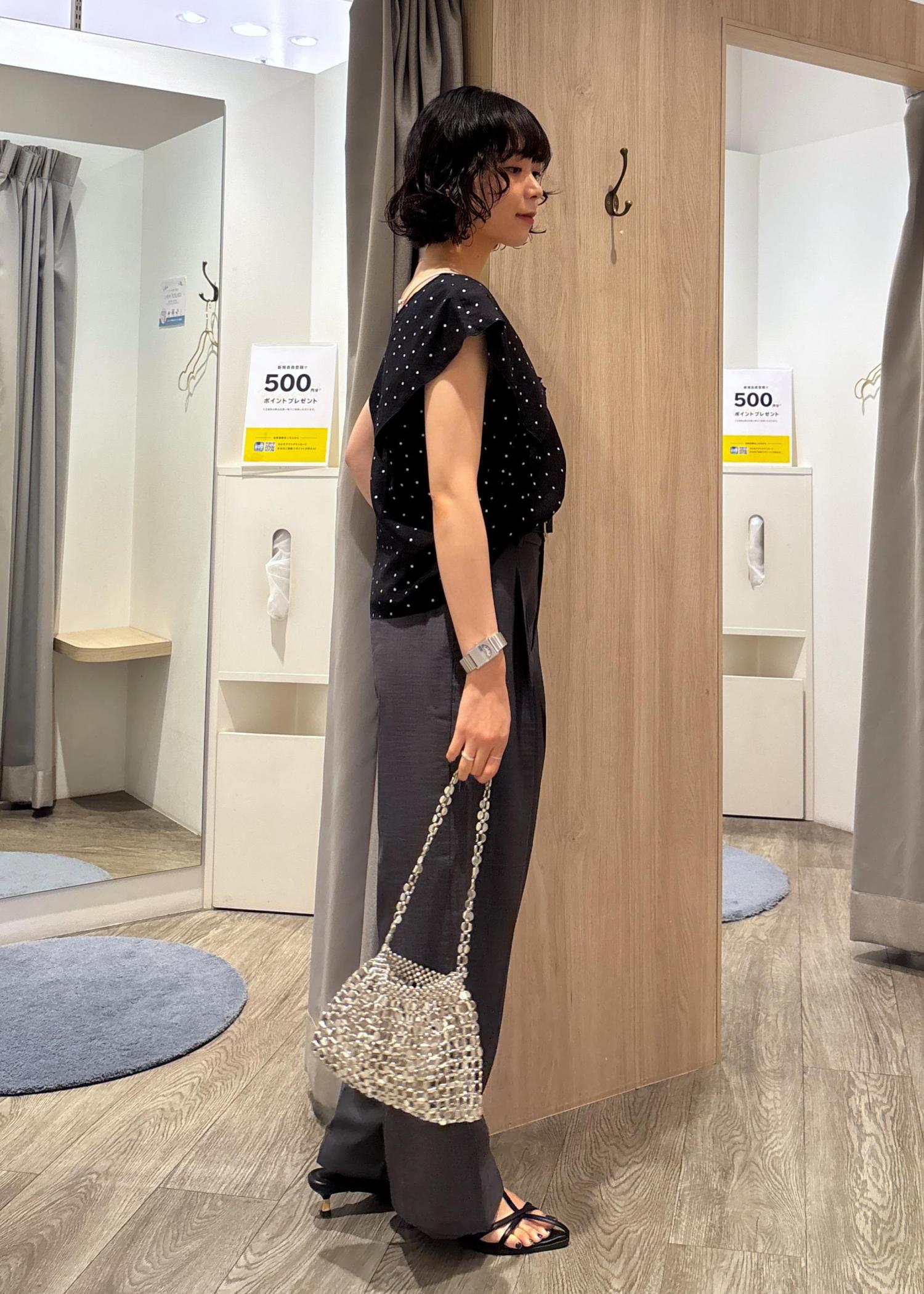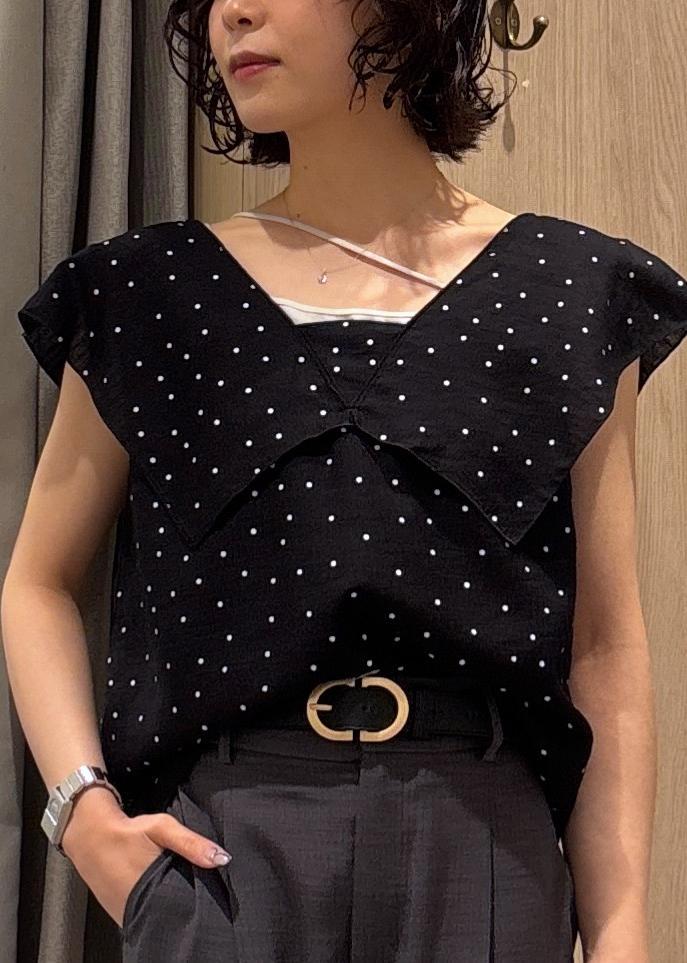 ドット柄のブラウスを使った大人っぽい雰囲気のスタイリング。