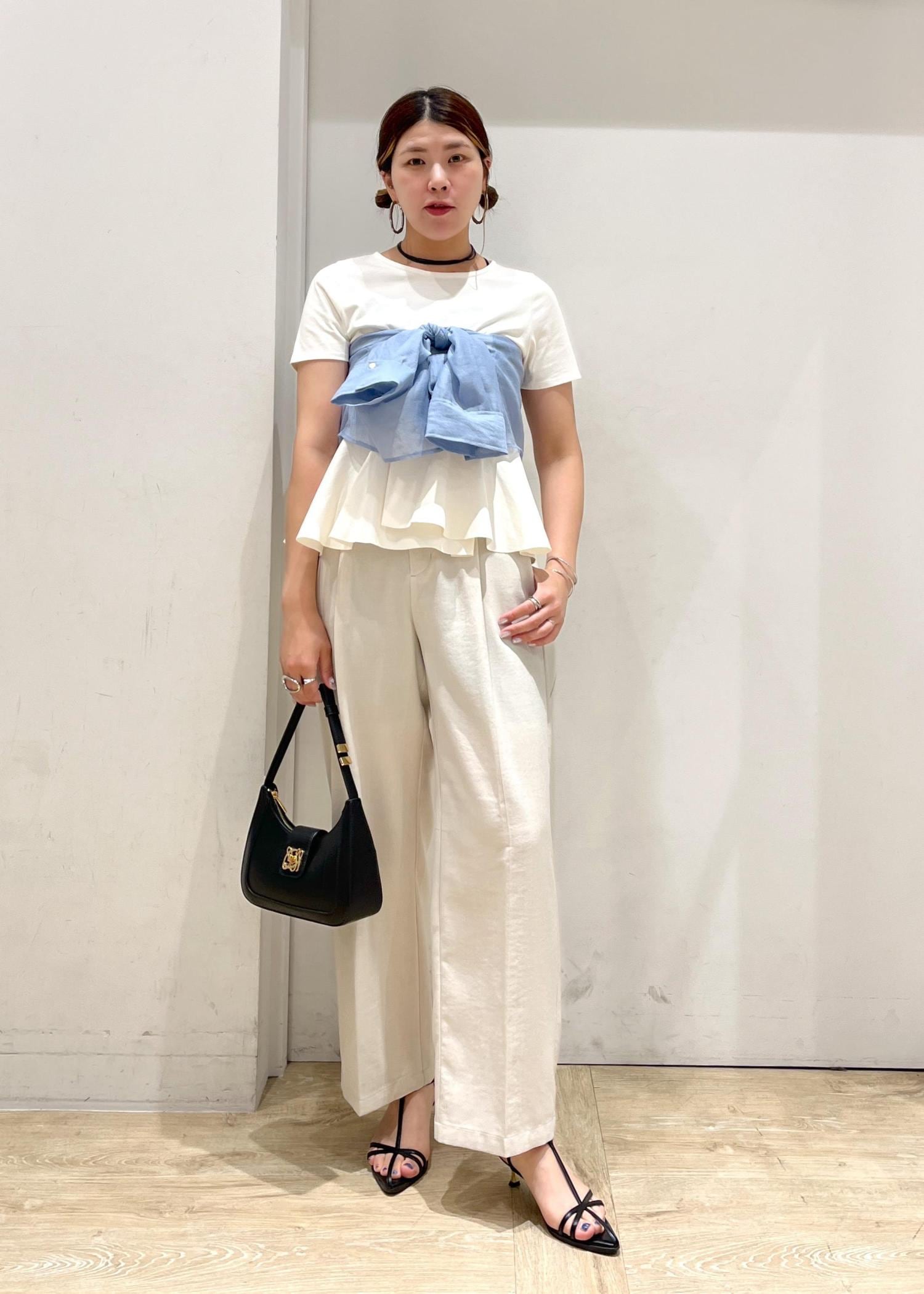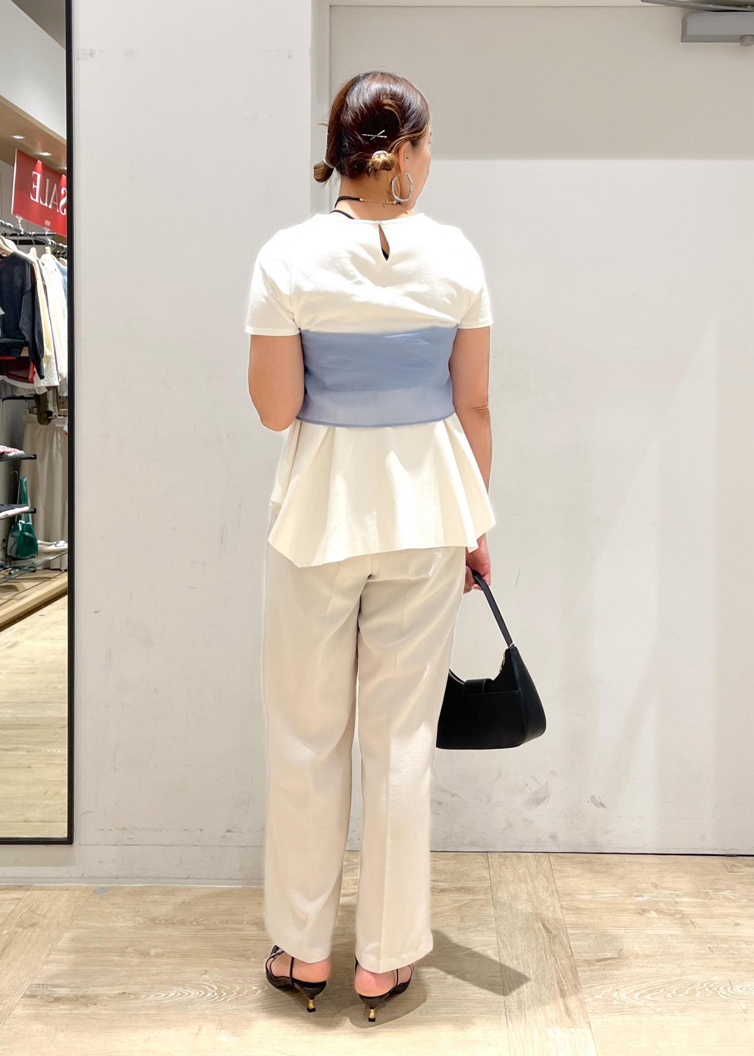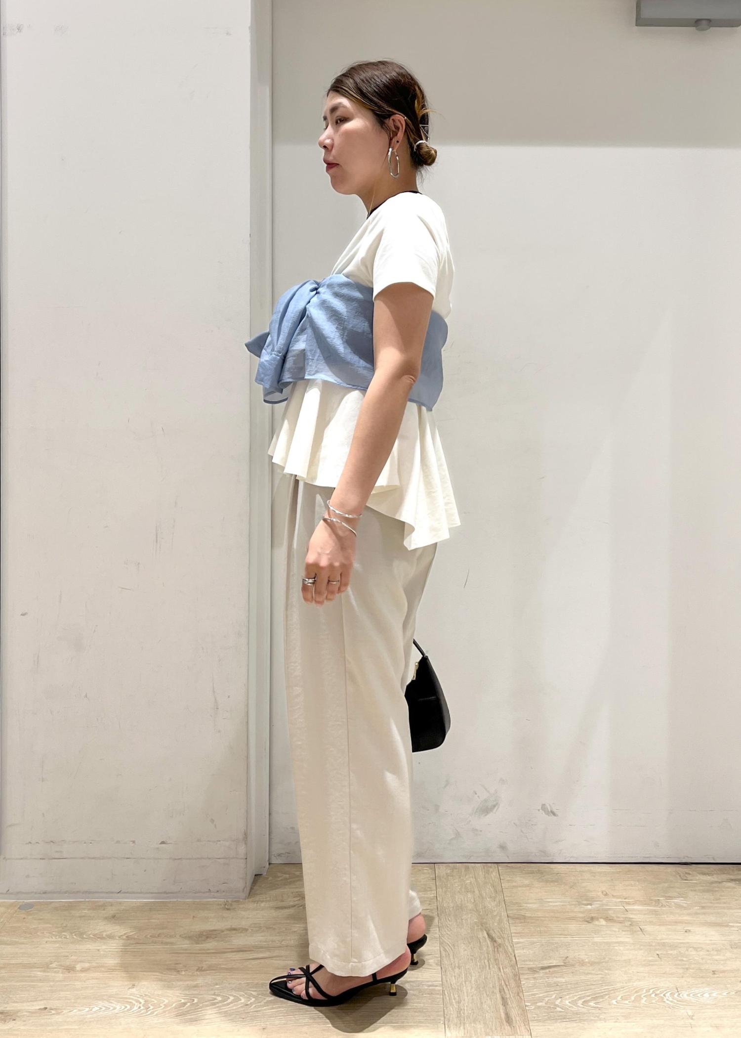 イレギュラーヘムやペプラムシルエットで大人可愛いトップスに美easyパンツ合わせで大人っぽく。