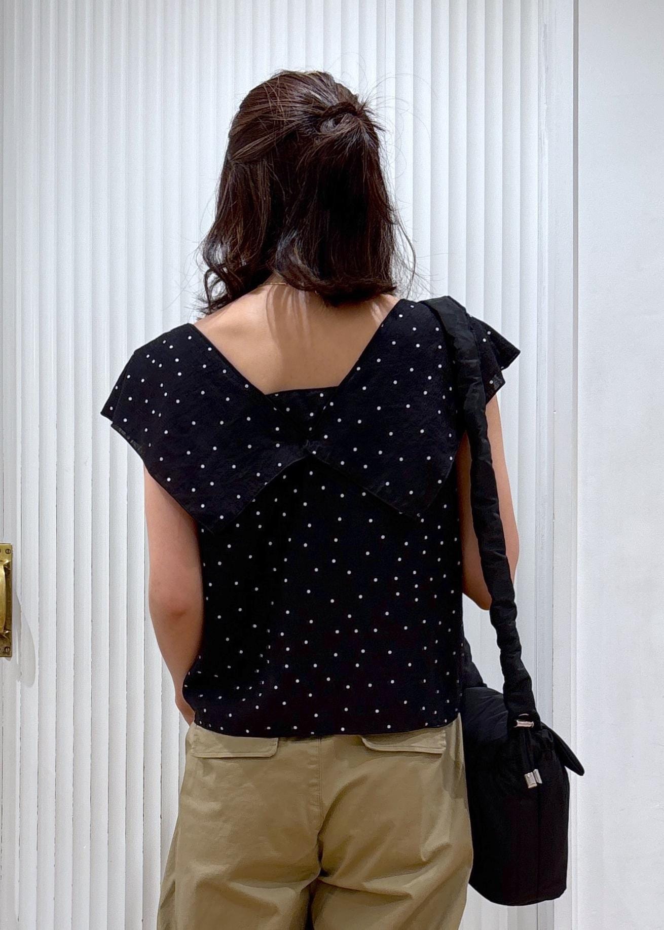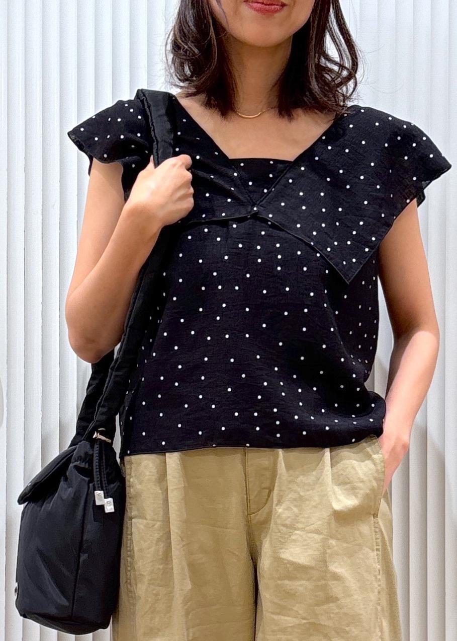 ドットのブラウスをバレルパンツと合わせたカジュアルコーディネートです。