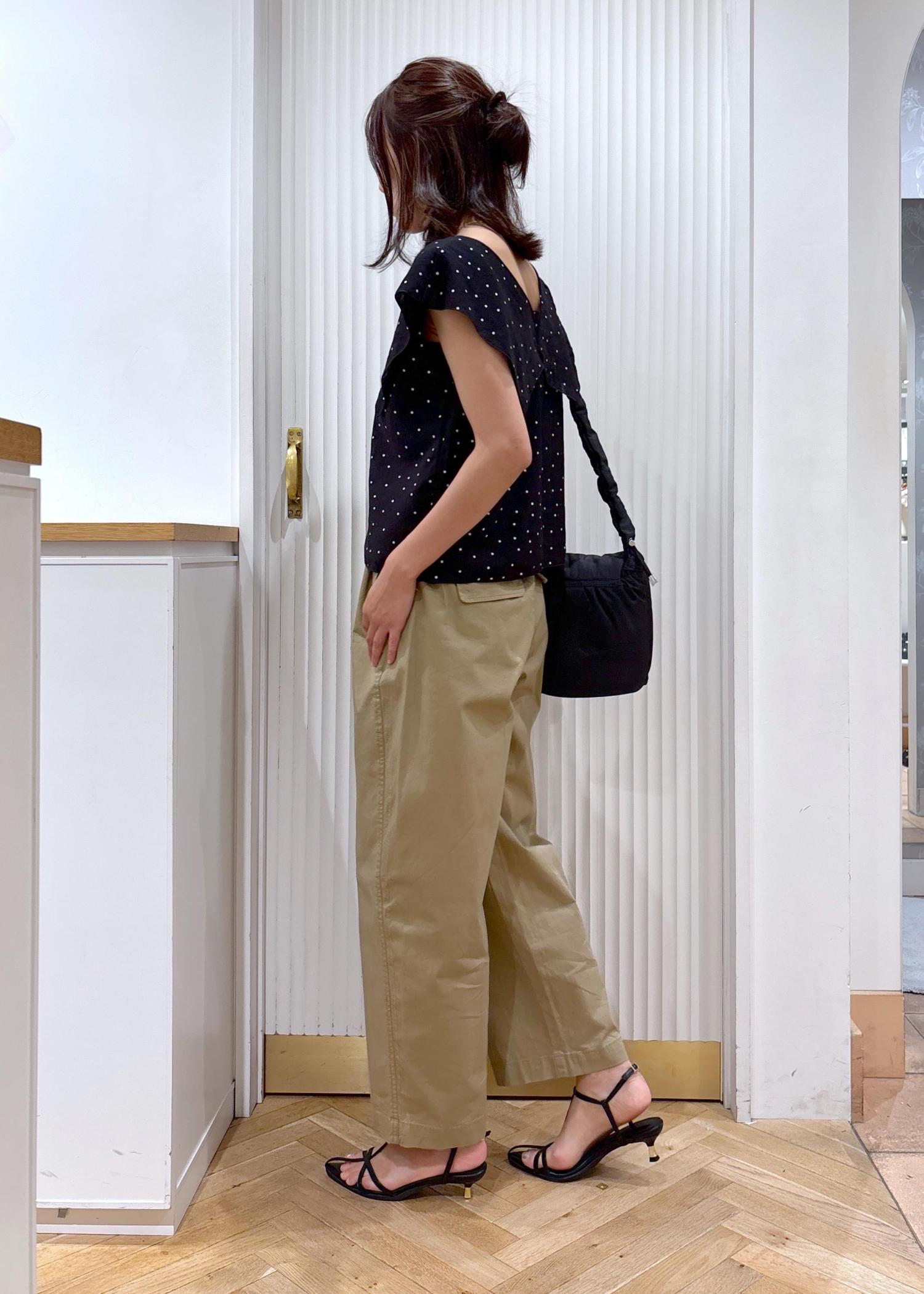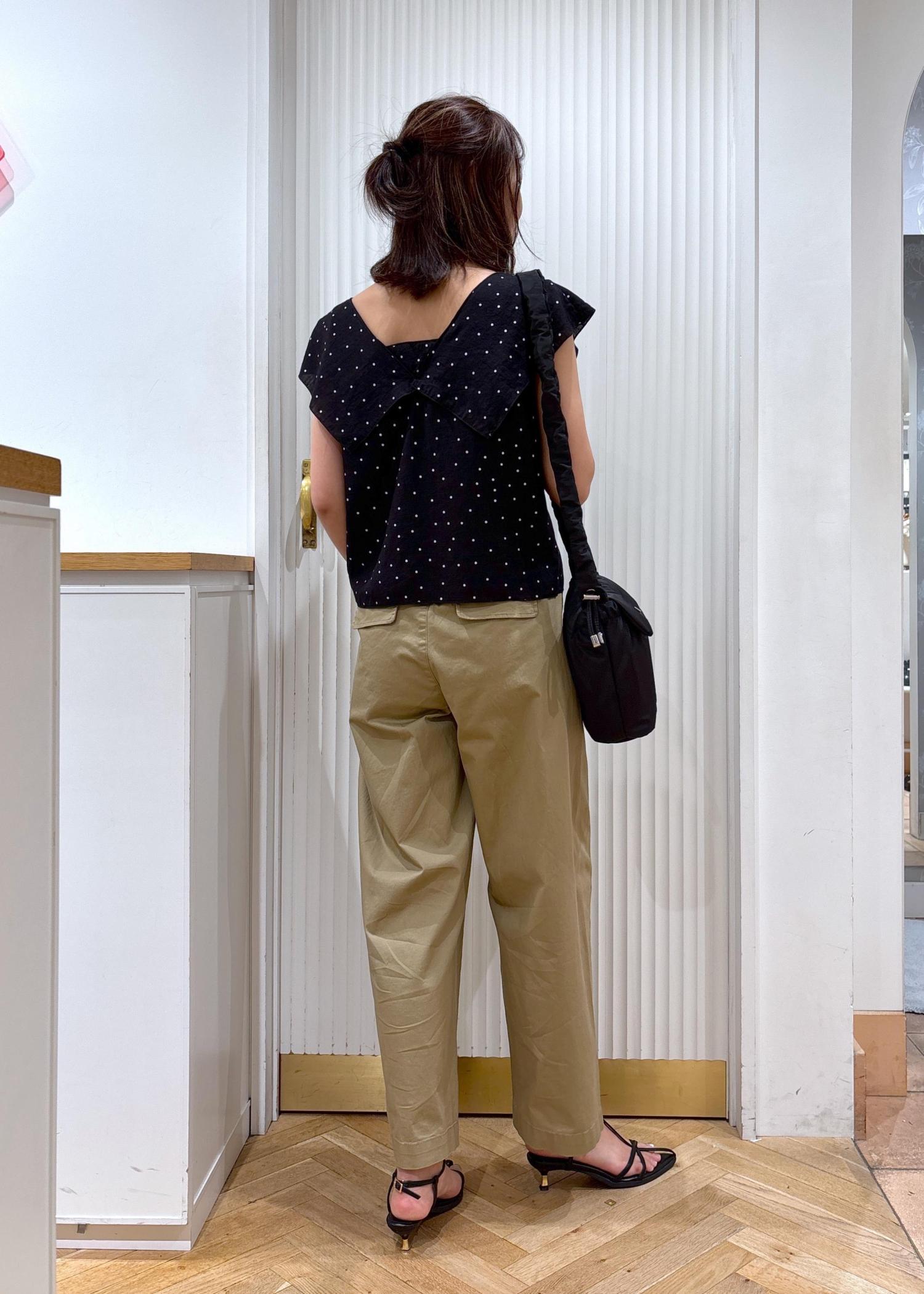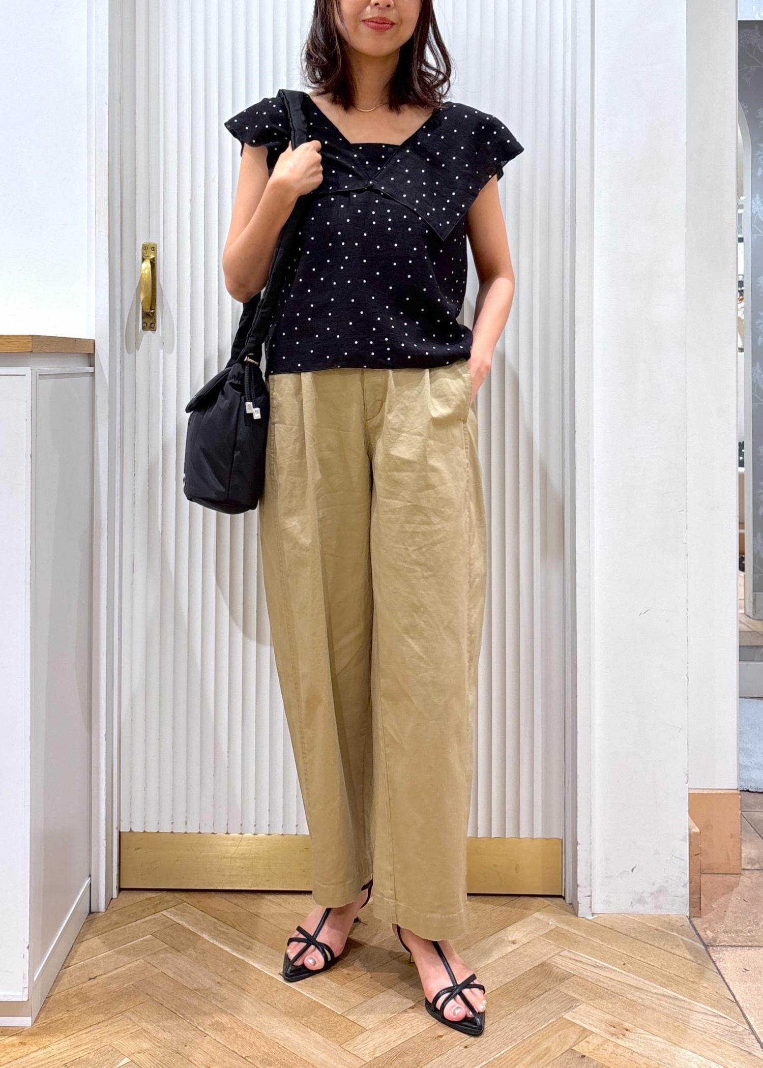 カラーはブラックとベージュでまとめて、落ち着いた印象にしました。首周りに開きがあるデザインのブラウスなのでパンツとの相性も抜群ですよ。