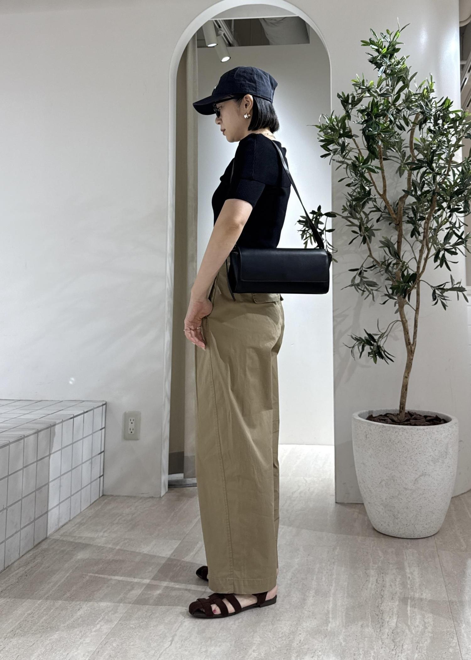 ハイウエストでテーパードパンツの様な横の広がりがあり、脚のシルエットを拾わないので脚長効果も◎