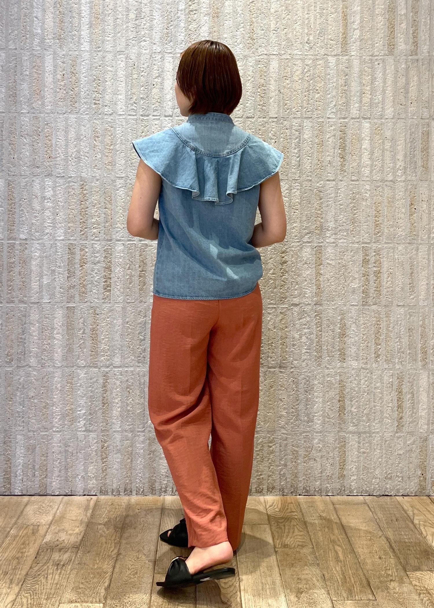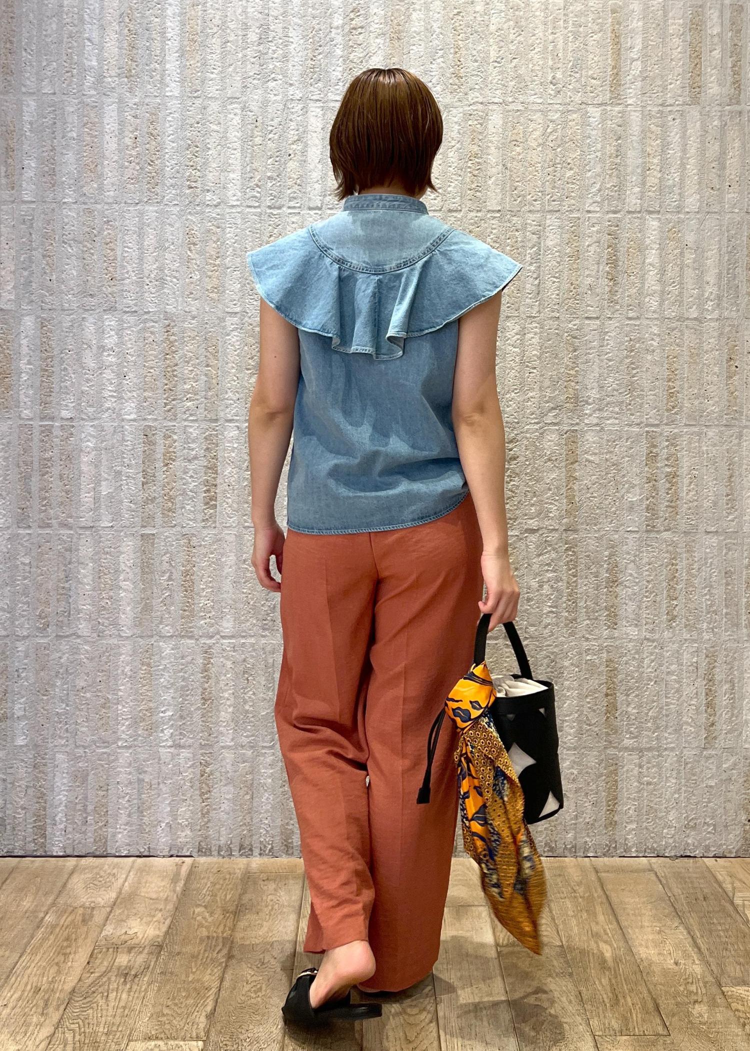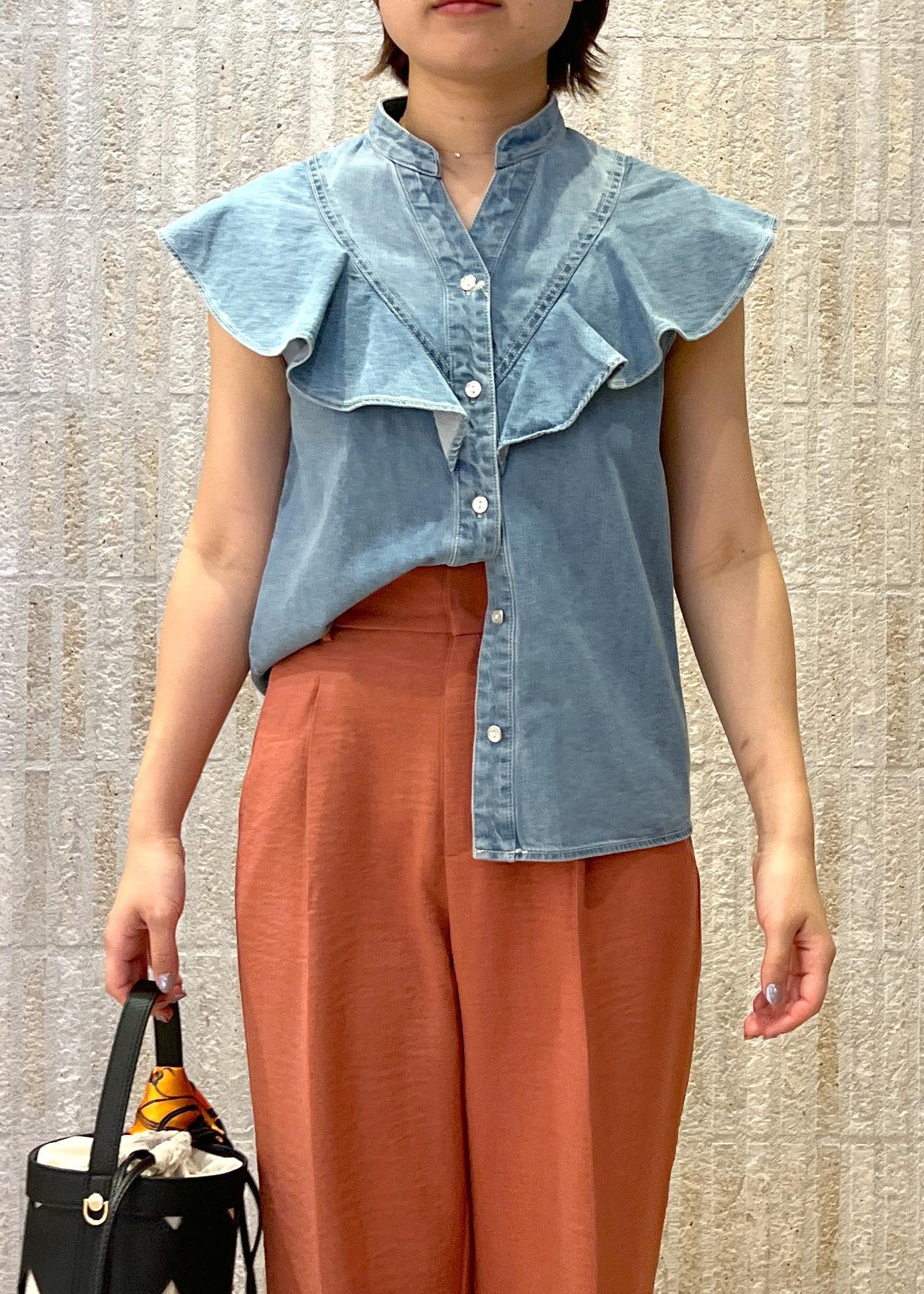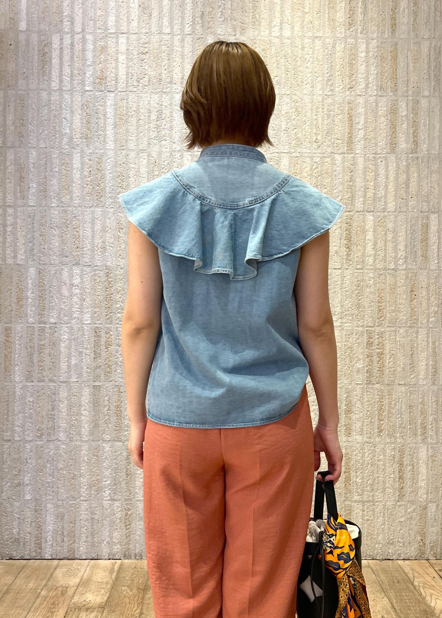 VIS【UVケア/洗える】ラッフルデザインデニムブラウスサックス / F¥3,953レビュー肩のフリルが大きめのため、