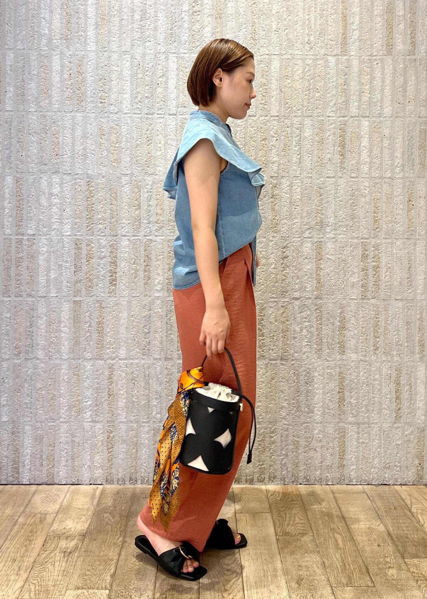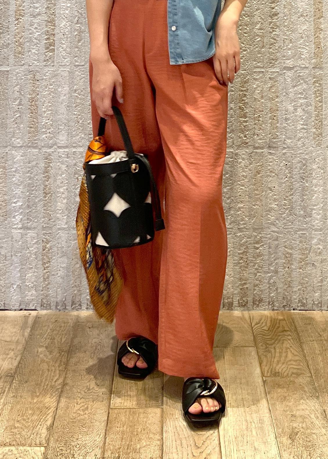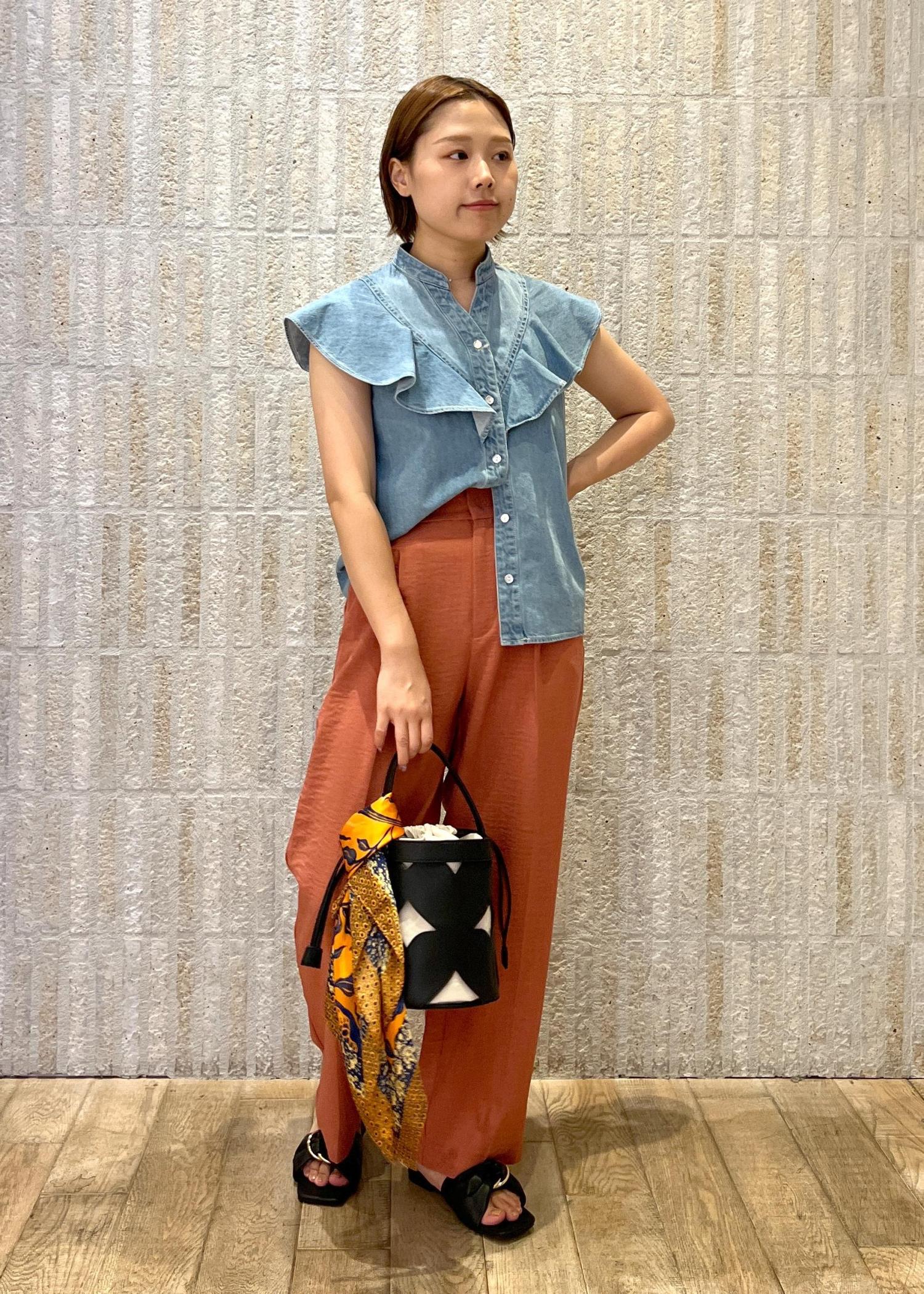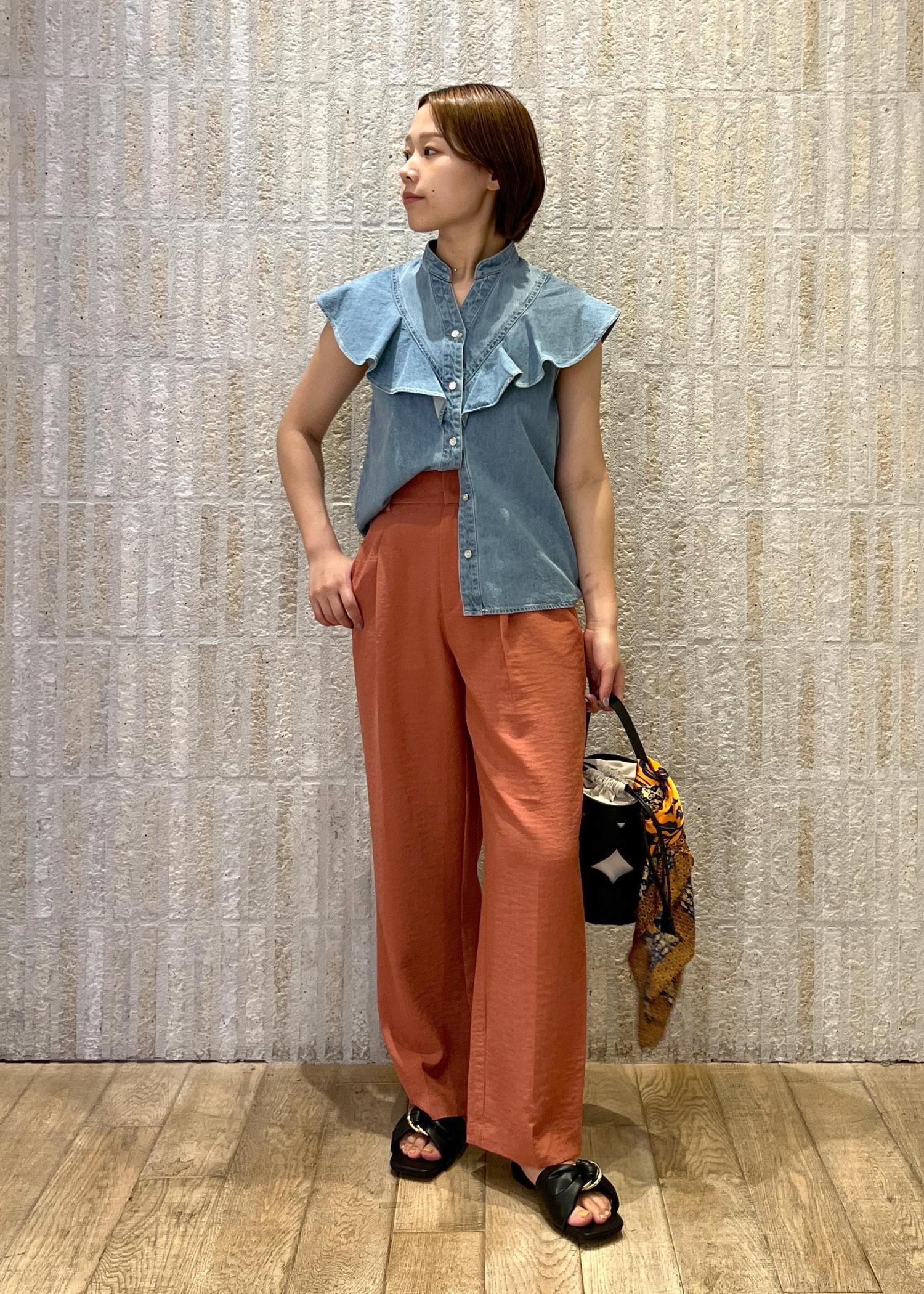 明るいお色味ですので、トップスはシンプルなものでも、コーデ全体を華やかにしてくれます。