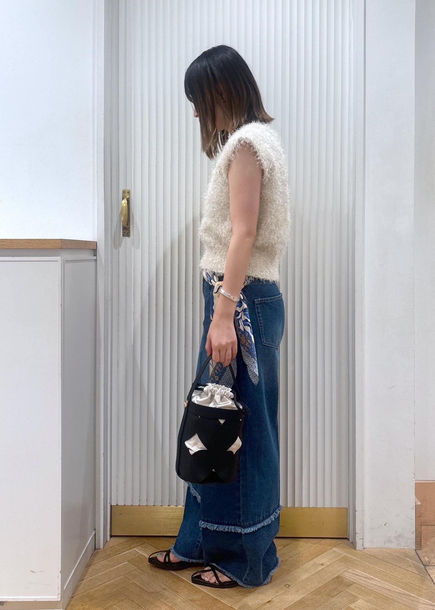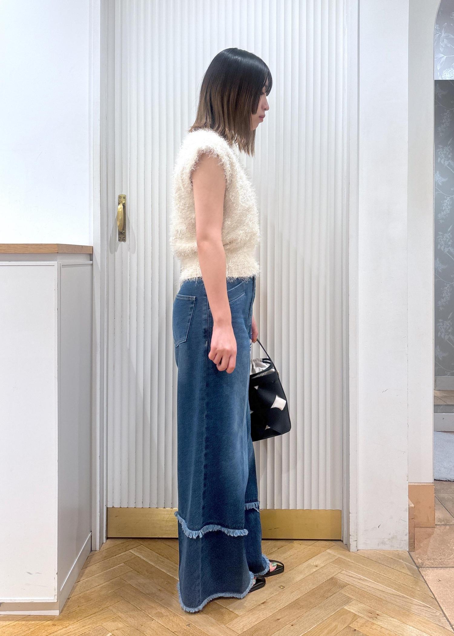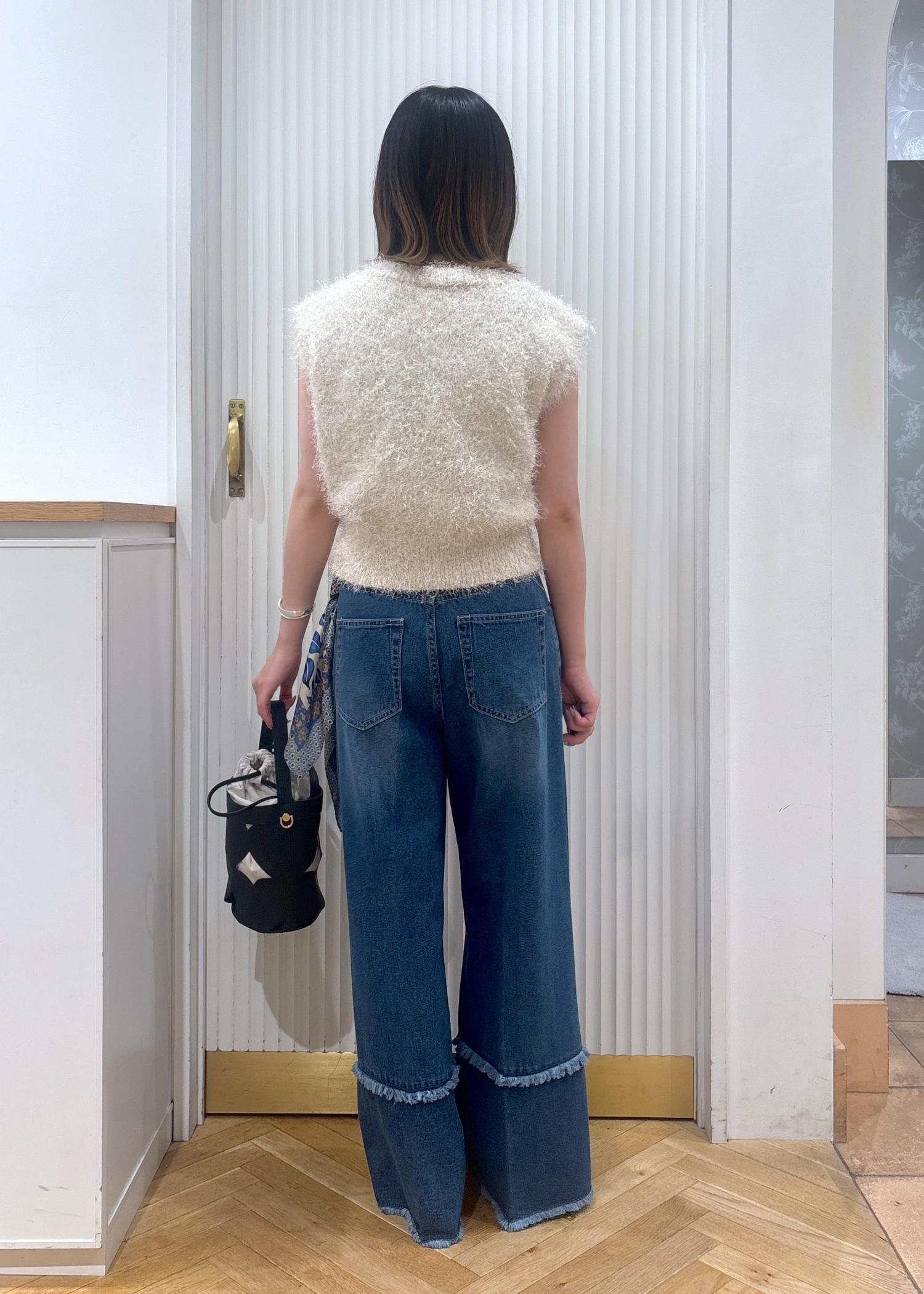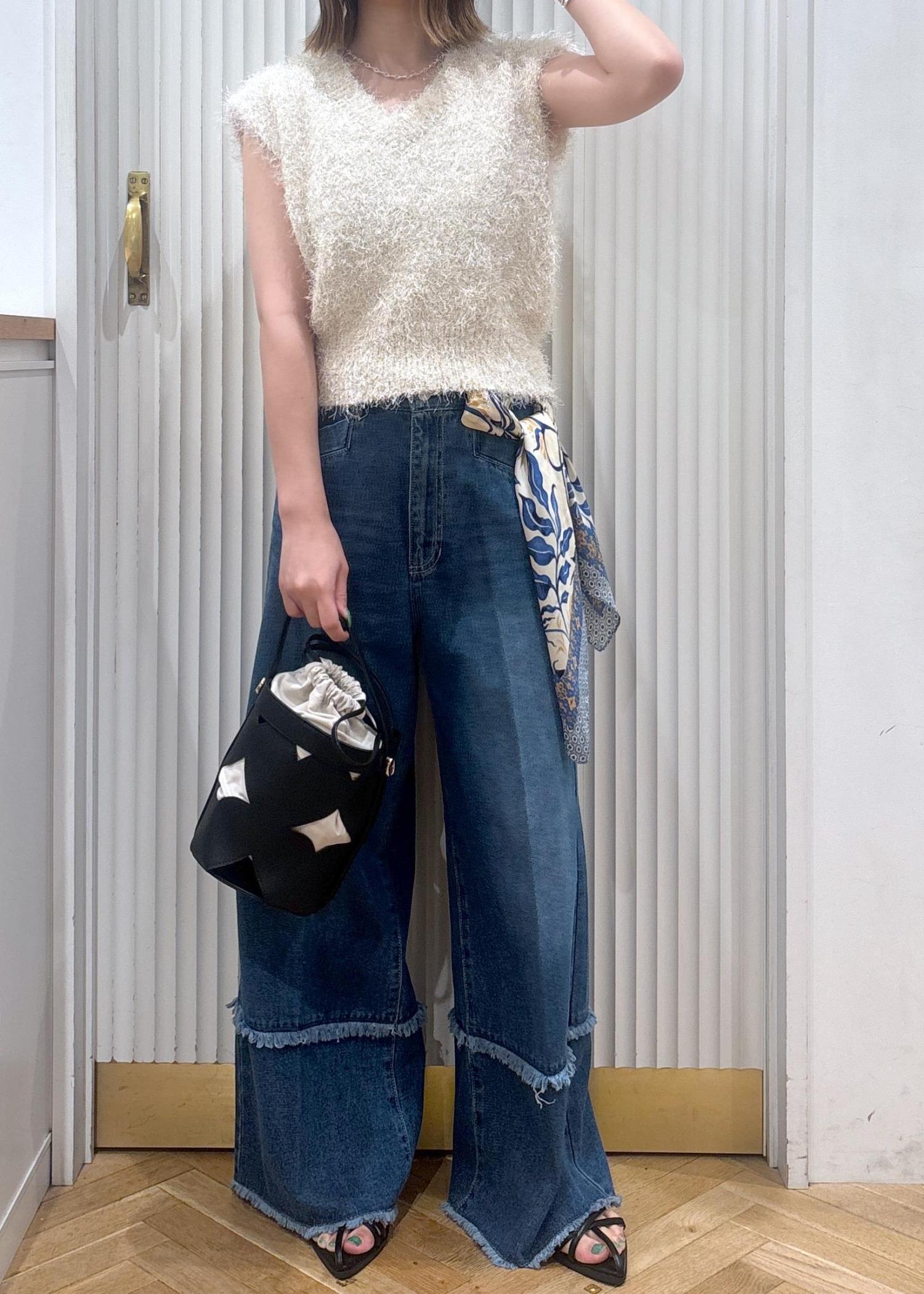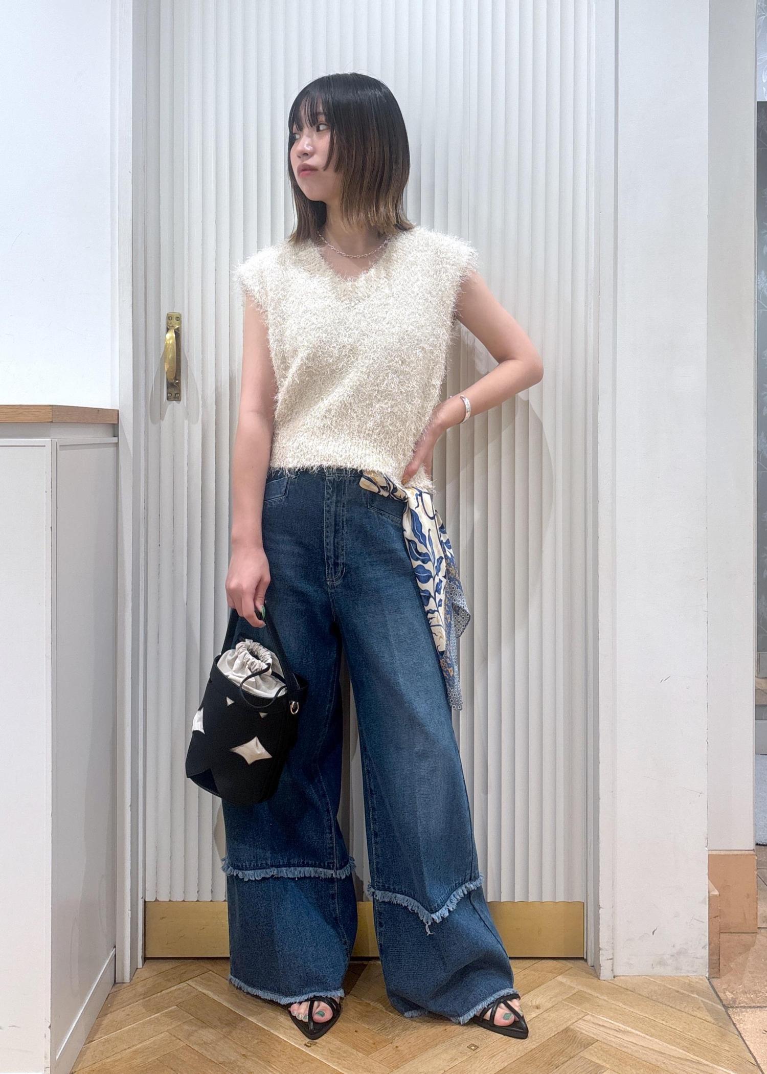 ラメ感のあるニットベストにフリンジデニムのカジュアルコーデです!2つだけだとシンプルで物足りなさがありますが、スカーフやアクセサリーで華やかさをアップさせるだけで、雰囲気がガラッと変わります!