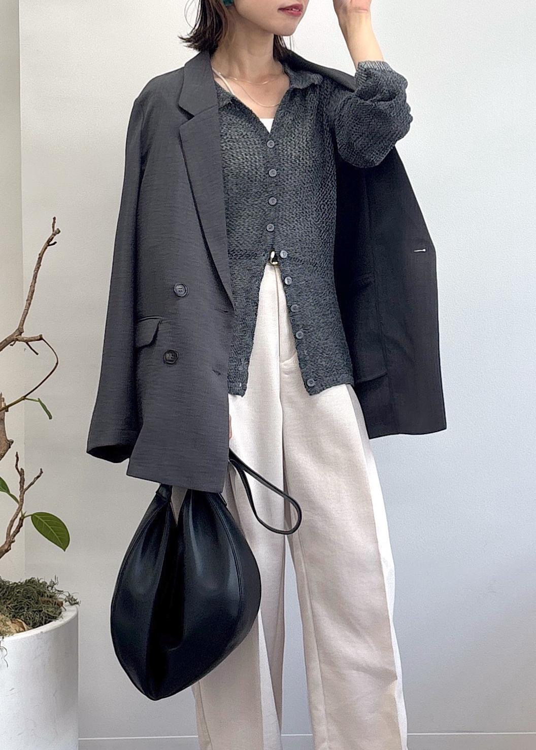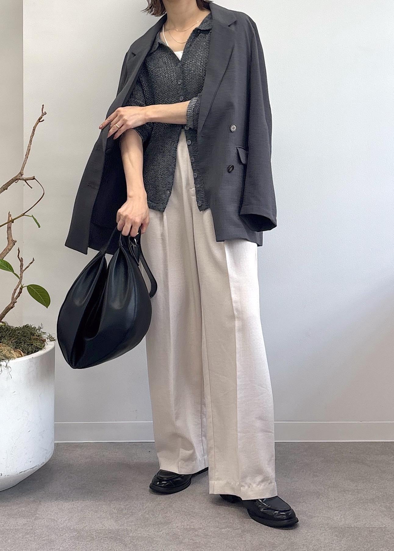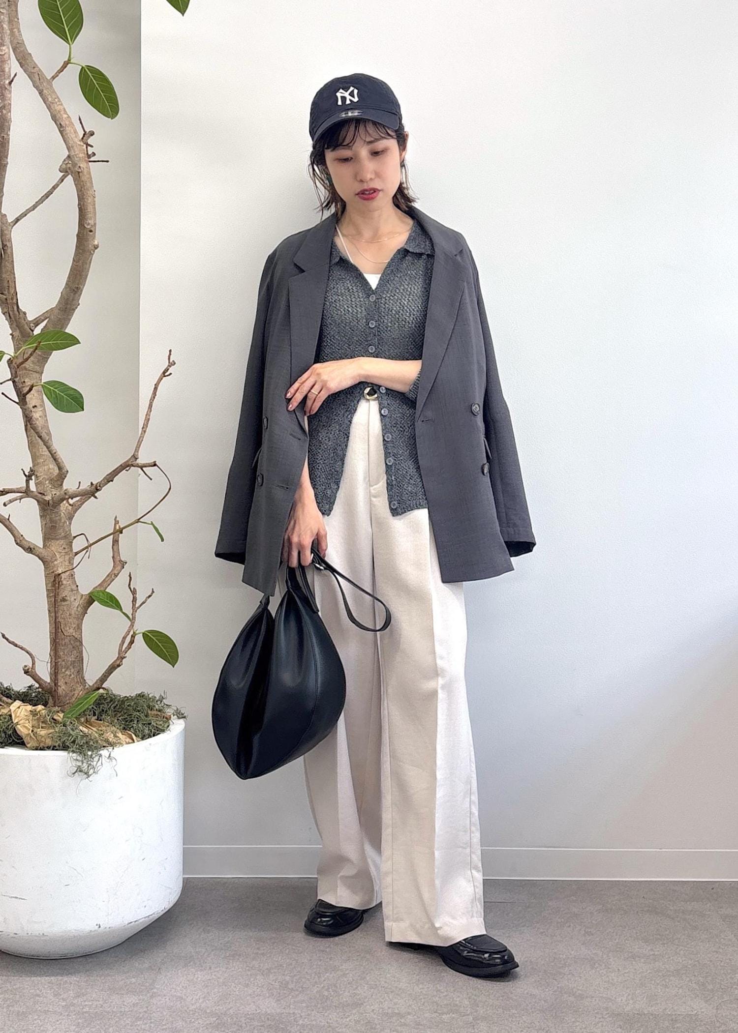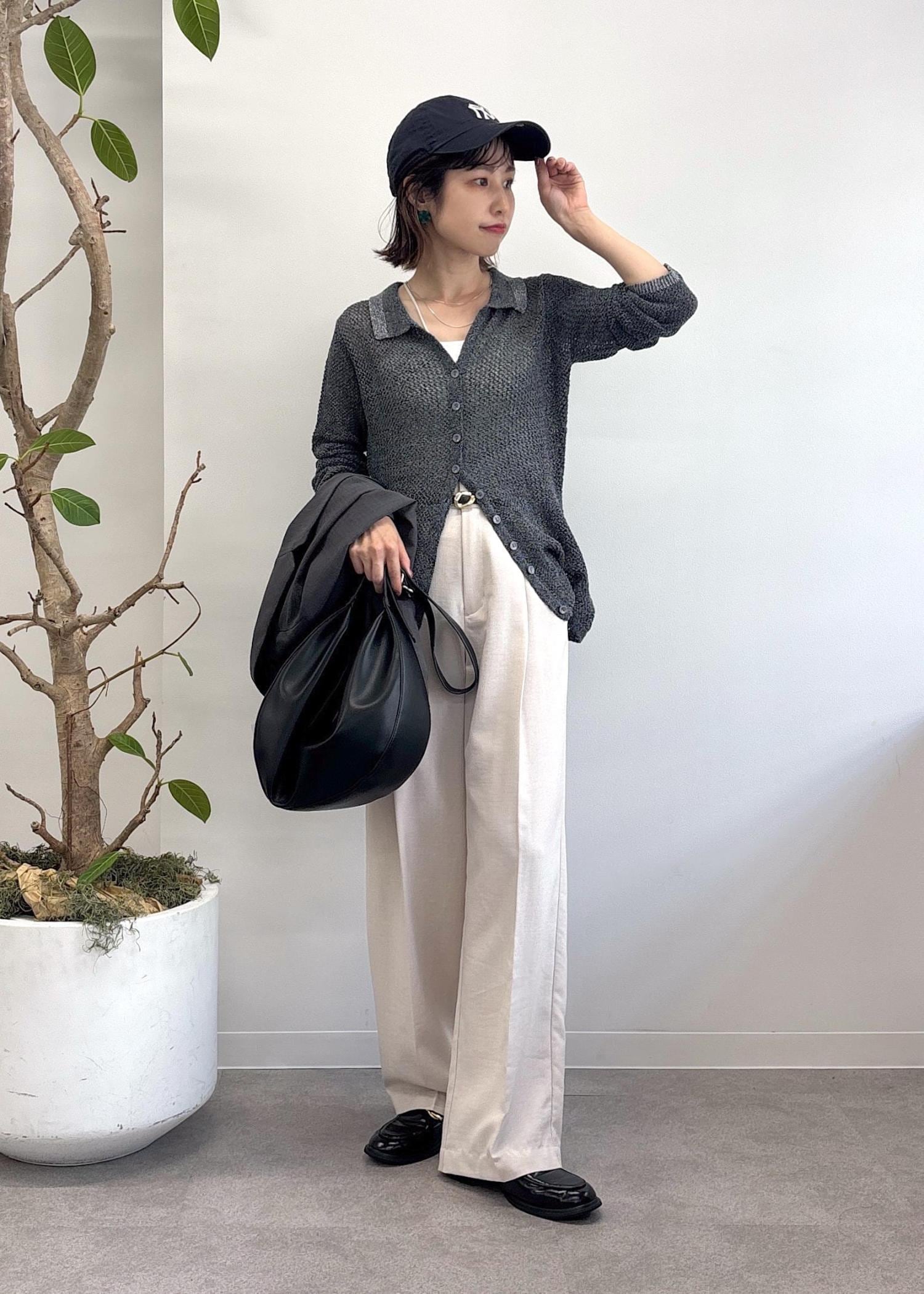大人気美easyシリーズの新色グレーのジャケットをポイントに、ポロ襟カーディガンをトップスにし、キナリのワイドパンツとキャップでまとめた休日スタイル♪接触冷感のジャケットとパンツは今から秋まで着回せる優秀アイテム達◎冷房対策としてもおすすめです。少しモードな大人カジュアルコーデ。