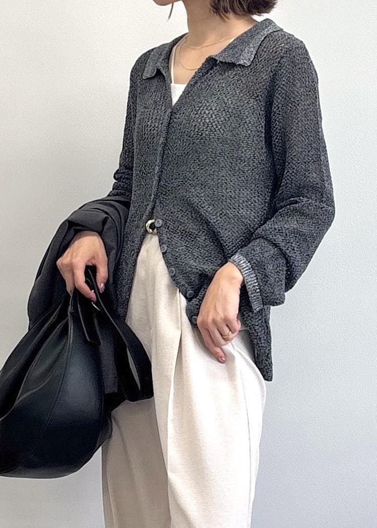 VIS【WEB/一部店舗限定】配色ラメポロ襟カーディガン/美シルエットグレー / F¥2,745レビュー今年らしいポロ襟デザインのカーディガントップス♪メッシュや配色ラメとデザイン性に拘った一枚で、着映えします◎さらっとした軽い肌あたりなので、今から秋まで活躍。裾ボタンを少し外し、抜け感を出すのがオススメです。全体的に程よくゆったりめ、着丈はお尻が半分くらい隠れる長さでした。