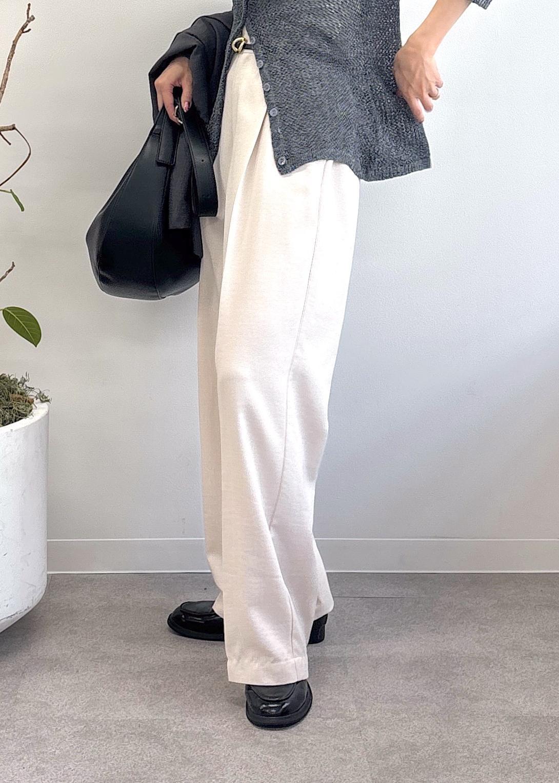 VIS【美easy】ワンタックワイドスラックスパンツ/洗えるキナリ / M¥5,489レビュー大人気の美easyシリーズ♪麻調素材でさらっとしていてとても着やすい。シワになりにくいのも嬉しいポイント◎今季は腰まわりがワンタックになり、センタープレスがよりスタイル良く見せてくれます。サンプルの為154cmでMサイズを着用、かなりゆるっとしたシルエットで長めだったので、普段はSSサイズかSサイズだと引きずらないので選びます。長めに着用を見せるならヒール5cmで床につかない着方ができるので、サイズによって雰囲気が変えられます。