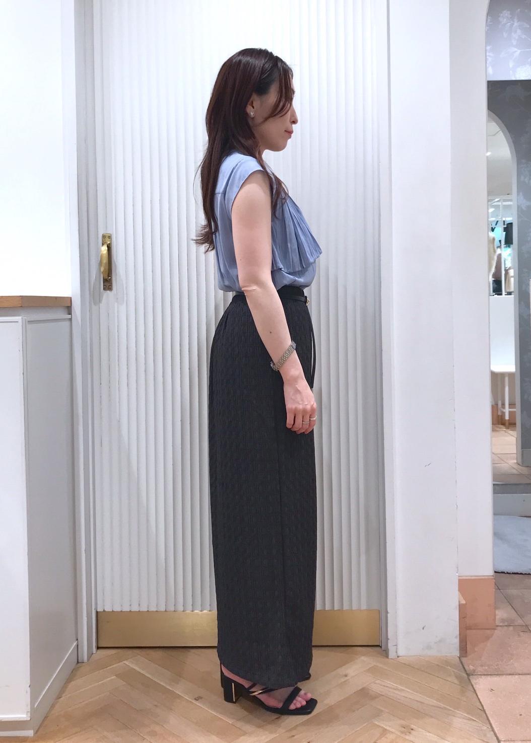 ウエストはゆとりがあり、薄手のブラウス等に合わせるとウエストが少し下がります。