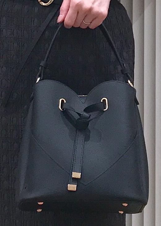 短いストラップはコートを着た状態でも肘に掛けられるくらいの長さです。 -