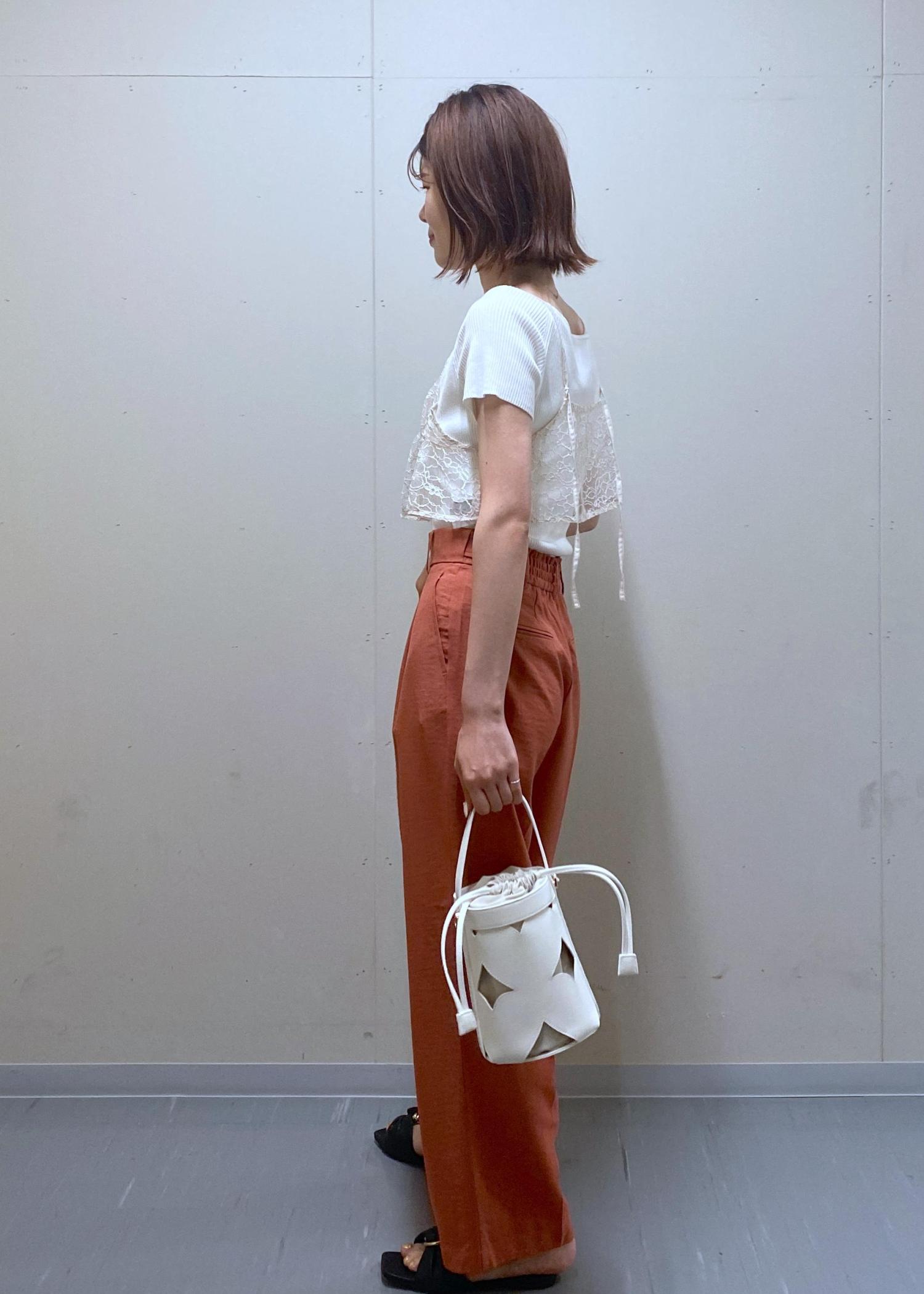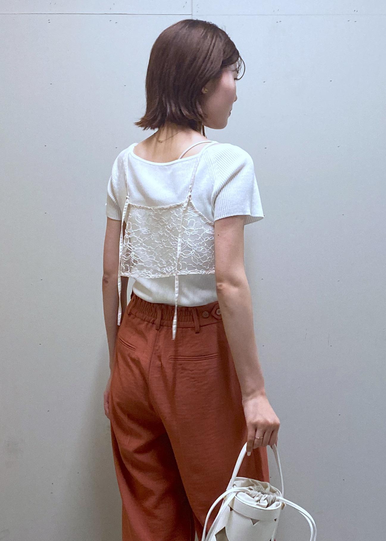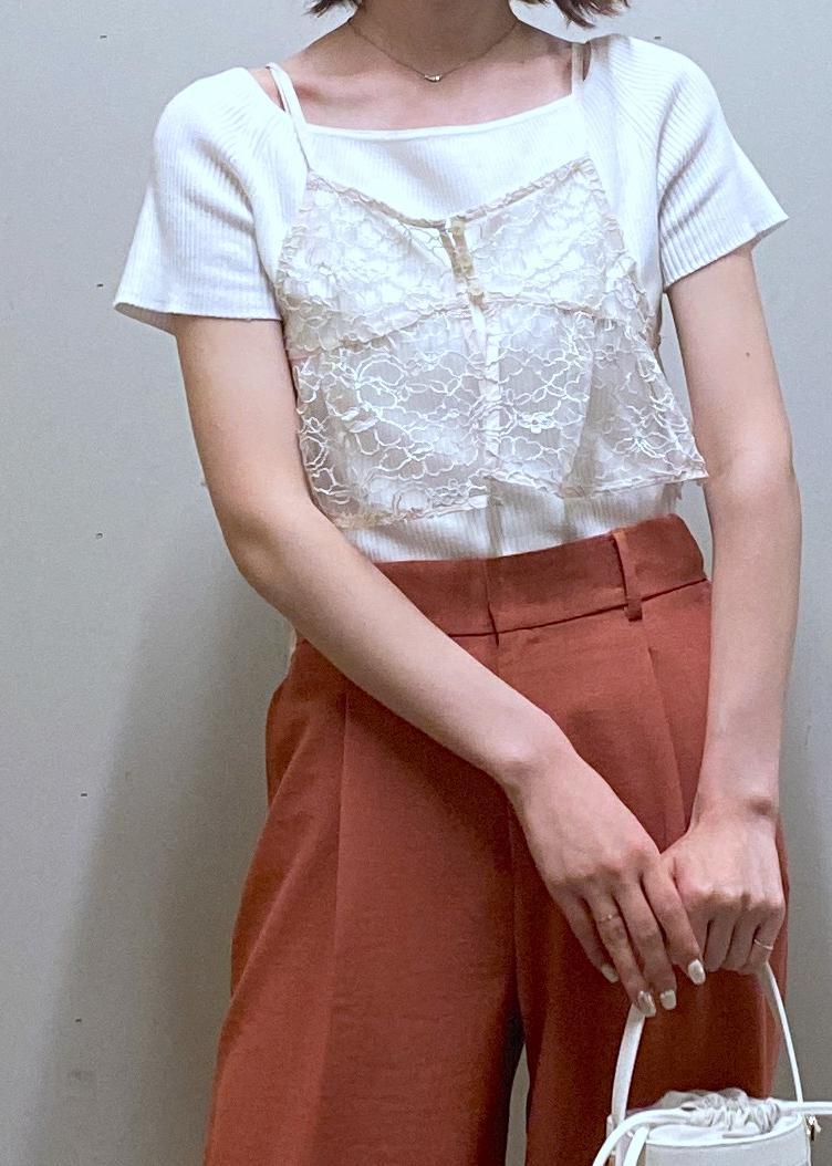 シンプルなスクエアネックニットにレース柄のビスチェを合わせたレイヤードコーデです!