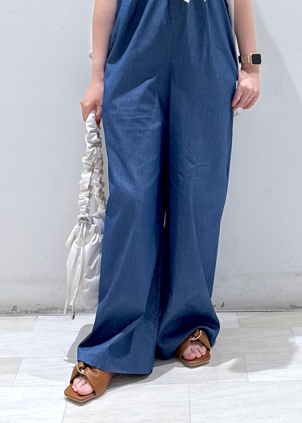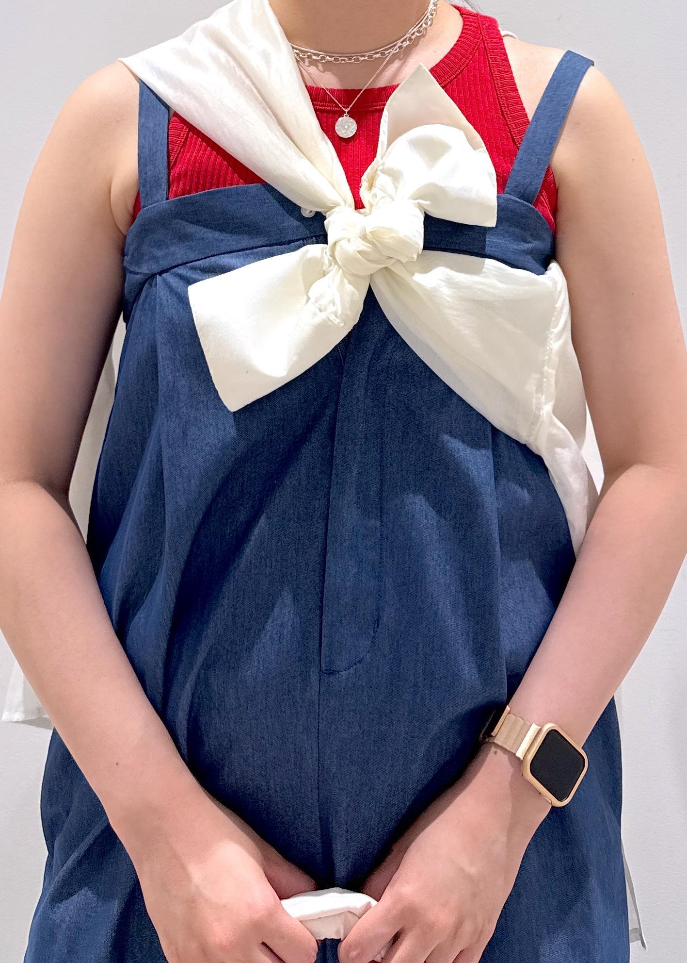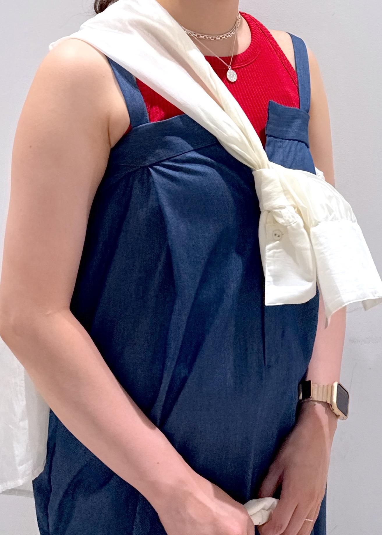 ゆったりとした余裕のあるデニムのオールインワン。デニムにしては生地は厚すぎず、デニムライクの薄い素材なので重たくないですし動きやすいです。チラッと見えるインナーの赤を差し色として使っているので可愛いと思います。