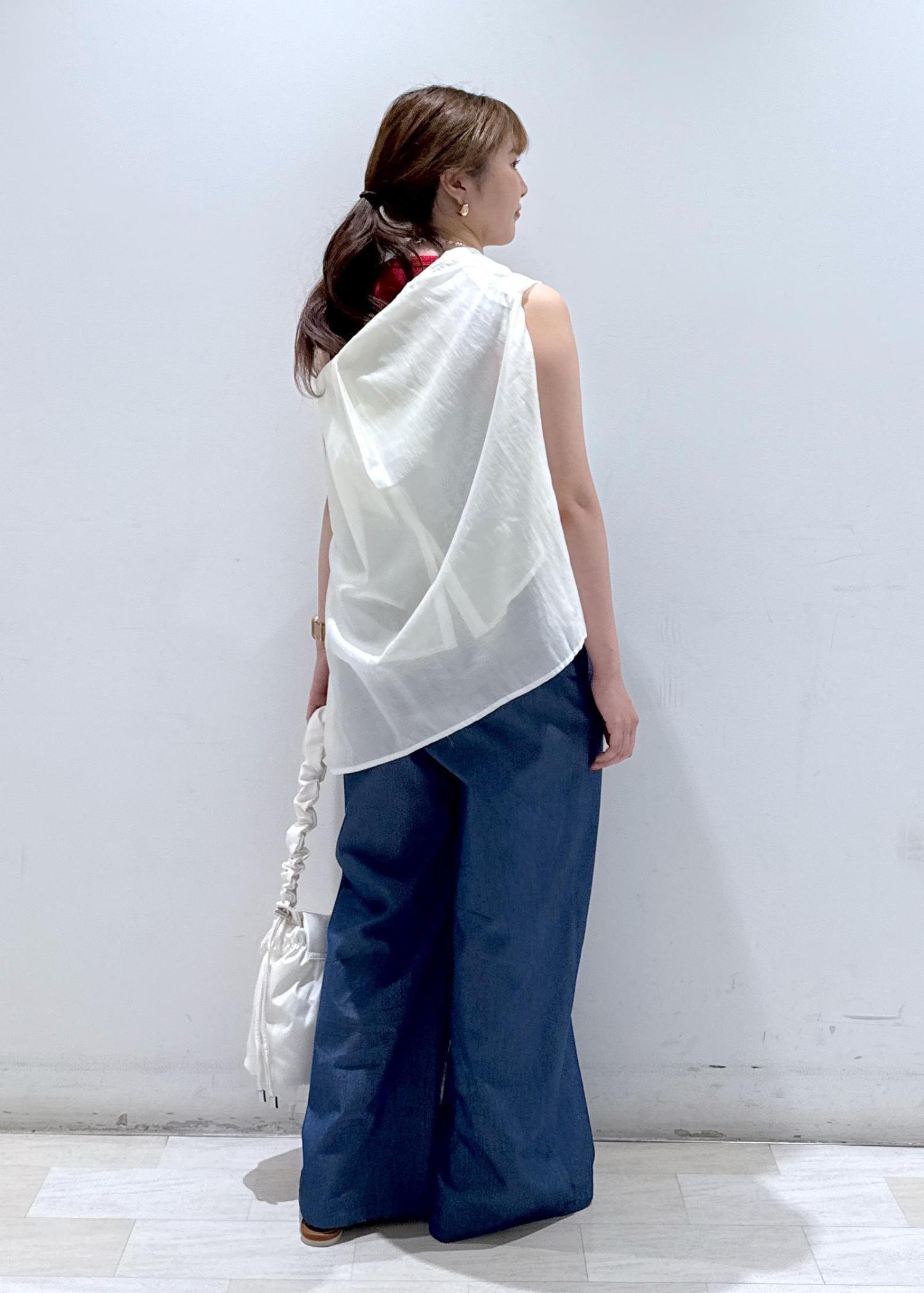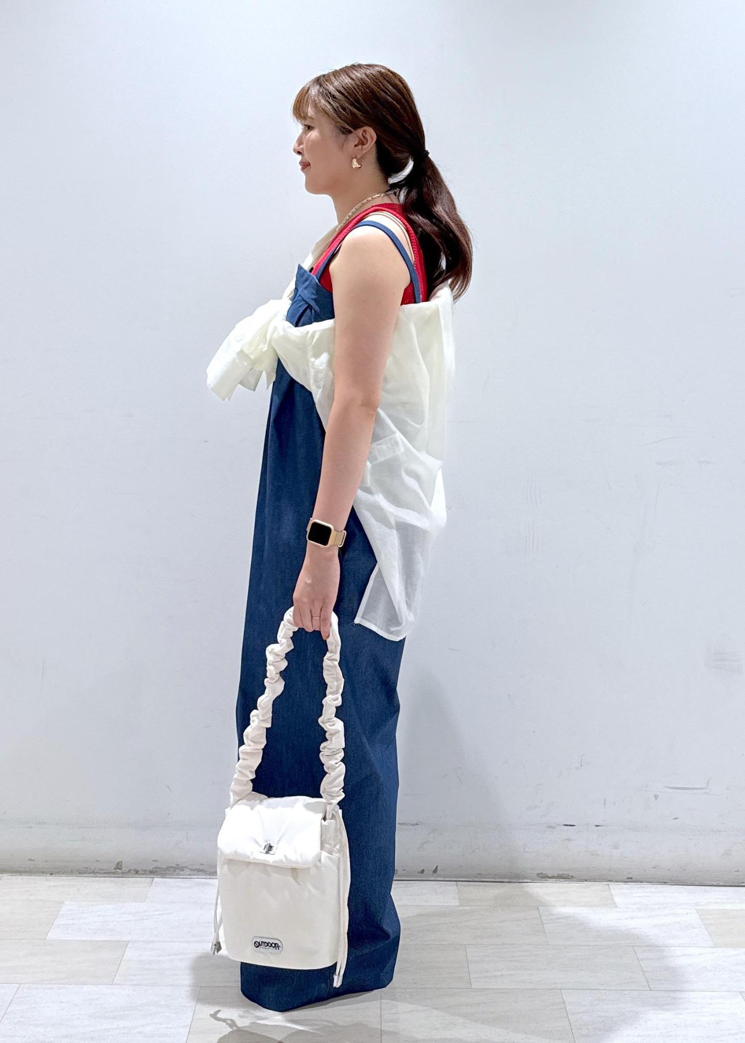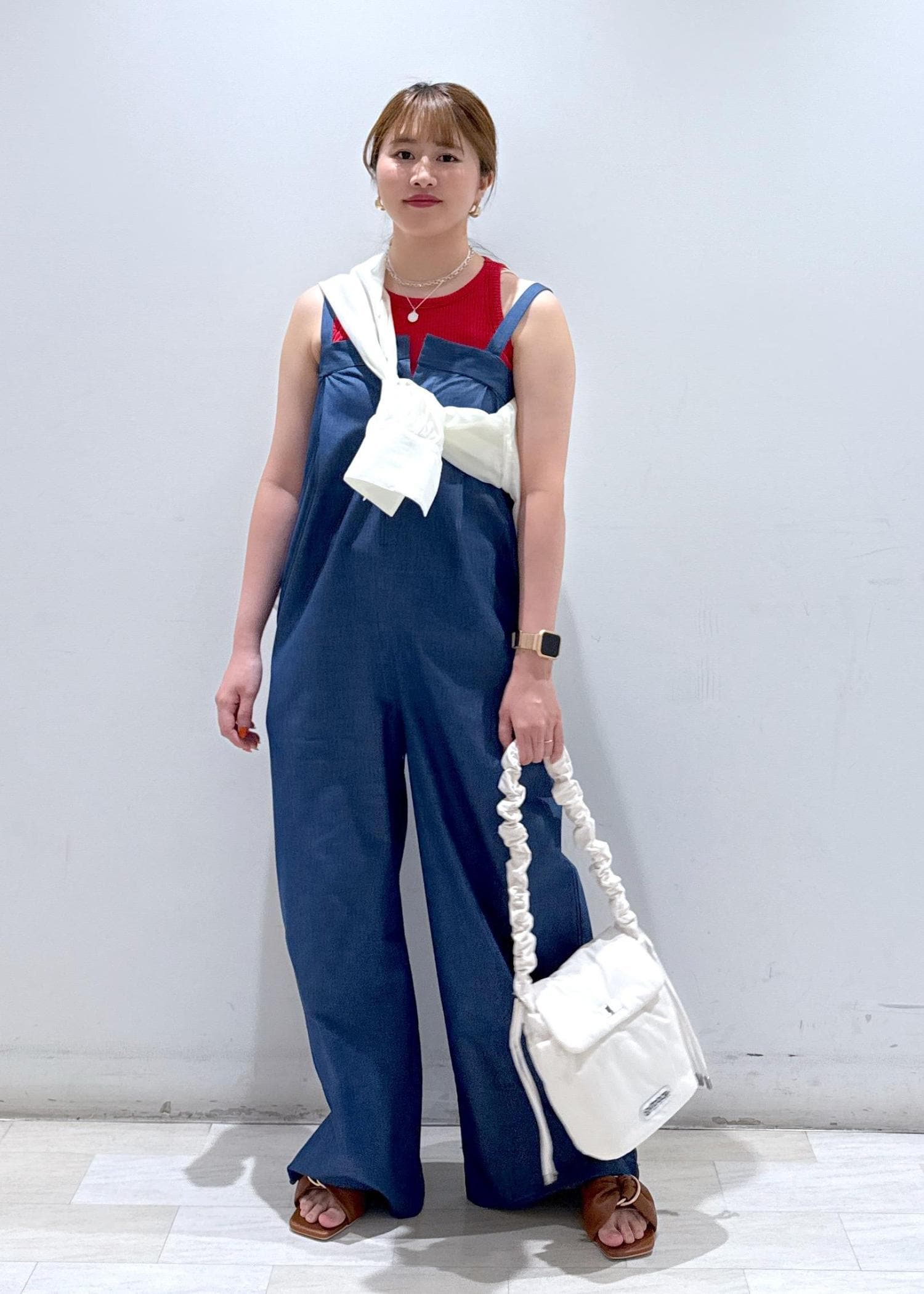 ゆったりとした余裕のあるデニムのオールインワン。デニムにしては生地は厚すぎず、デニムライクの薄い素材なので重たくないですし動きやすいです。チラッと見えるインナーの赤を差し色として使っているので可愛いと思います。