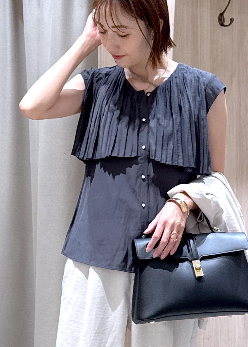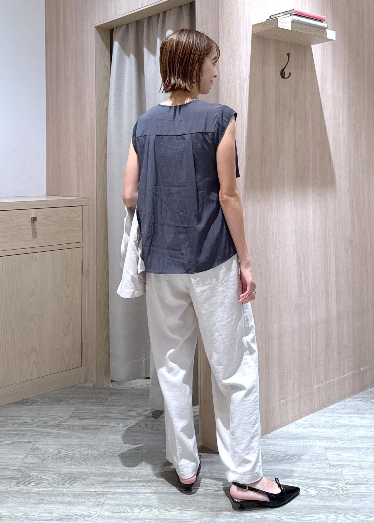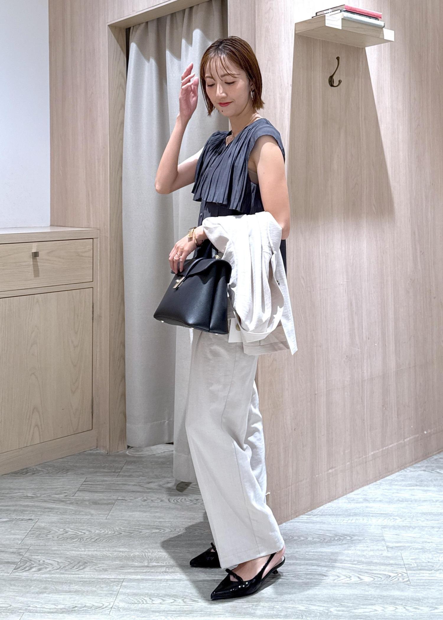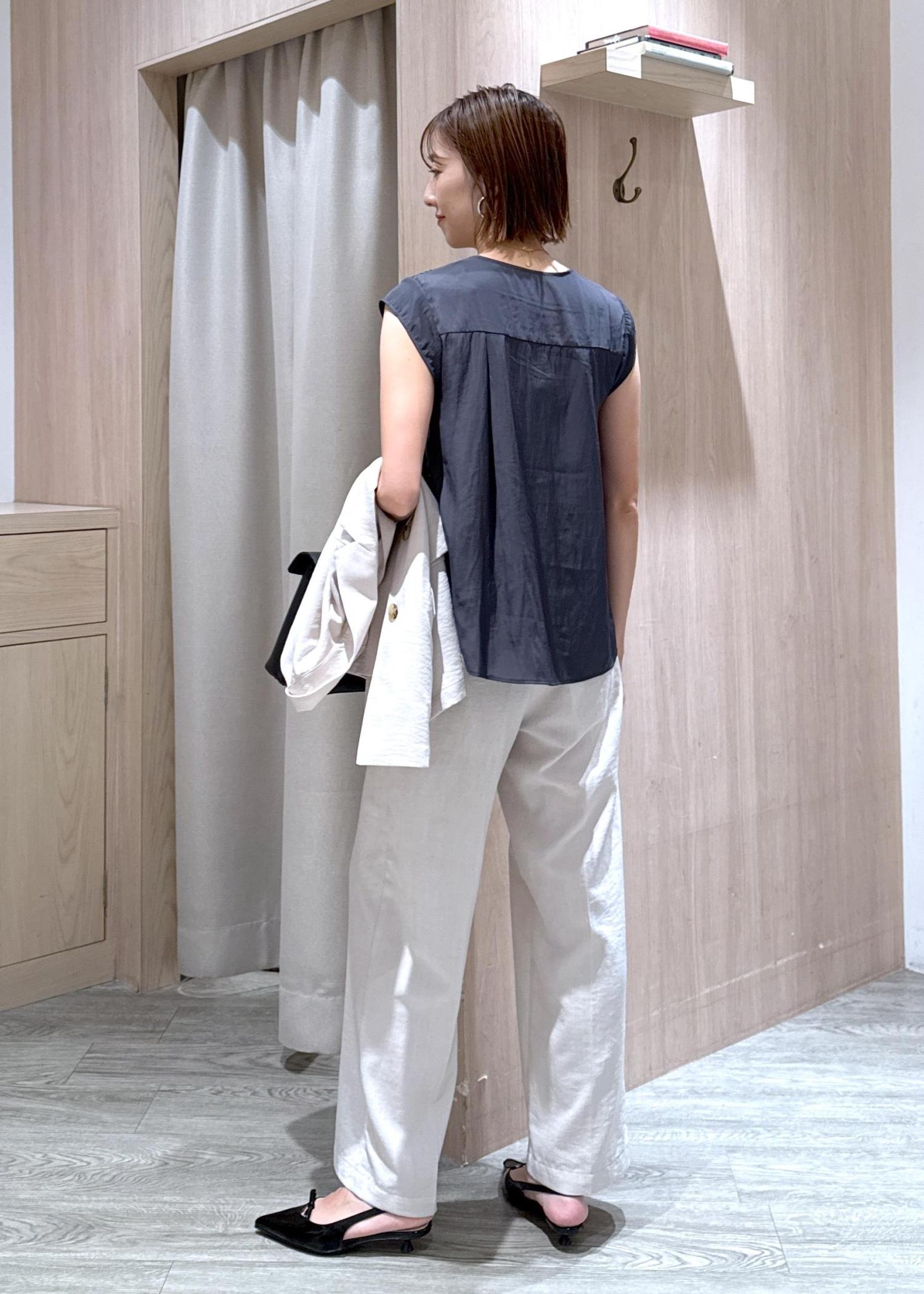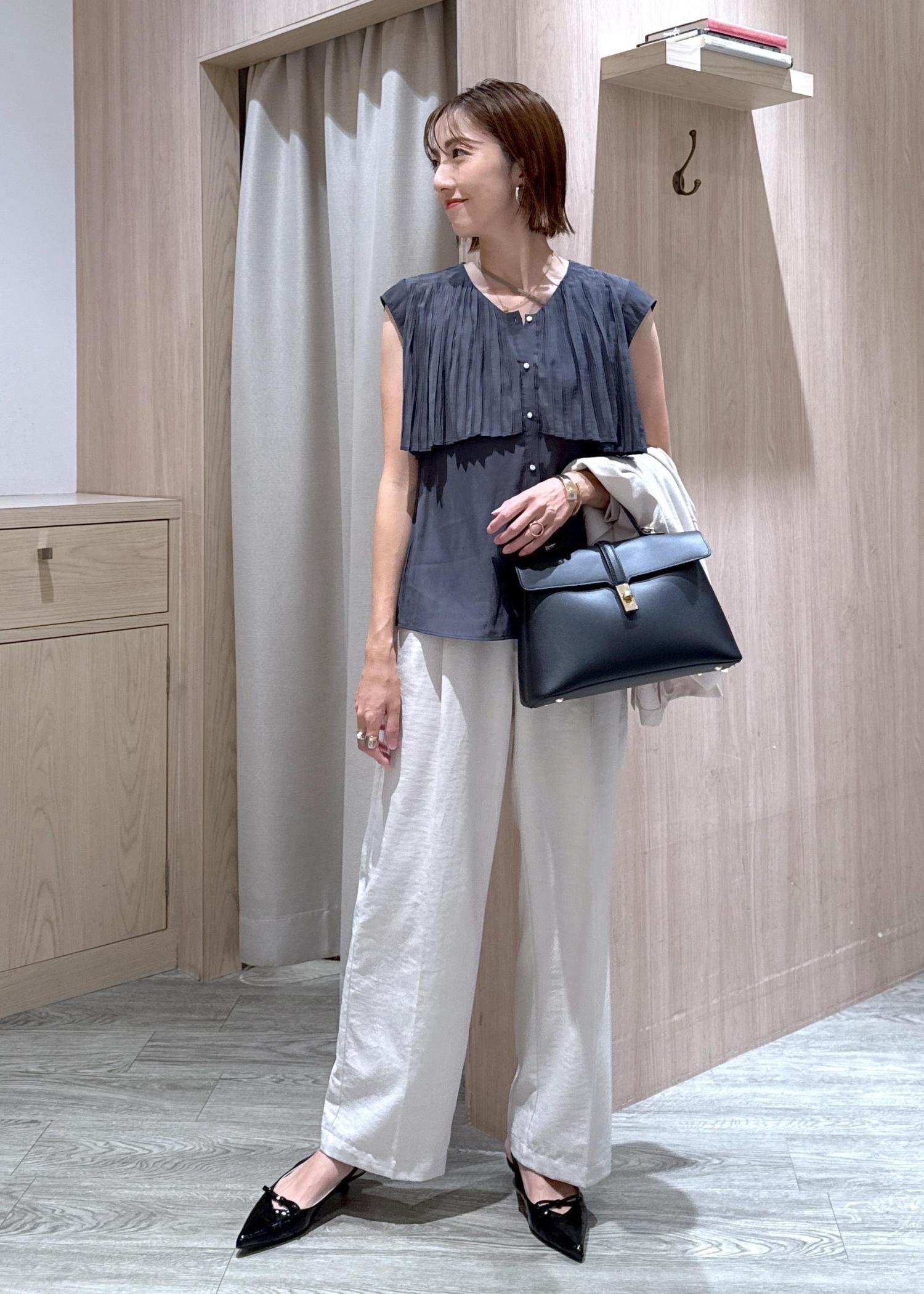 美easyセットアップにプリーツブラウスを合わせた夏の通勤スタイルです!