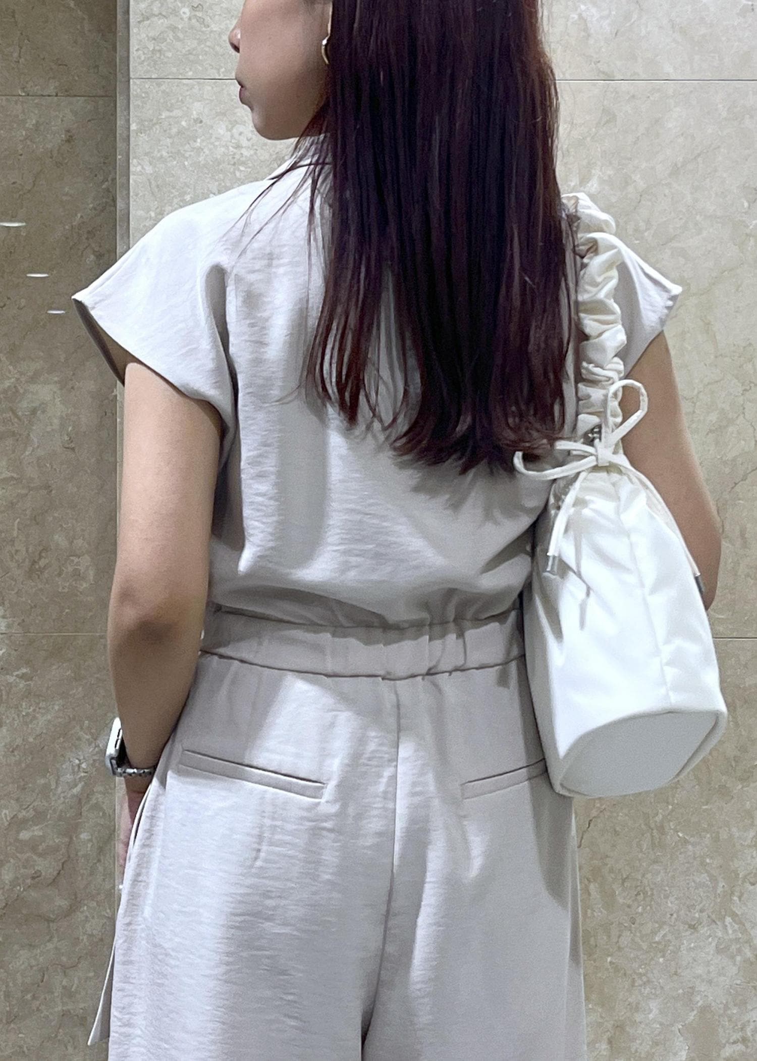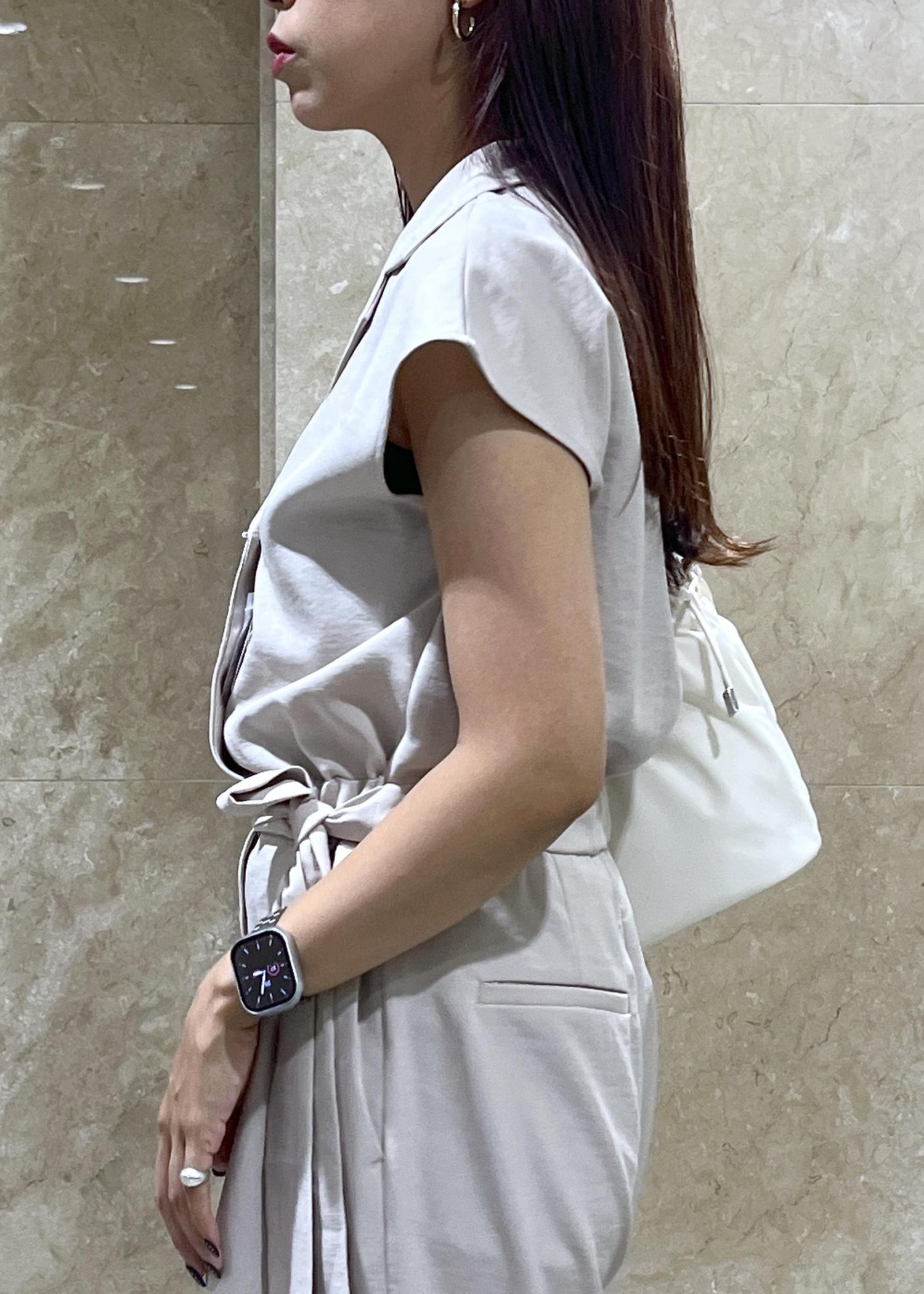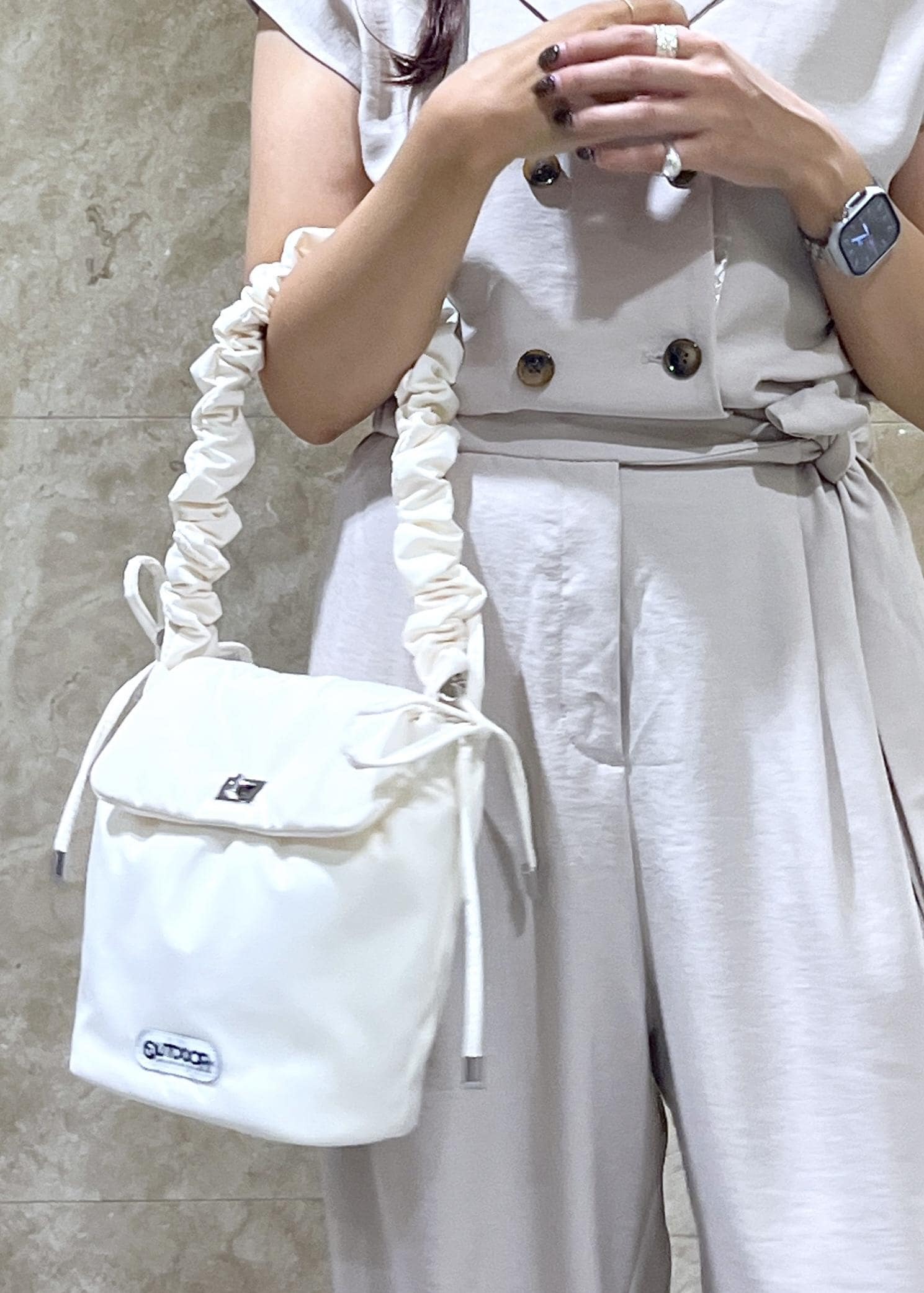 ハンドル部分がクシュクシュと長さを調整できるので、斜めがけはもちろん、手持ちであまる紐部分をリボン結びにして長く垂らしても可愛い。 -