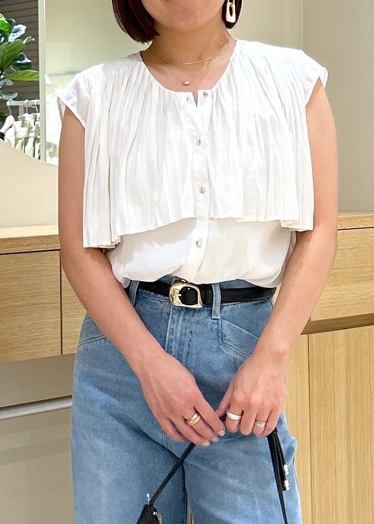 ゴールドの変形バックルがコーデのポイントになります。 -