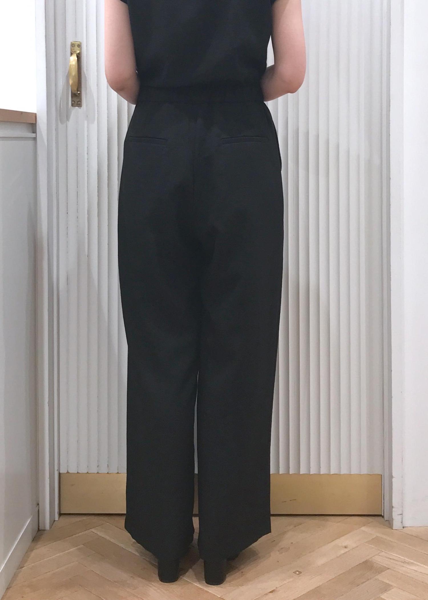 身幅はピッタリし過ぎず、ウエスト部分はゴムの切り替えなのでスッキリしたシルエットで着用出来ます。