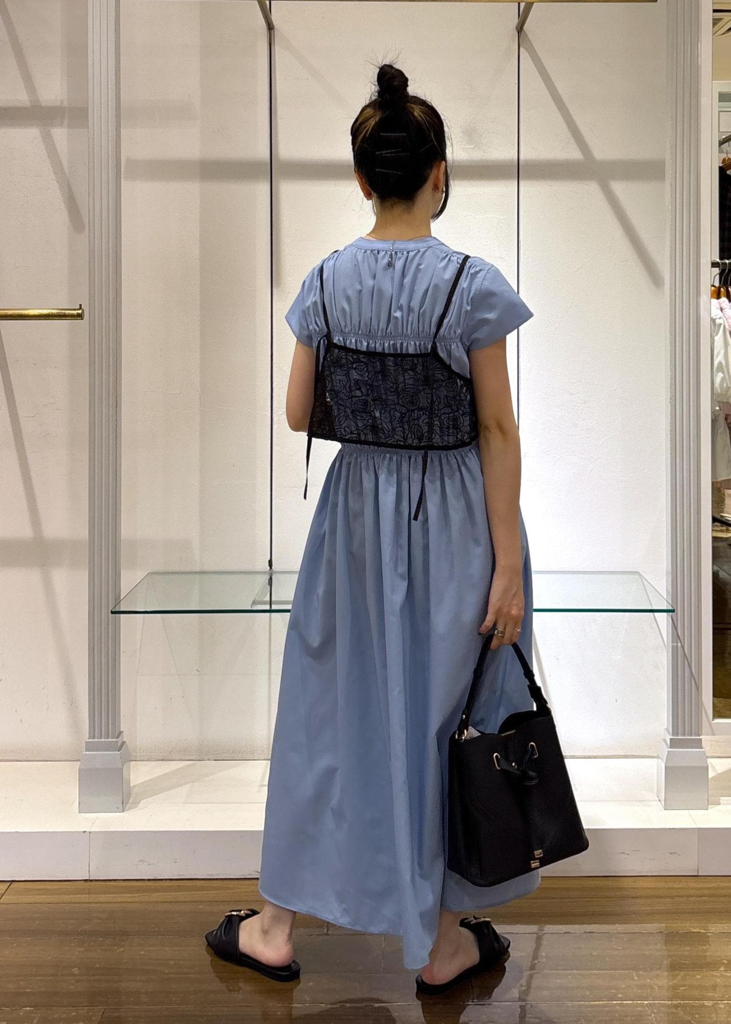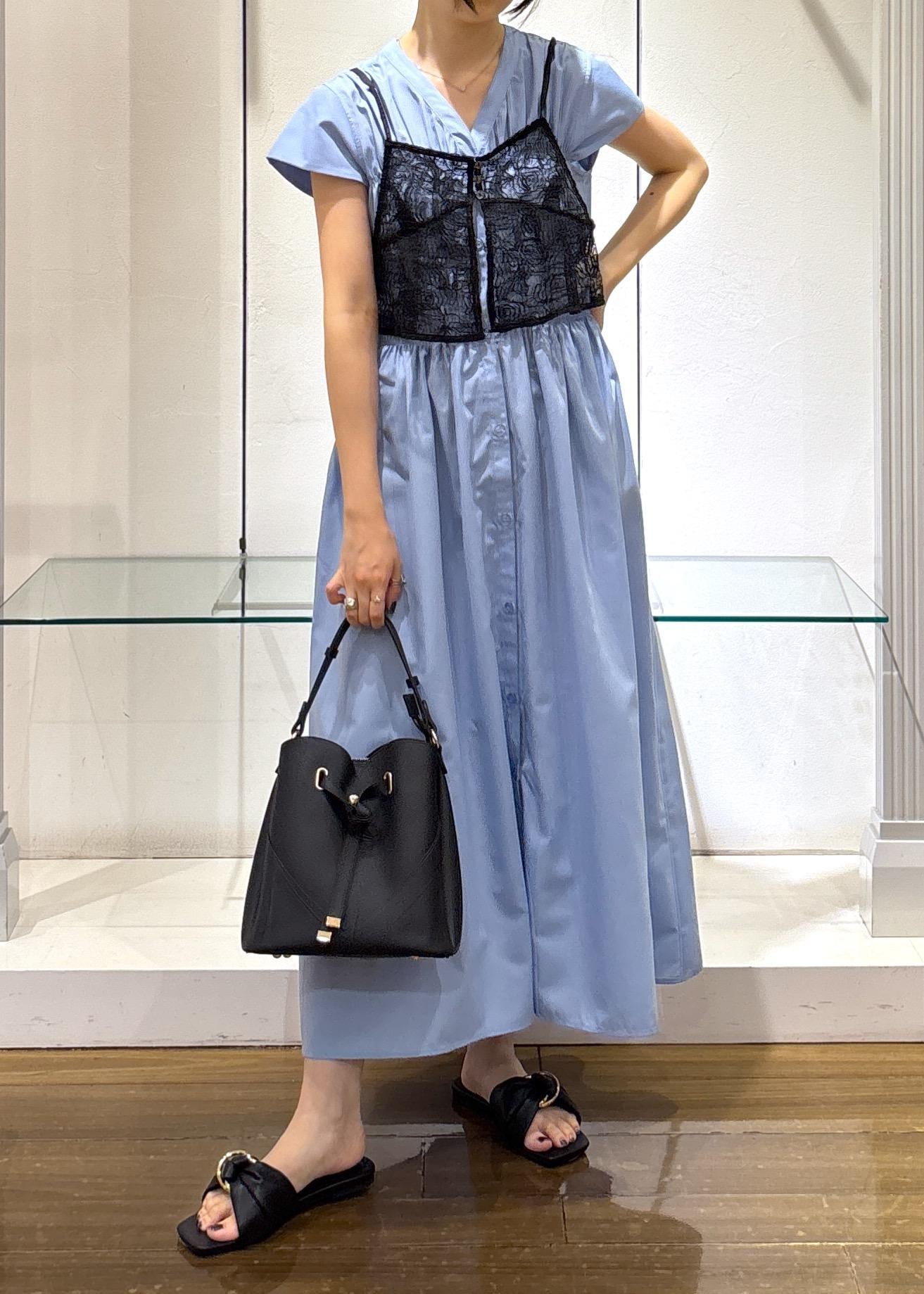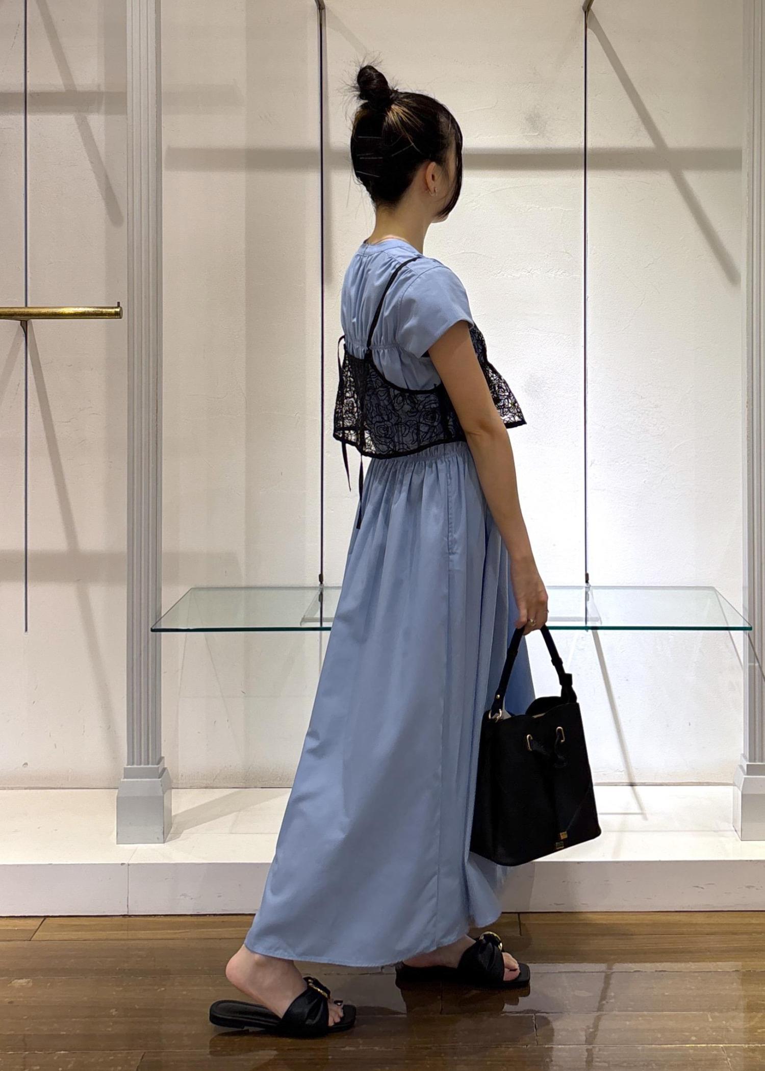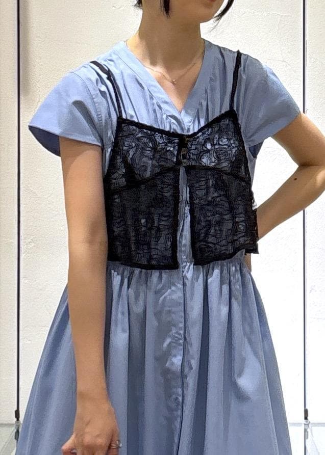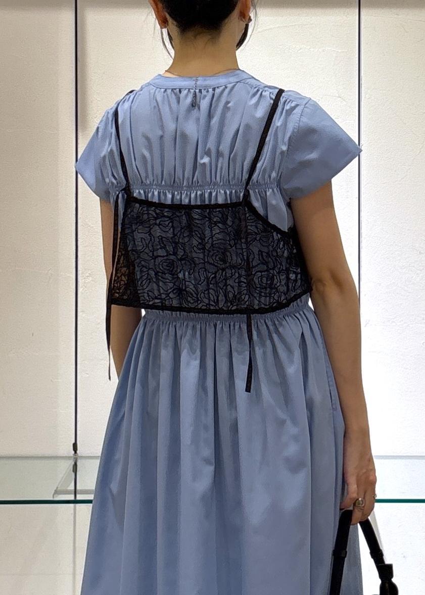 シャーリングが可愛いワンピースはそのまま着ても着映えできますが、少し物足りなさを感じたのでレースビスチェを重ねてみました!