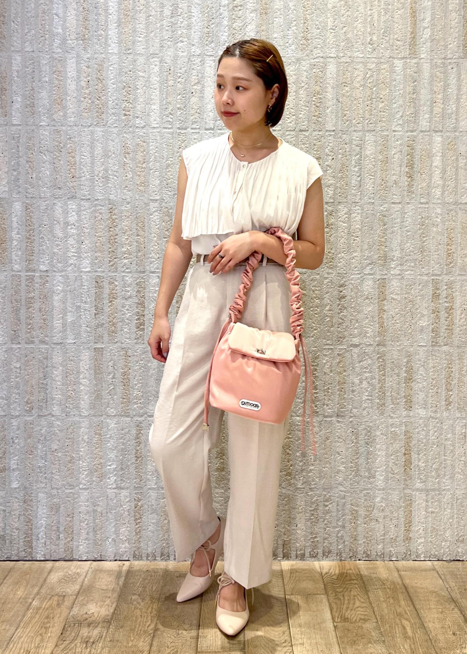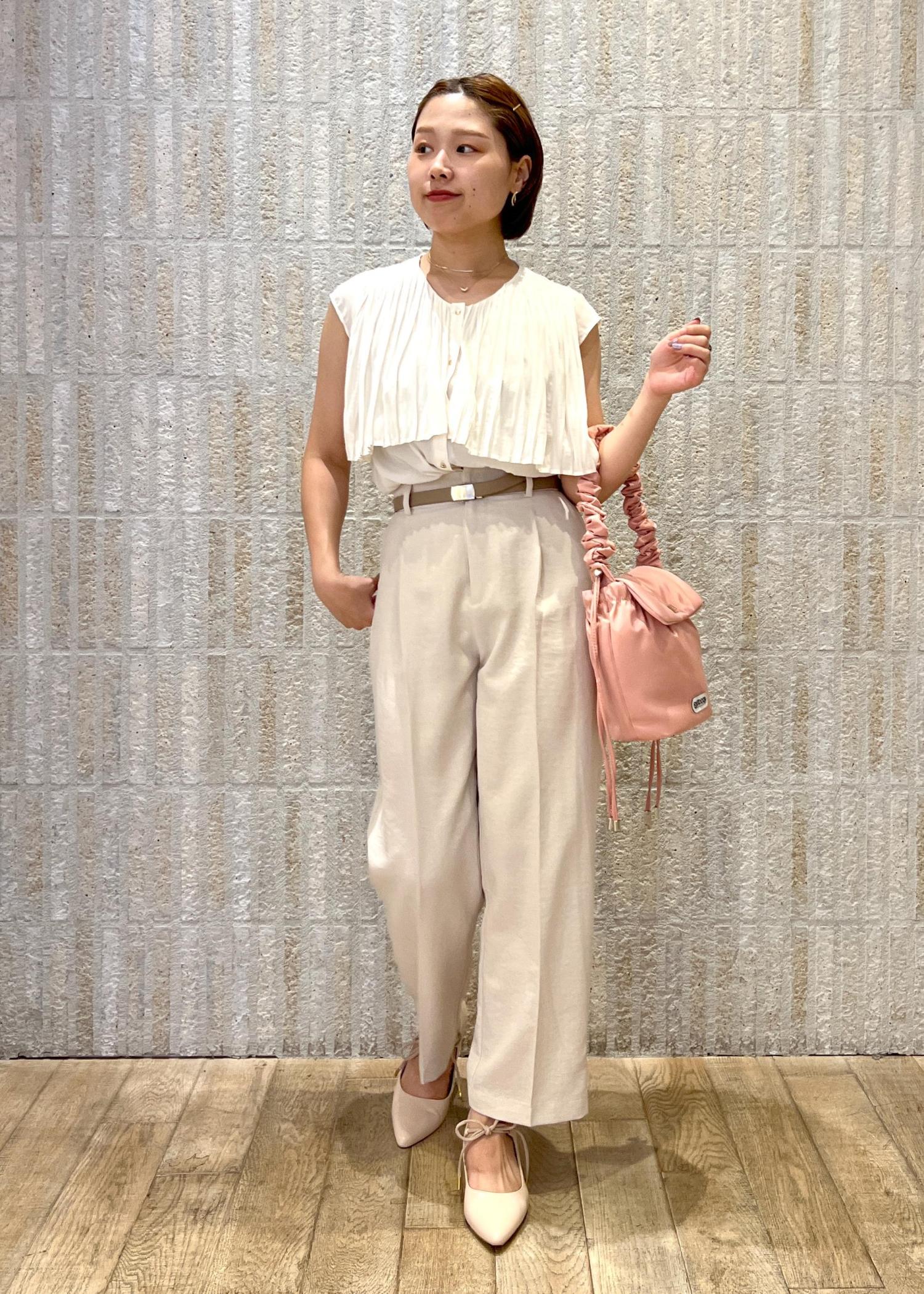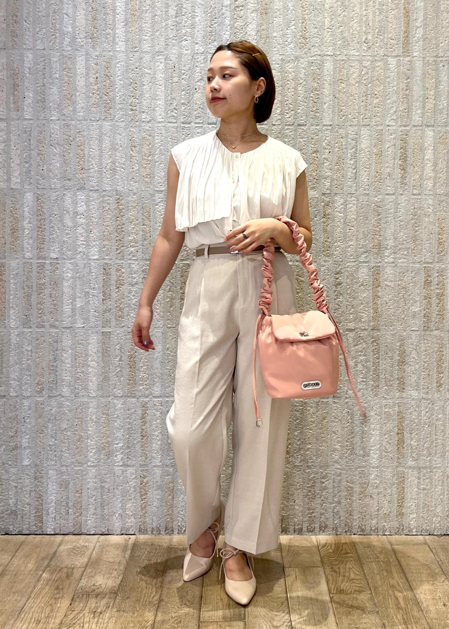 明るいお色味ですので、トップスはシンプルなものでも、コーデ全体を華やかにしてくれます。