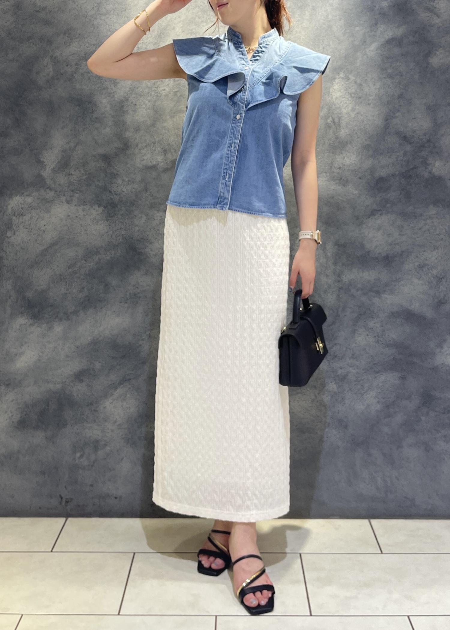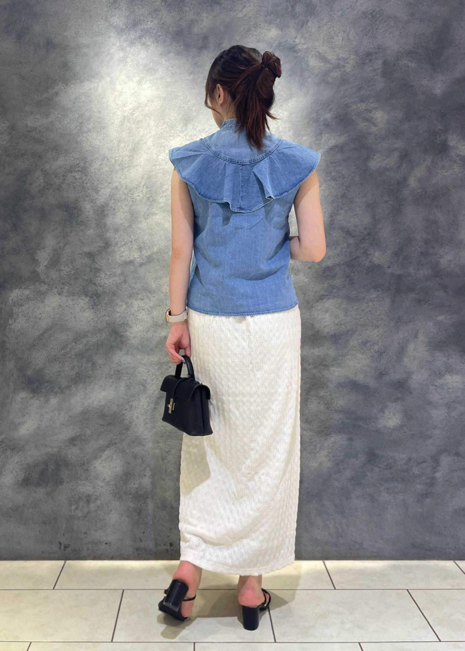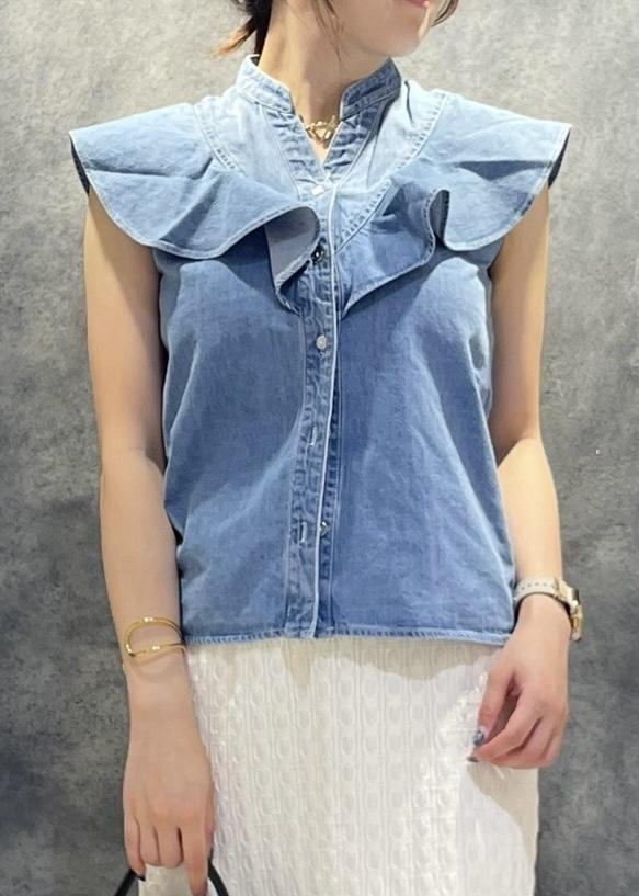 VIS【UVケア/洗える】ラッフルデザインデニムブラウスサックス / F¥3,953レビューフリルにハリ感があり形がしっかりと出ます!