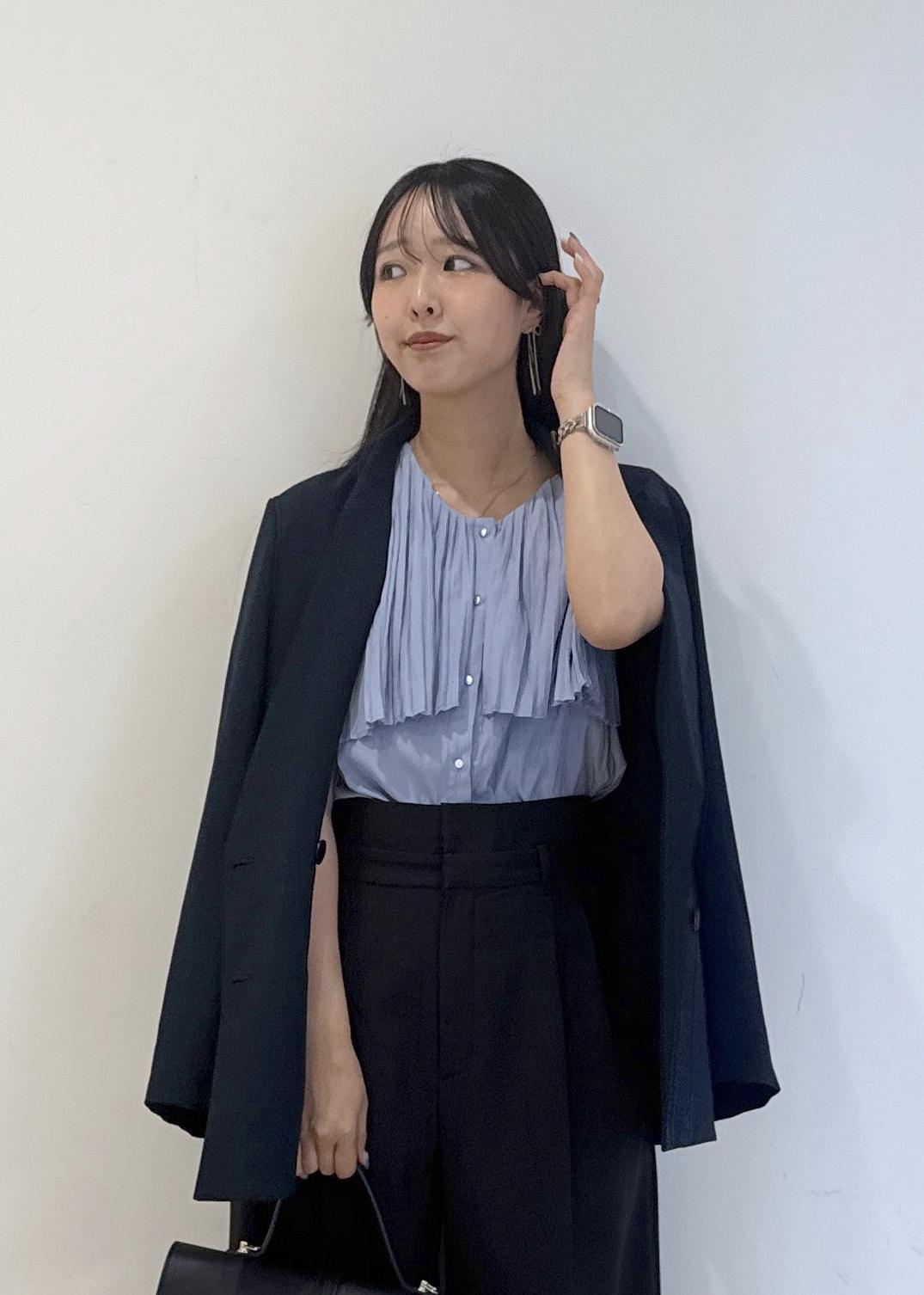 シンプルすぎないデザインのブラウスは、ジャケットを羽織っても脱いでもオシャレです◎