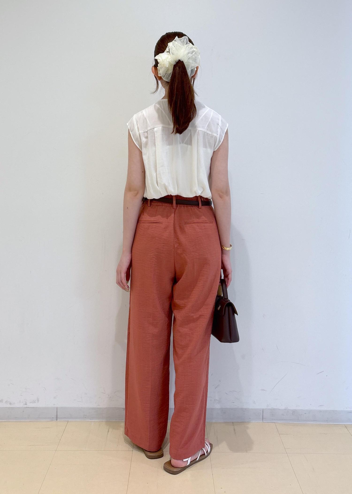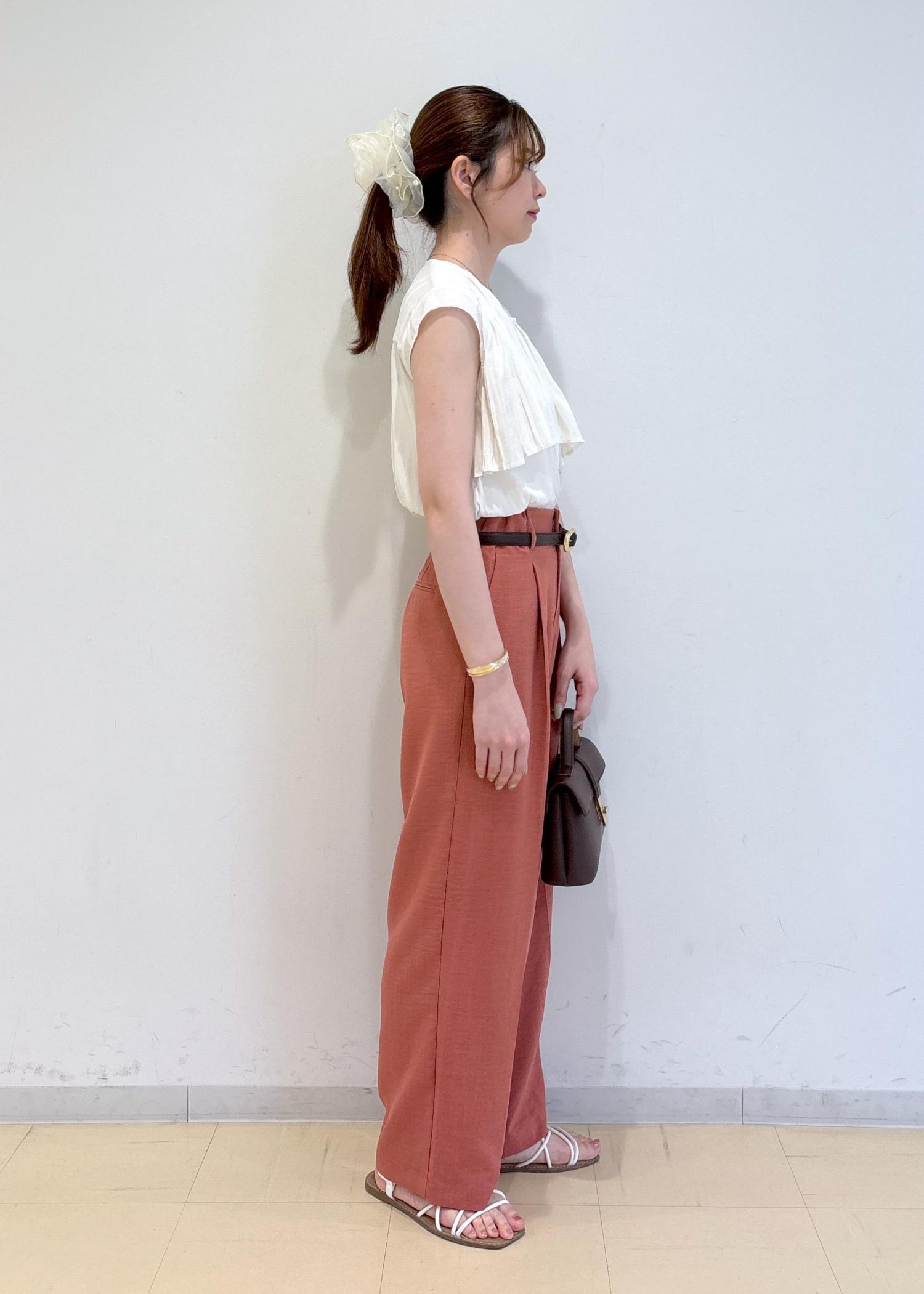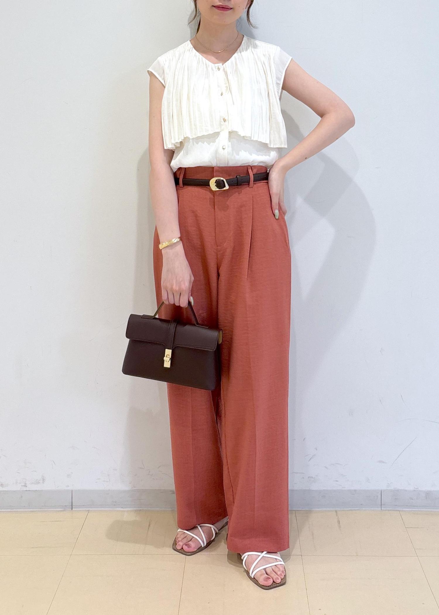 トップスはプリーツの揺れるデザインが可愛く、つるっとした素材感で女性らしい印象です。