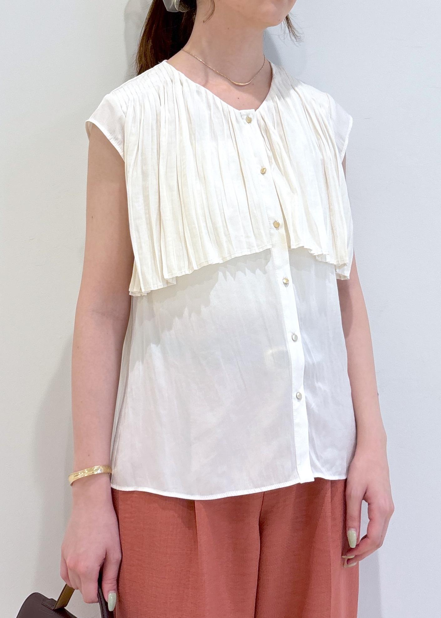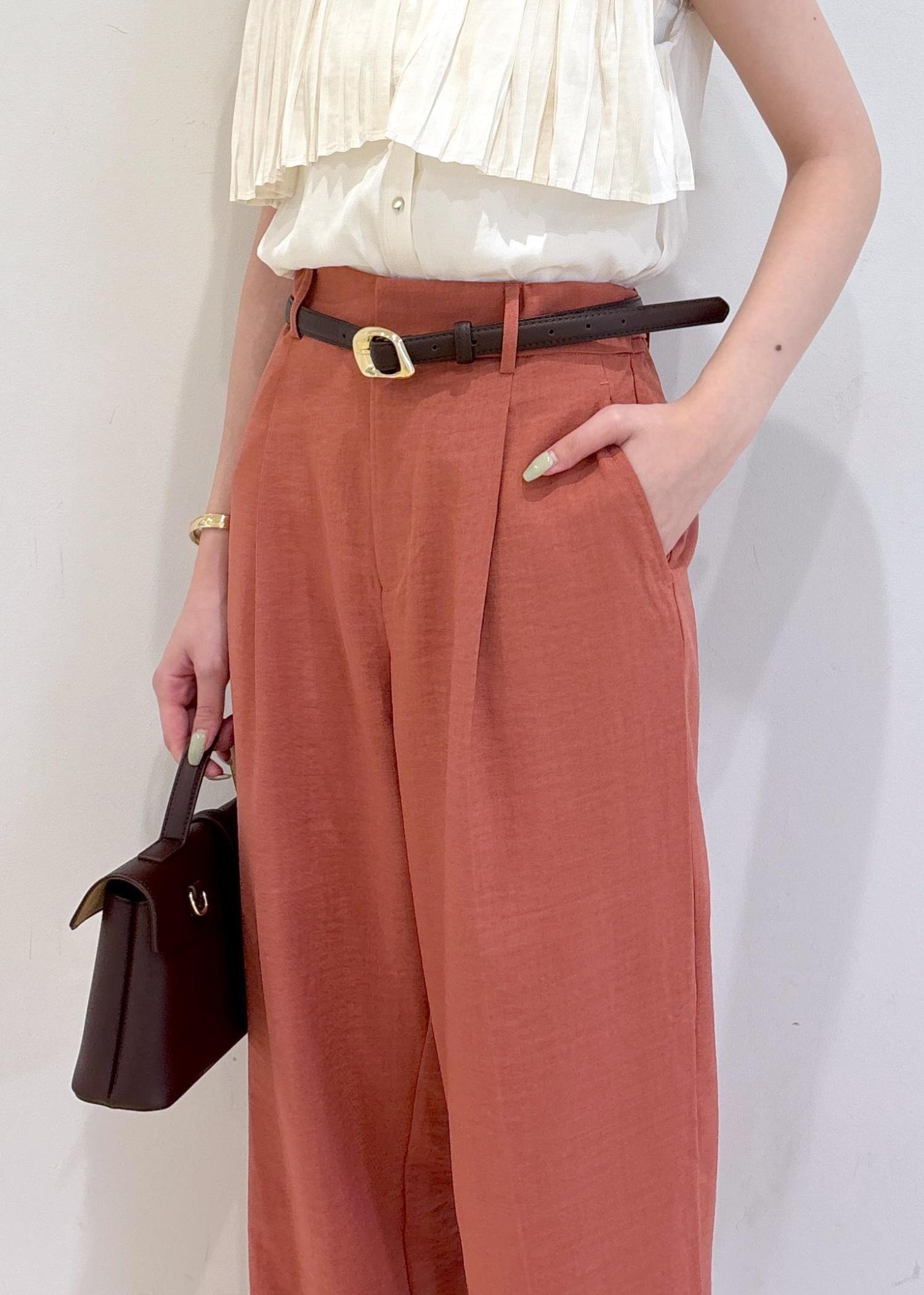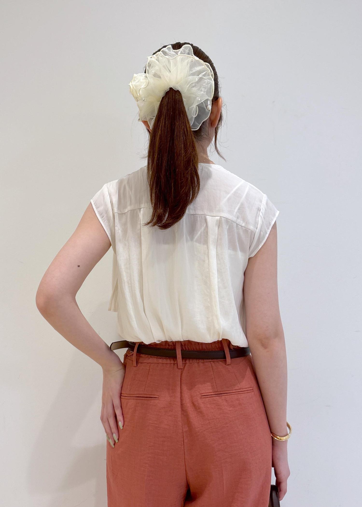 トップスはプリーツの揺れるデザインが可愛く、つるっとした素材感で女性らしい印象です。