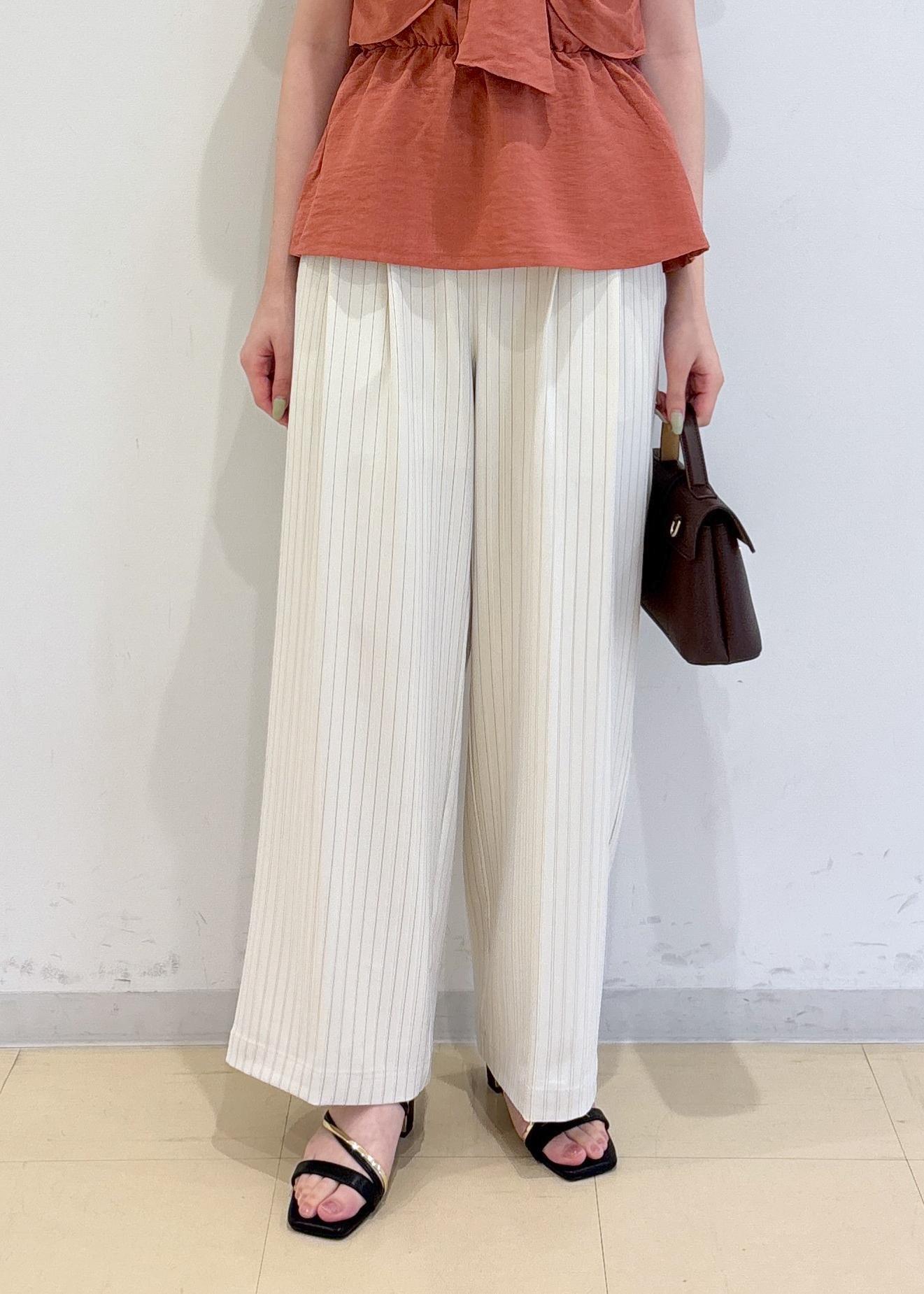 アウトレットVIS【接触冷感/UVケア】ピンストライプリラックスワイドパンツキナリ / M¥2,636レビューさらっとしていて、ウエストゴムなので履き心地楽でした。163センチで足首隠れるちょうど良い丈感でした。