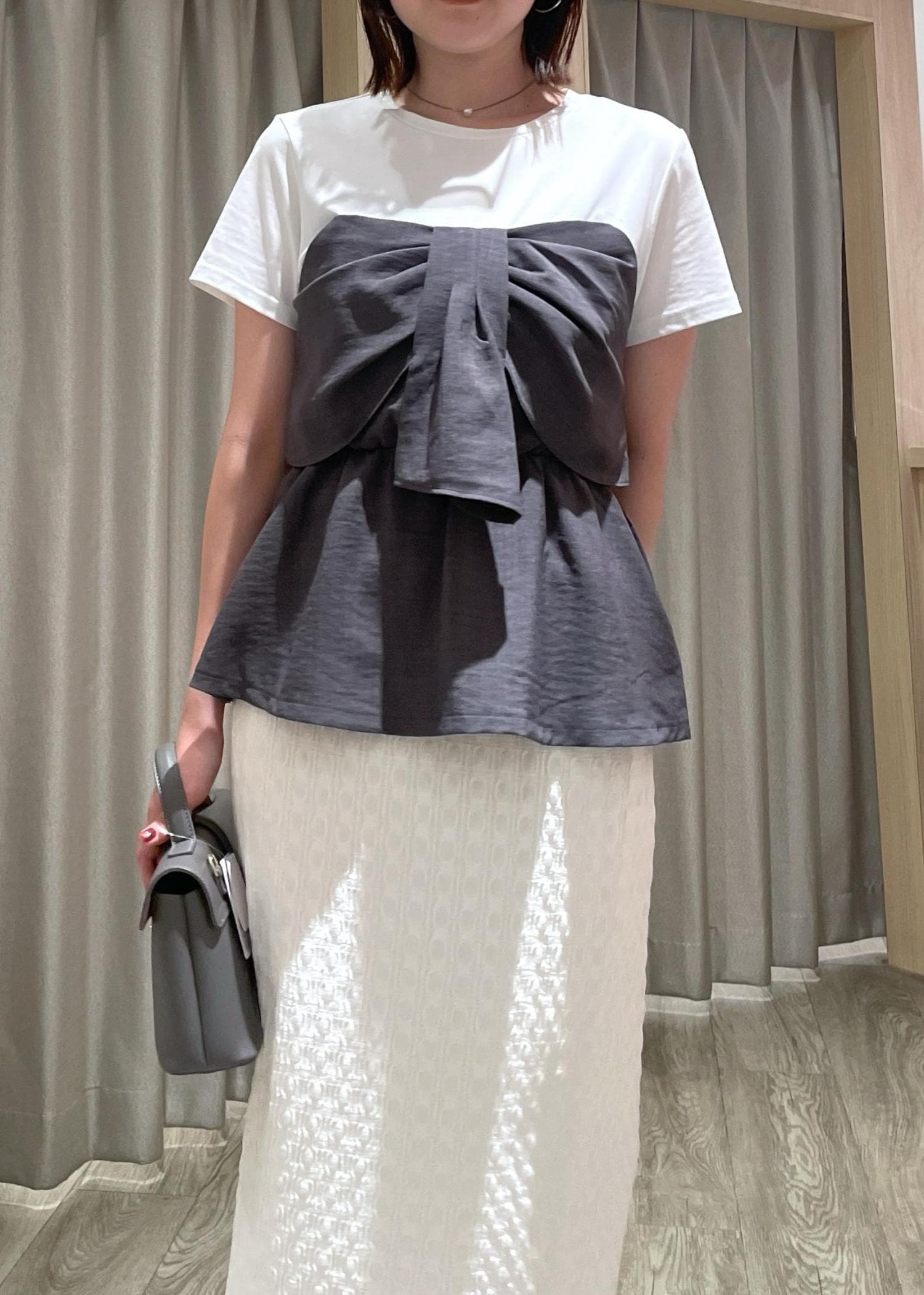 トレンドのビスチェデザイン、ドッキングなので楽にお洒落ができるアイテムです。フロントは大きめリボンで華やかな印象になるので、シンプルボトムと合わせても着映えします!身長159cmでヒップにかから着丈、ボトムも選ばず合わせやすいです◎ -
