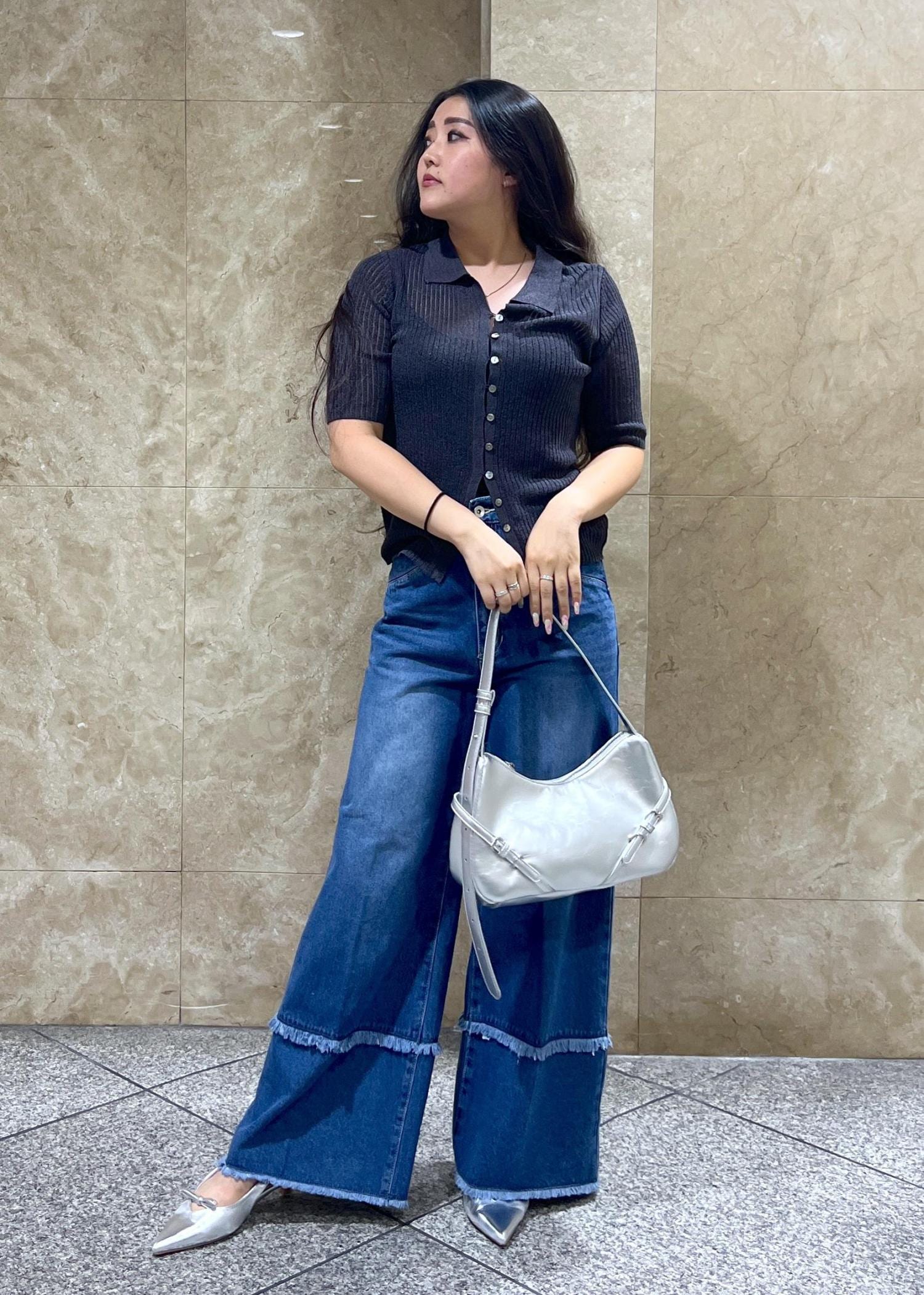 デニムフリンジ付きが出ました、、、可愛い広がり感が可愛くて体感ちょっと薄め生地で夏場に良いです◎調子に乗ってsサイズ履きましたがムチがヤバめです、、、、なので、155cm体型が細身ではない方Mをオススメしたいです^^;