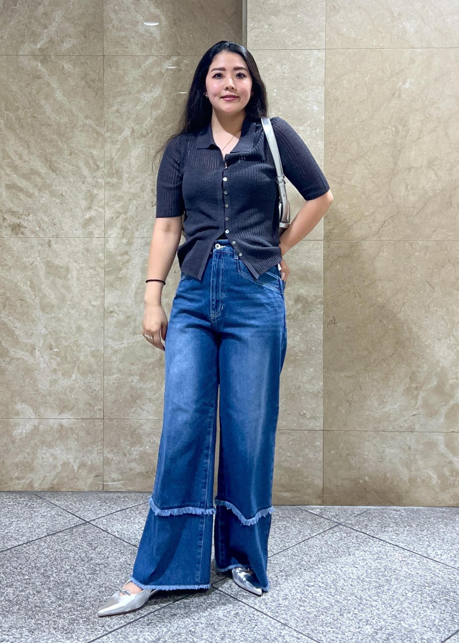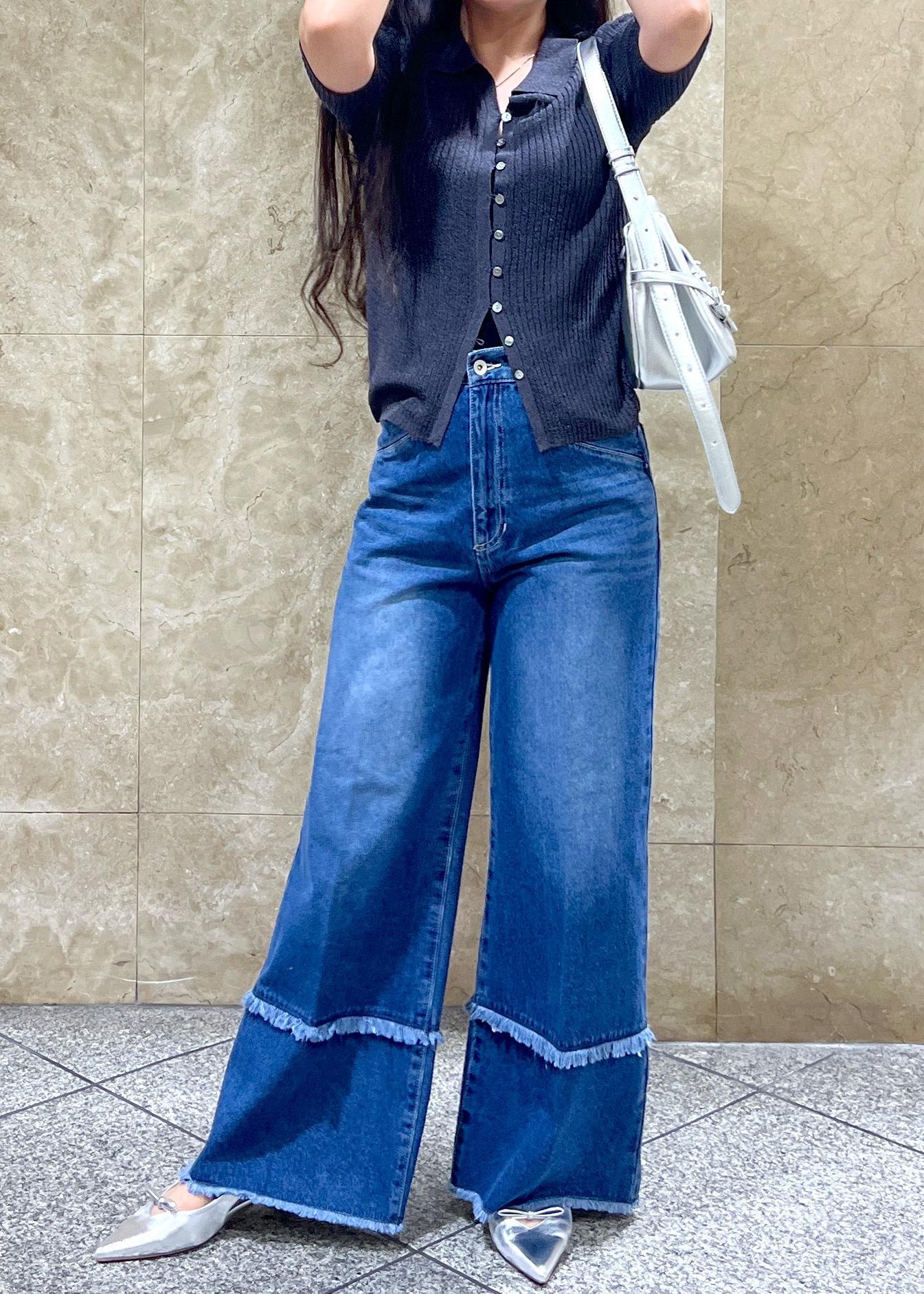 フリンジのデニム、濃いめカラーも可愛いです◎