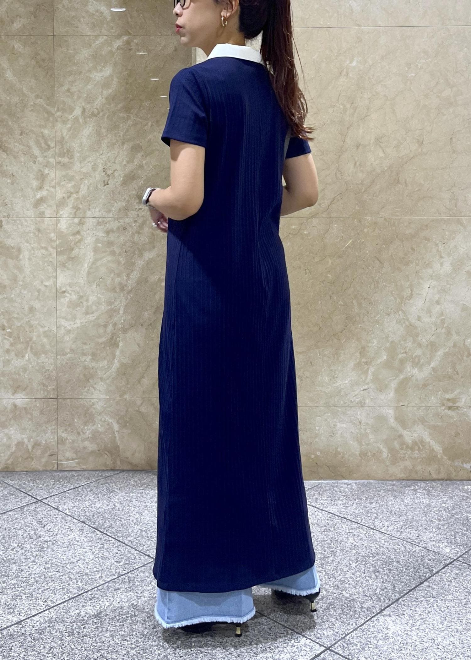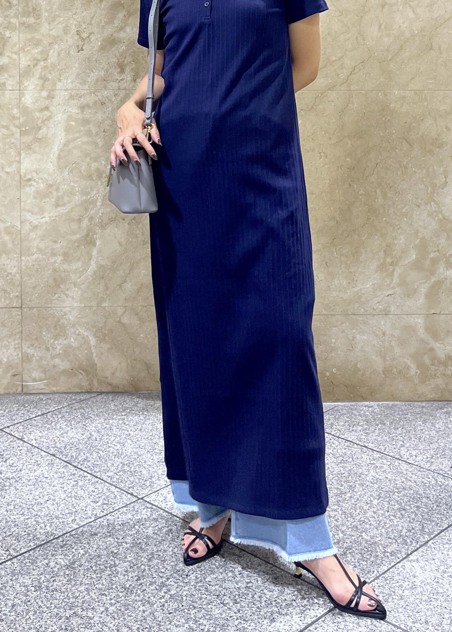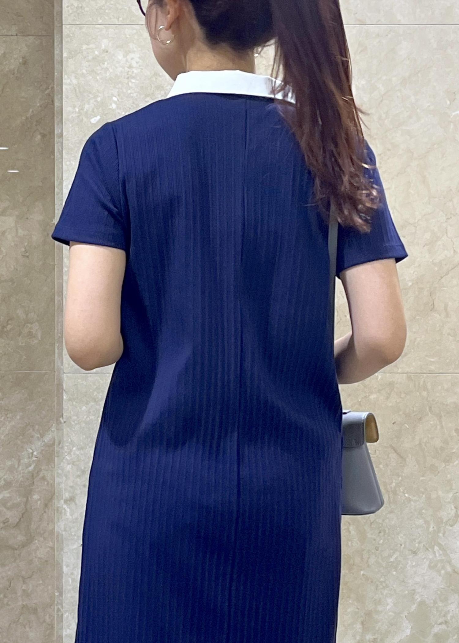 VISポロ衿ランダムリブワンピースネイビー系 / F¥4,612レビュー身長158cm、着丈は足首がすっきりと見えるほど、肩周りや腕周りなどはオーバーすぎず、全体的にコンパクトな印象。
