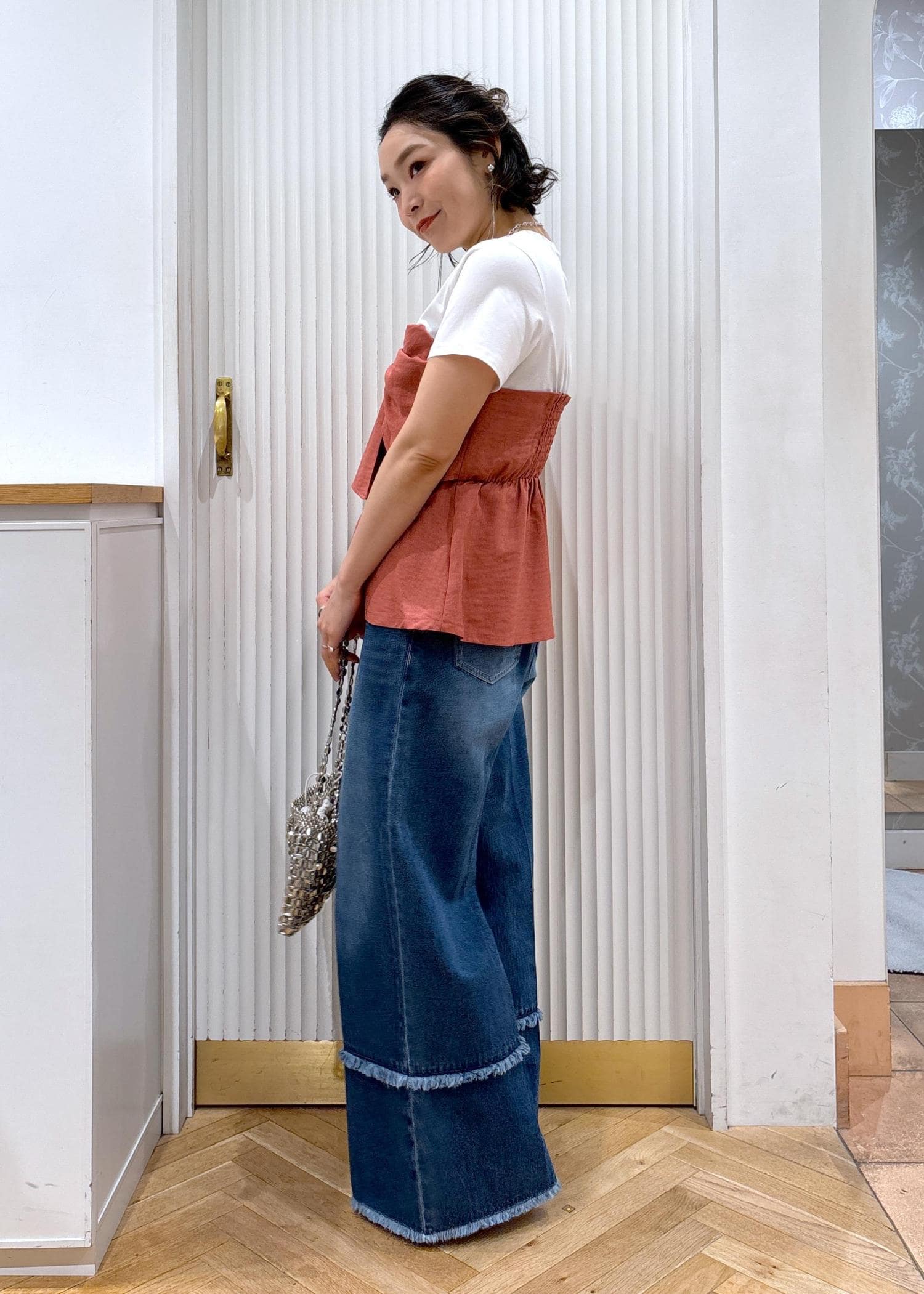 フリンジデザインがポイントのワイドフレアーパンツ。157cmでパンプスを合わせて引き摺らない程度でした。生地がとても柔らかく、軽さがありはきやすかったです。デニム好きな方や沢山デニムをお持ちの方に新鮮な1本!