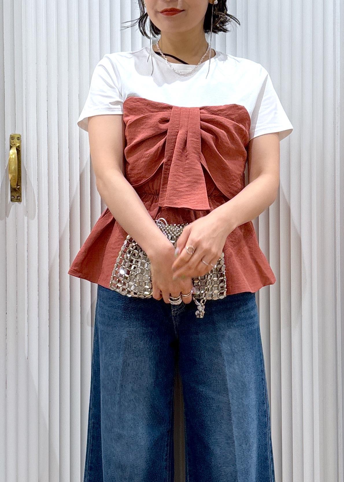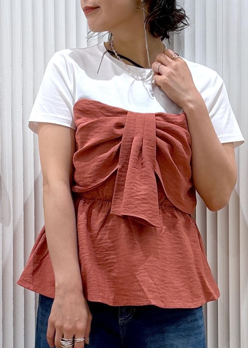 全体的にコンパクトなサイズ感ですが首ぐりはやや広め。肩はパフスリーブのTシャツとのドッキング風トップスです。セットアップでの着用がお勧めですが、単体でもレイヤード風のデザインがおしゃれな雰囲気。